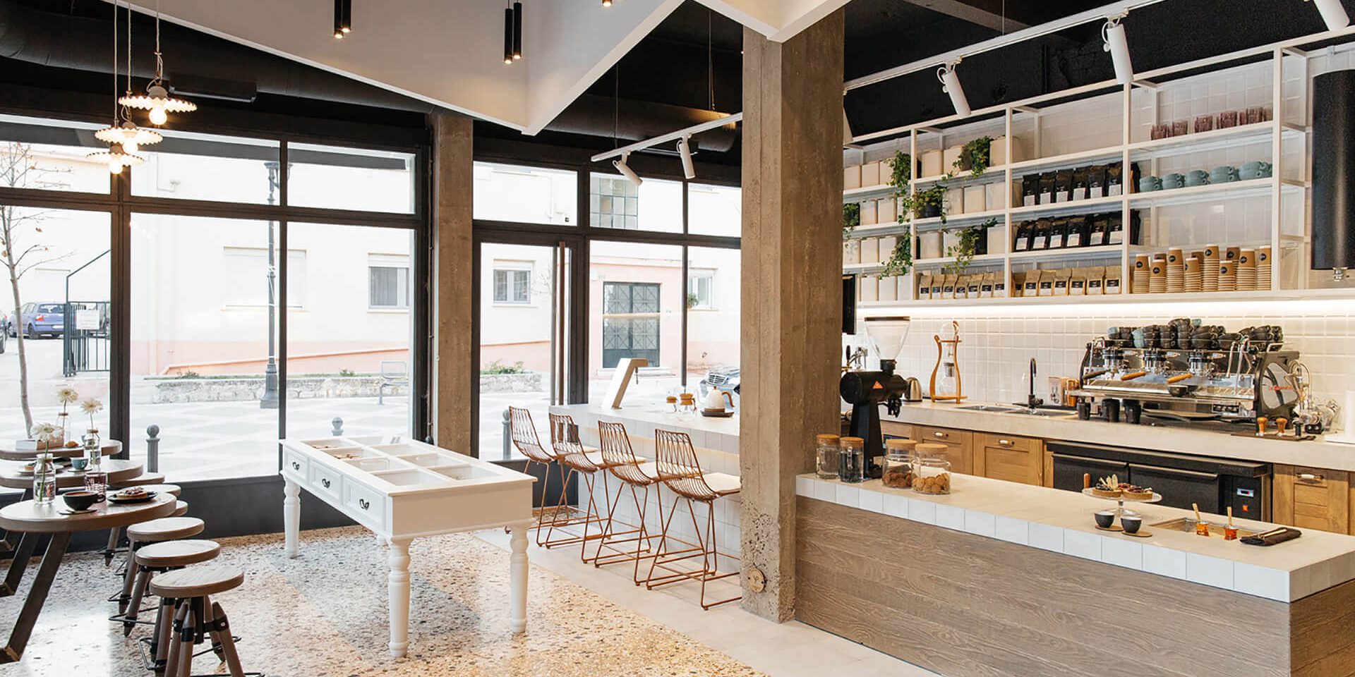 “Κofi” micro-roastery is a speciality coffee shop placed in the centre of Ioannina city, which offers its own coffee blend, roasted in the heart of the shop. The aim was to design a place, which could host and offer all coffee lovers a pleasant experience, at the same unfolding its role as a “lab” which self-produces the coffee it serves. The concept of the design was to combine a rough industrial aesthetic with natural and warm tones.