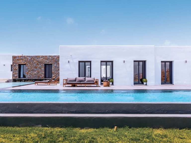 On the southern side of Mykonos, this single-story residence of 200 m² stands out for its clean,…