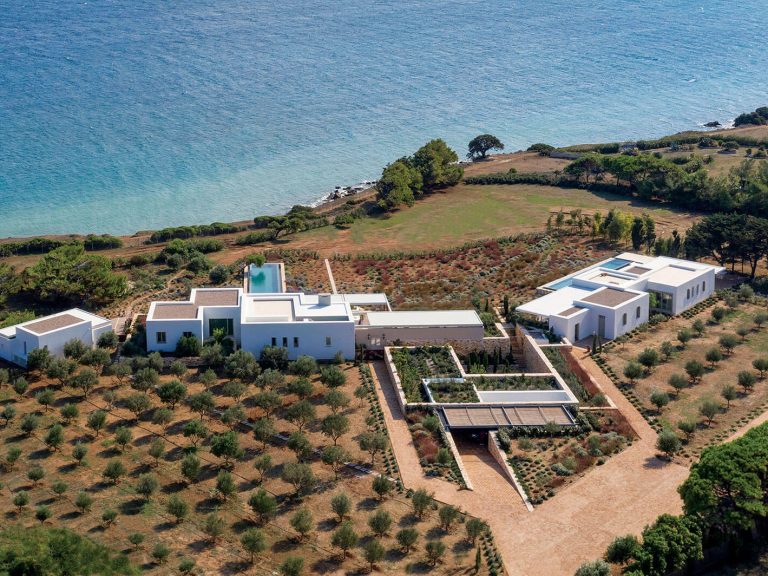 Assembled as a linked series of standalone rooms around a poolside courtyard, the villa touches the…