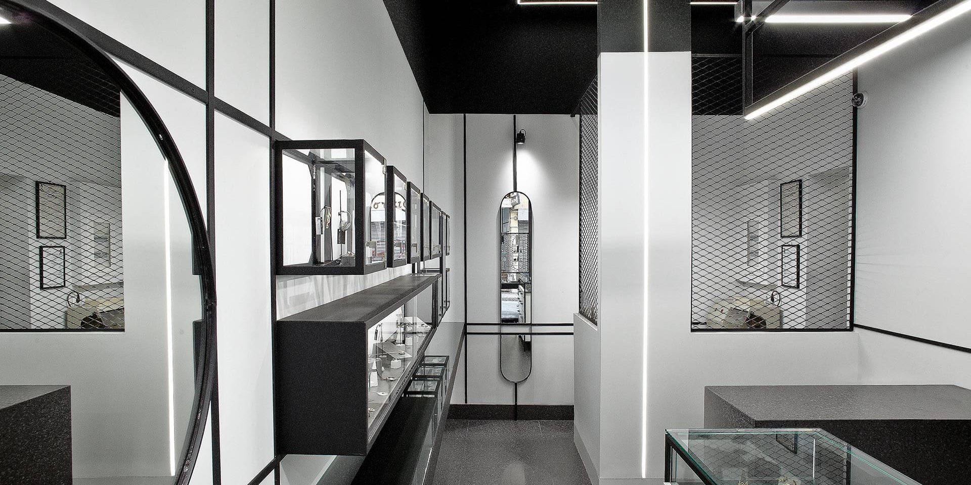 The 25 square meter jewelry store is located in the heart of Ioannina. His work is bounded by some persistent and recurring ideas such as the quality of light, the kin geometrical patterns, the vigorous and fine workmanship, the intricate detailing. These elements were the starting point of the study of this jewelry concept store. Clear metallic stripes -lining the walls- create pure geometric shapes, glass cubic vitrines, rectangle metallic boxes and round mirrors are the main showcases. Round and oval mirrors are placed in a way that creates depth and multiple views through their reflections. All furniture pieces, along with the modern ‘U’ shape chandelier and the mirror with brass framework, were designed especially for the store. The fluorescent strip lighting illuminates the space leading to the jeweler’s studio. The black terrazzo tile is used on the floor and on all monolithic furniture. Every element was carefully considered- the architecture, the light, the materials used, the palette, the furniture pieces are all linked in a harmonious way. The lights are casted absorbed and reflected on the materials during the passage of the day and create a different atmosphere that would be conducted by the main synthetic approach. The main goal was to exceed given architectural typologies and create a concept store that would reflect the multifaceted aspect of the owners’s creations and the ethos of his work.