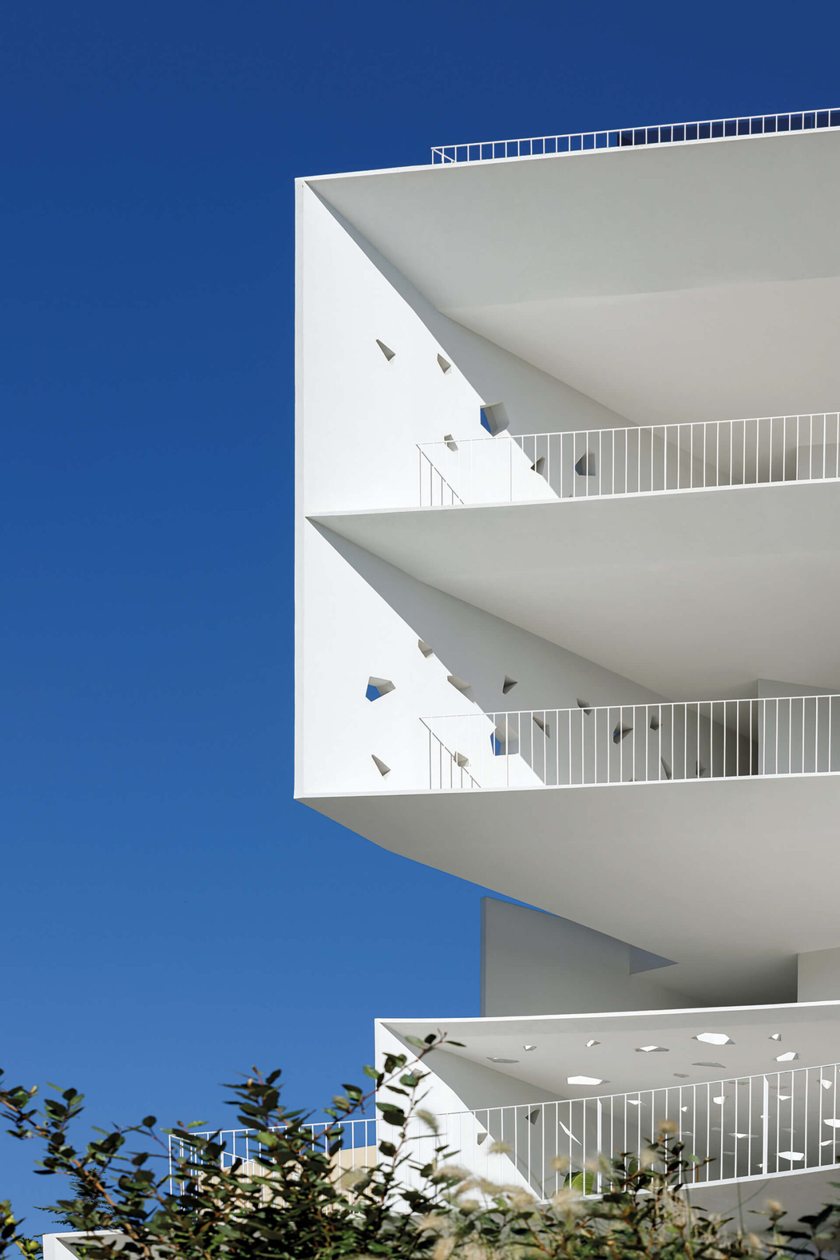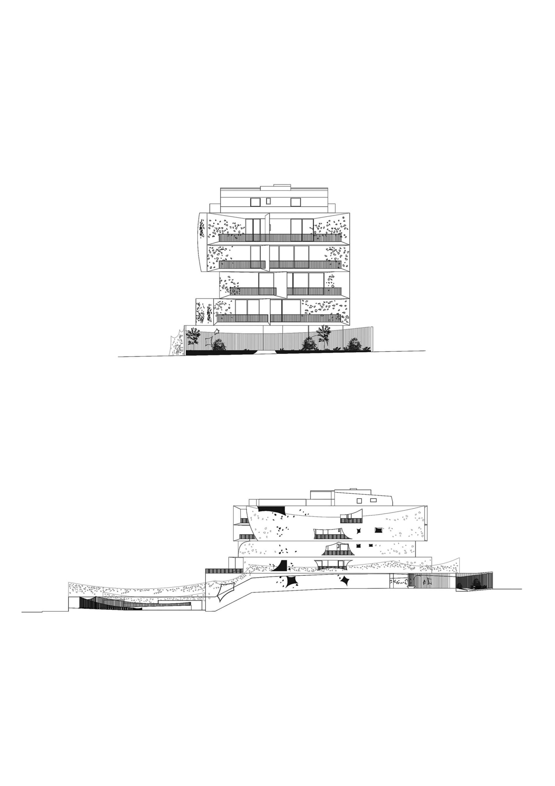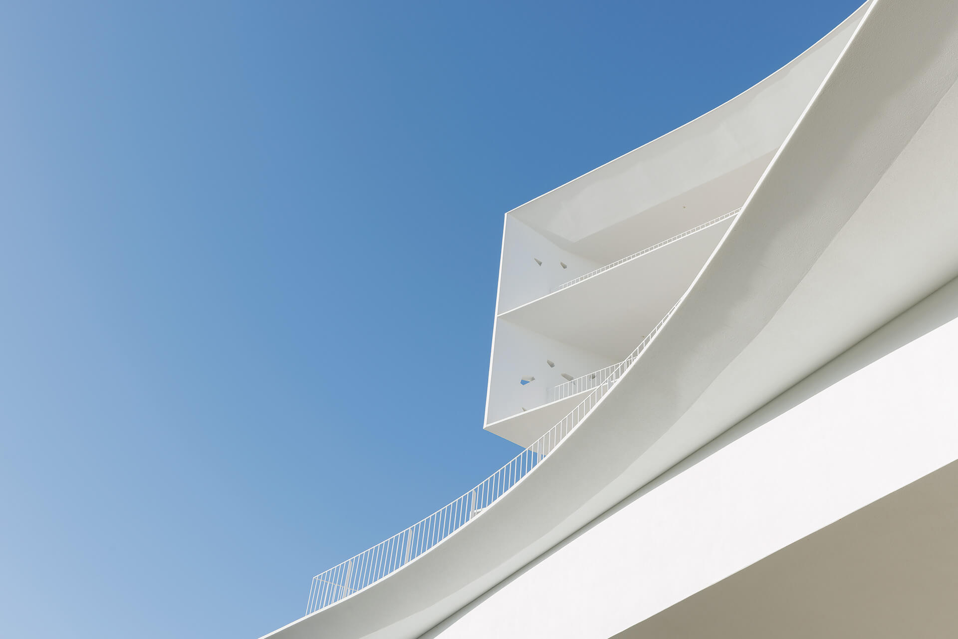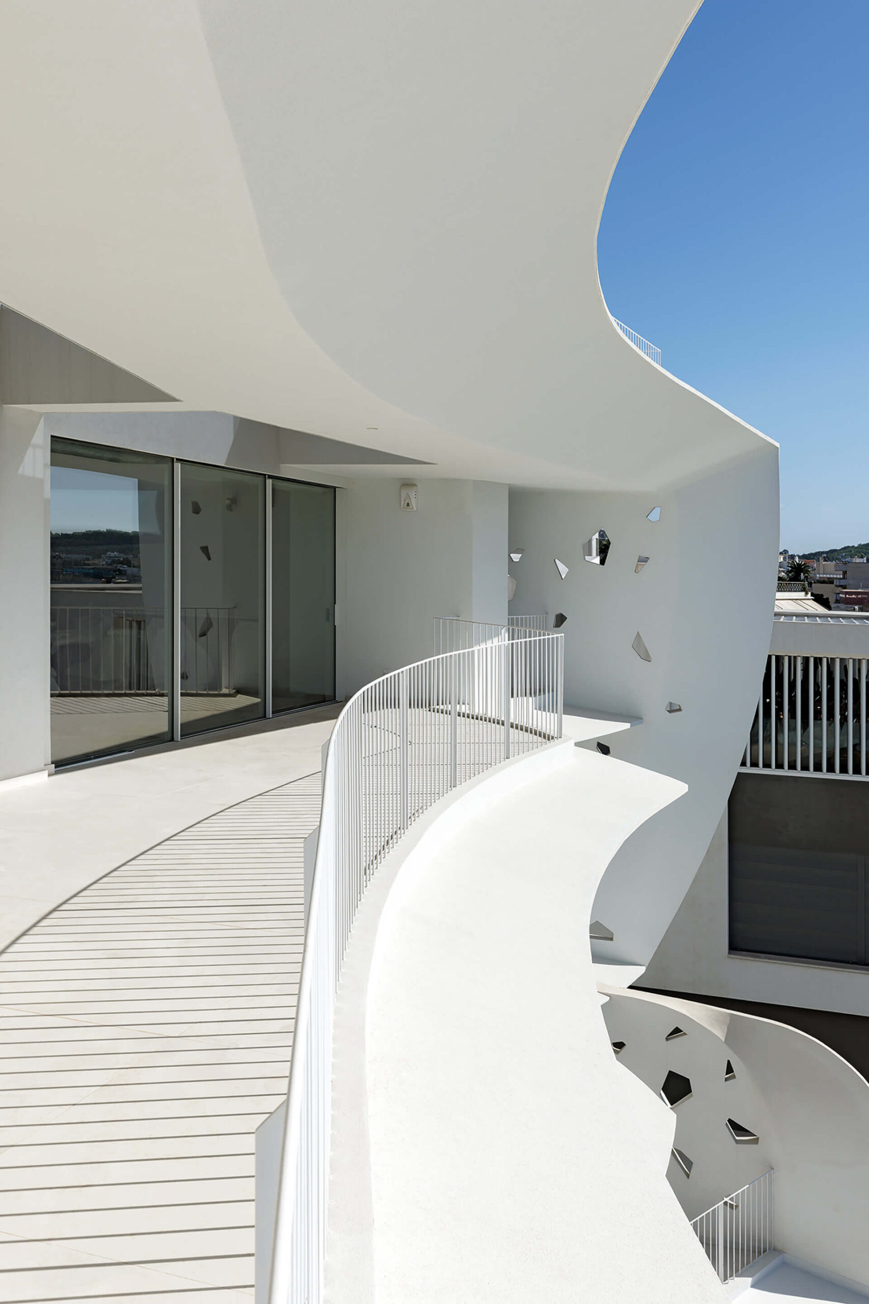 The main idea is to create a double shell that envelops the building, providing the necessary privacy for users. The irregular shape of the plot and the narrow frontage on the adjacent streets, with large sides located at the plot boundaries, determine a need for private spaces while preserving a sense of continuity with the uncovered neighboring areas. The shell is traversed by a sparse perforation, contributing to the natural lighting of the interior of the building while ensuring the necessary privacy where needed. The perforations are clad with robust semi-transparent glass elements that create interesting reflections inside. The curved slabs, with their slight rotation, give the impression of a not-so-compact volume, offering intriguing shadows and different visual perspectives from the balconies.
