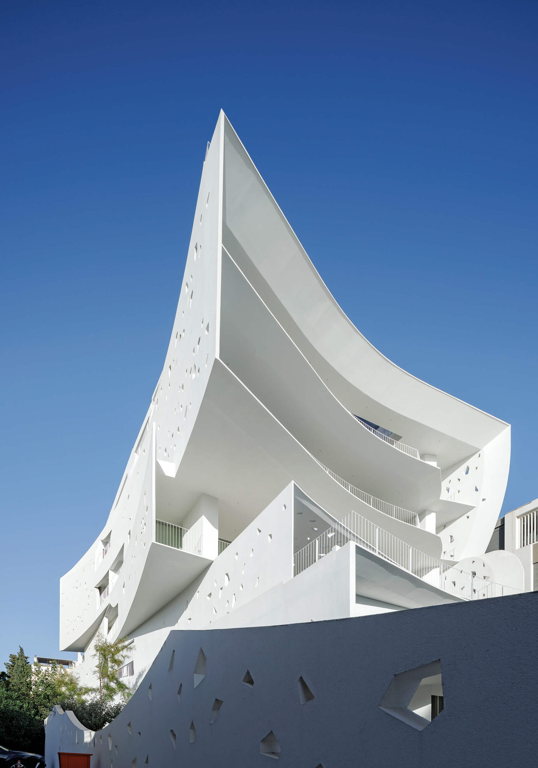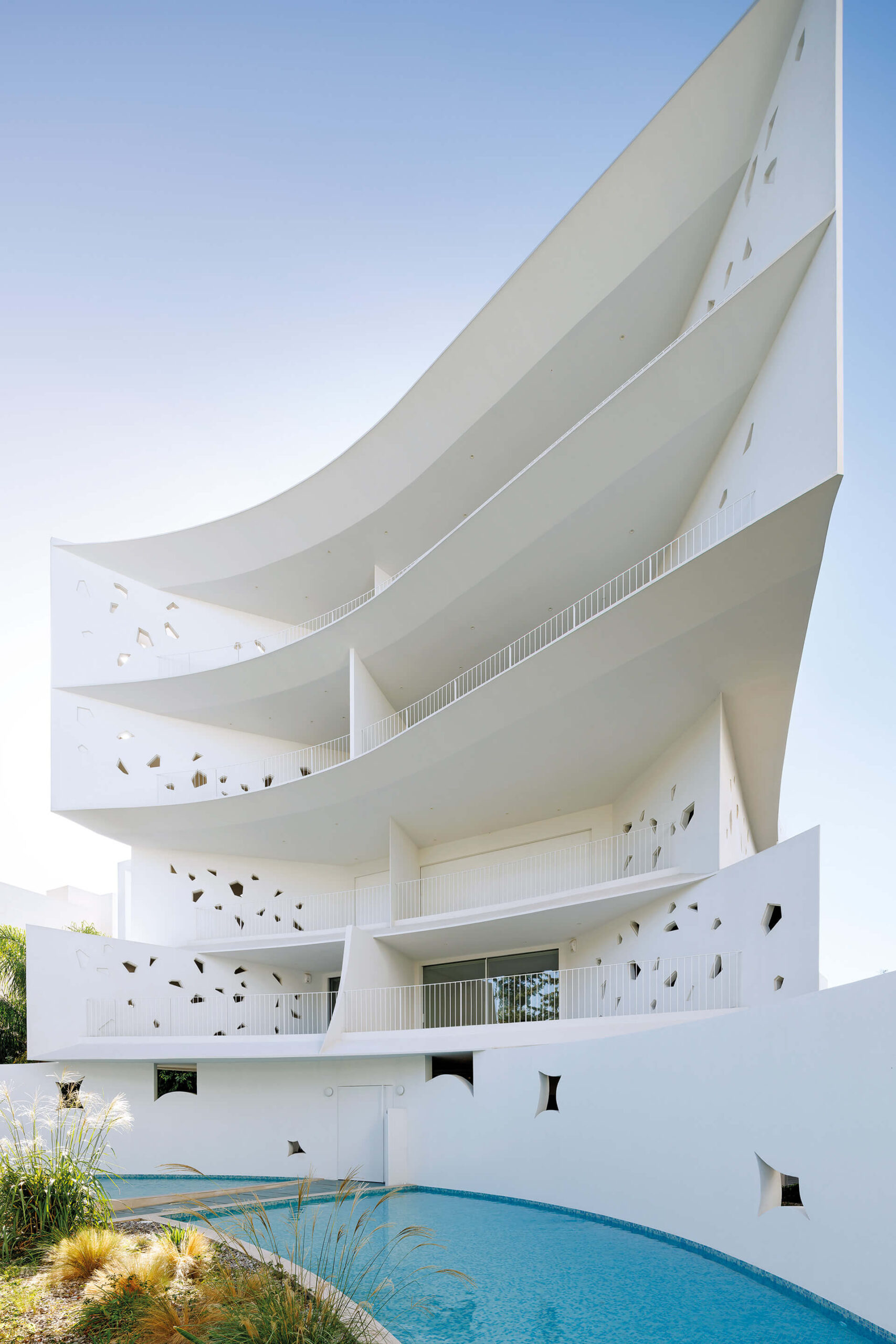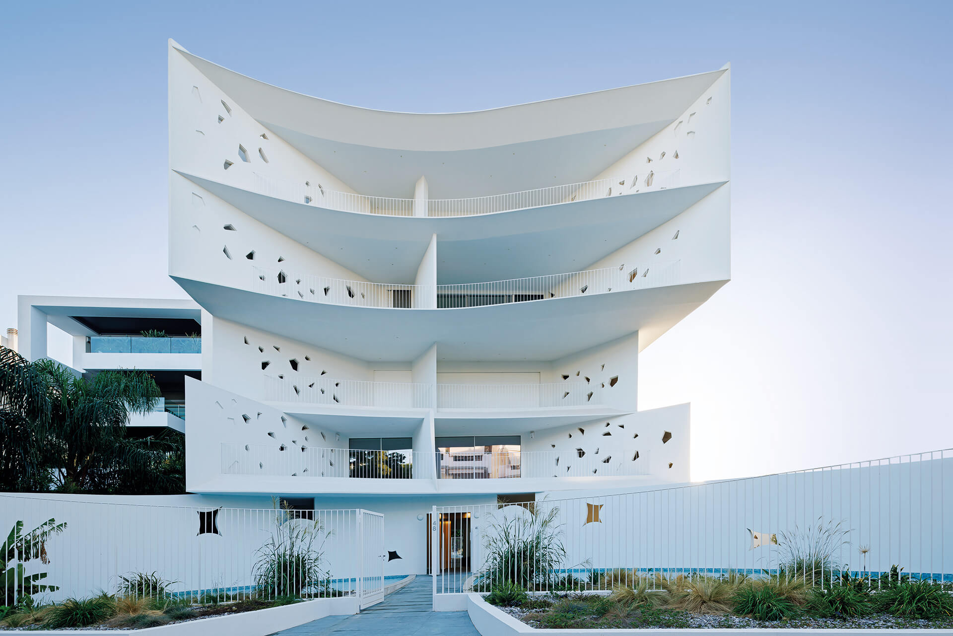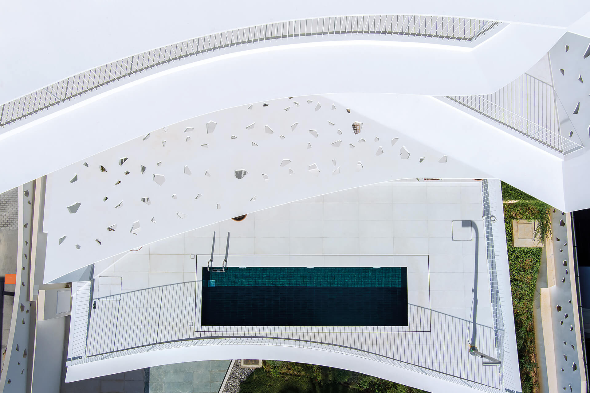 The main idea is to create a double shell that envelops the building, providing the necessary privacy for users. The irregular shape of the plot and the narrow frontage on the adjacent streets, with large sides located at the plot boundaries, determine a need for private spaces while preserving a sense of continuity with the uncovered neighboring areas. The shell is traversed by a sparse perforation, contributing to the natural lighting of the interior of the building while ensuring the necessary privacy where needed. The perforations are clad with robust semi-transparent glass elements that create interesting reflections inside. The curved slabs, with their slight rotation, give the impression of a not-so-compact volume, offering intriguing shadows and different visual perspectives from the balconies.