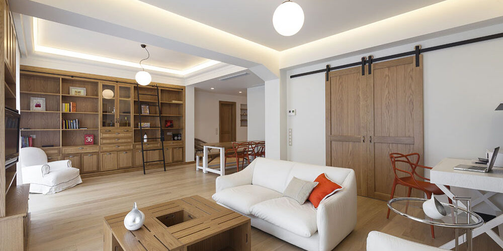 Simplicity and clarity in the design, combined with the creation of a style with references on elements past, but contemporarily rephrased, were the main compositional characteristics of the central architectural idea. The apartment in Nikis Avenue, a typical specimen of Thessaloniki’s urban residences, with long and narrow corridors and thorough compartmentalisation was redesigned to serve the needs of its users. Several morphological and functional elements were preserved, reminding of its age, like the separation between living and private zones, or the typical arches on corridors. The unified sitting and dining space is placed by the main façade, highlighting the views to the sea and the apartment’s relation to it. The bedrooms, clearly separated from the communal areas, are placed at the rear zone, ensuring the necessary privacy. In the core of the two zones, a walk-in wardrobe acts as a separating element while directing the circulation between them. The use of a neutral colour palette, wood and refined metal elements adds hints of timelessness to the sense of the familiar. The bespoke constructions provide the users with comfort and a crafted functionality.