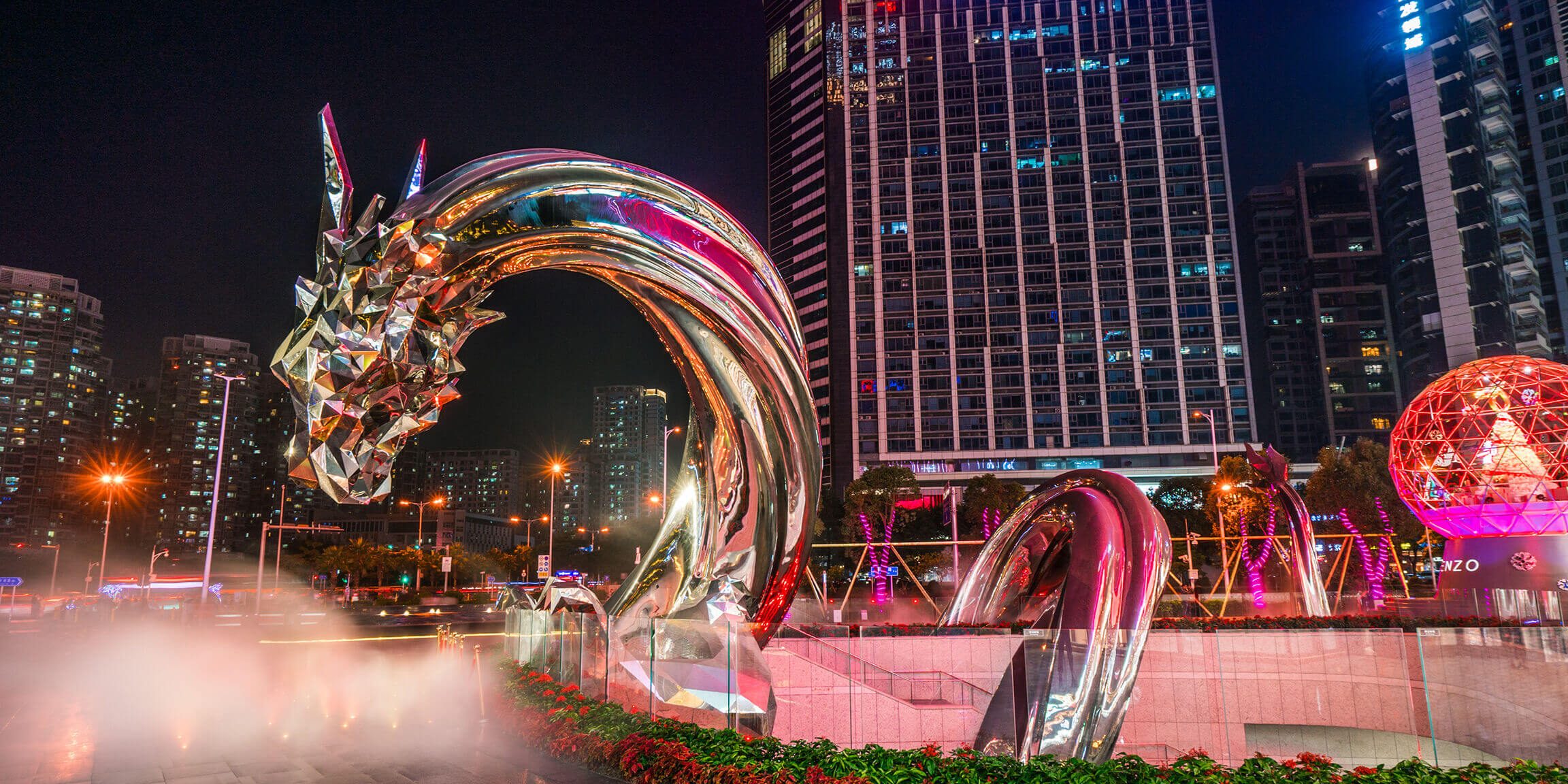 UAP studio collaborated with the artist, shortly before his untimely passing in October 2017, on the development, fabrication and installation of this landmark project. The complex fabrication required multiple treatments to the material, with the body made from panel beaten mirror polished stainless steel, and the faceted head, claws and tail made from welded mirror polished stainless steel.