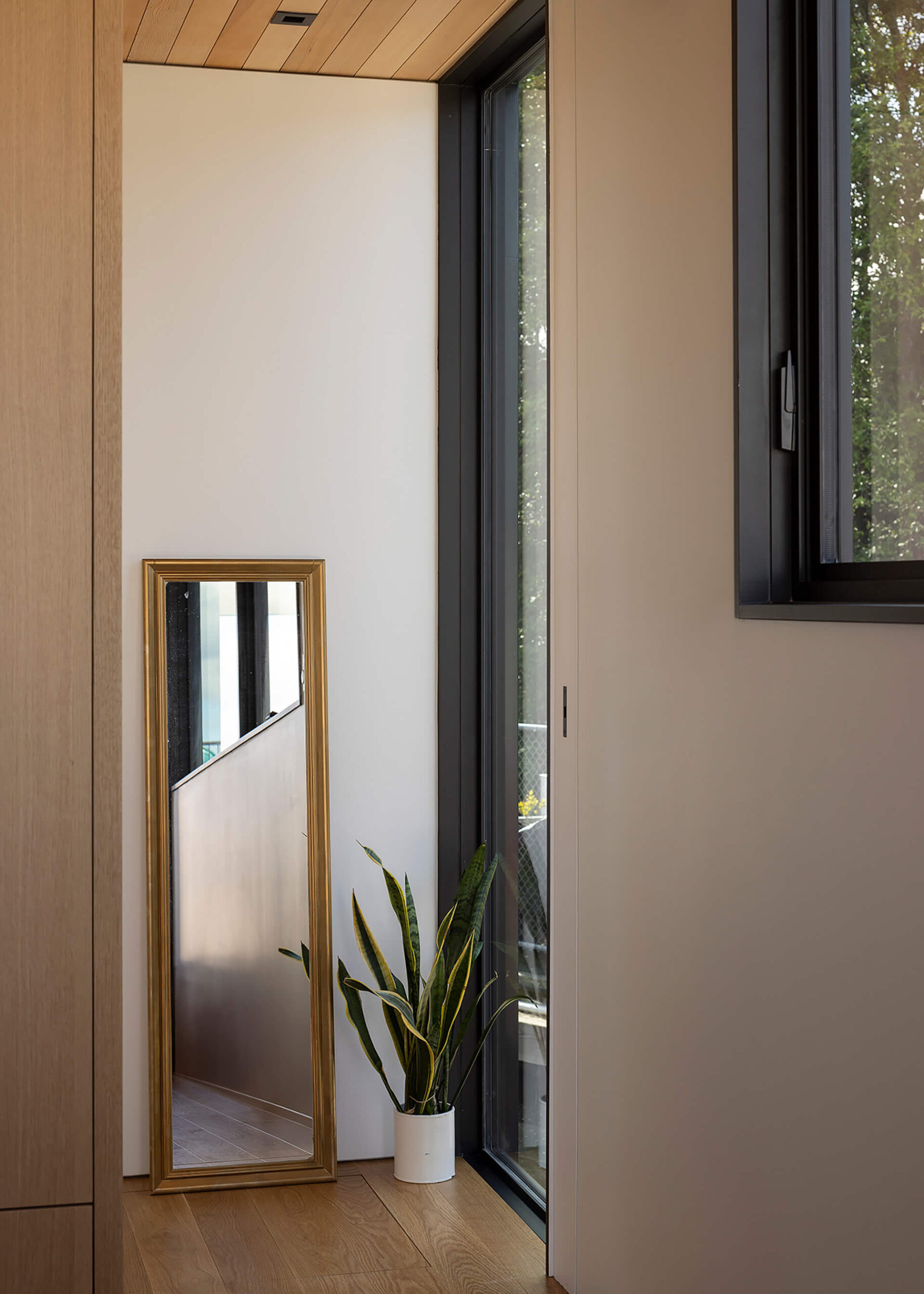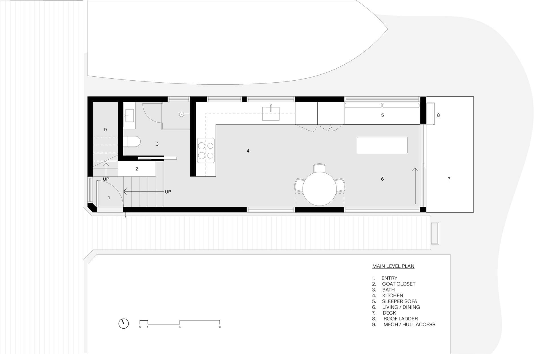 The lower deck accommodates bedrooms and private areas, while the upper deck features a light-filled living room, kitchen, and dining space. An exterior stair leads to a rooftop deck, maximizing outdoor living and providing panoramic views across Lake Union. The layout balances compactness with openness, using efficient planning strategies to ensure comfort within a small footprint.