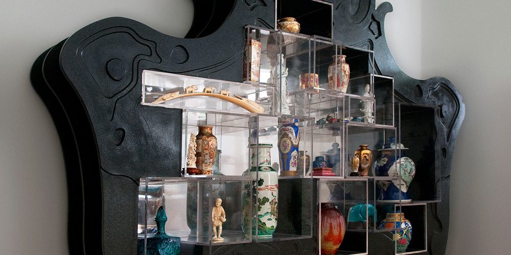A case of dreams interrupted by a sudden intrusion of the lustrous present; Nostalgia is split by the “gloss” and the “line of beauty of broken”. The cabinet of wonders is a material testament of an aggressive moment of encounter. The result: no transition – just clash. The granite cabinet tells the story of the rocaille and its opponent, the grid. This conflict produces a moment of dynamism, reflecting reality: “The old cases the new and the new breaks through” It all happened in black granite, perspex and mirror. www.eleftherios-art.com