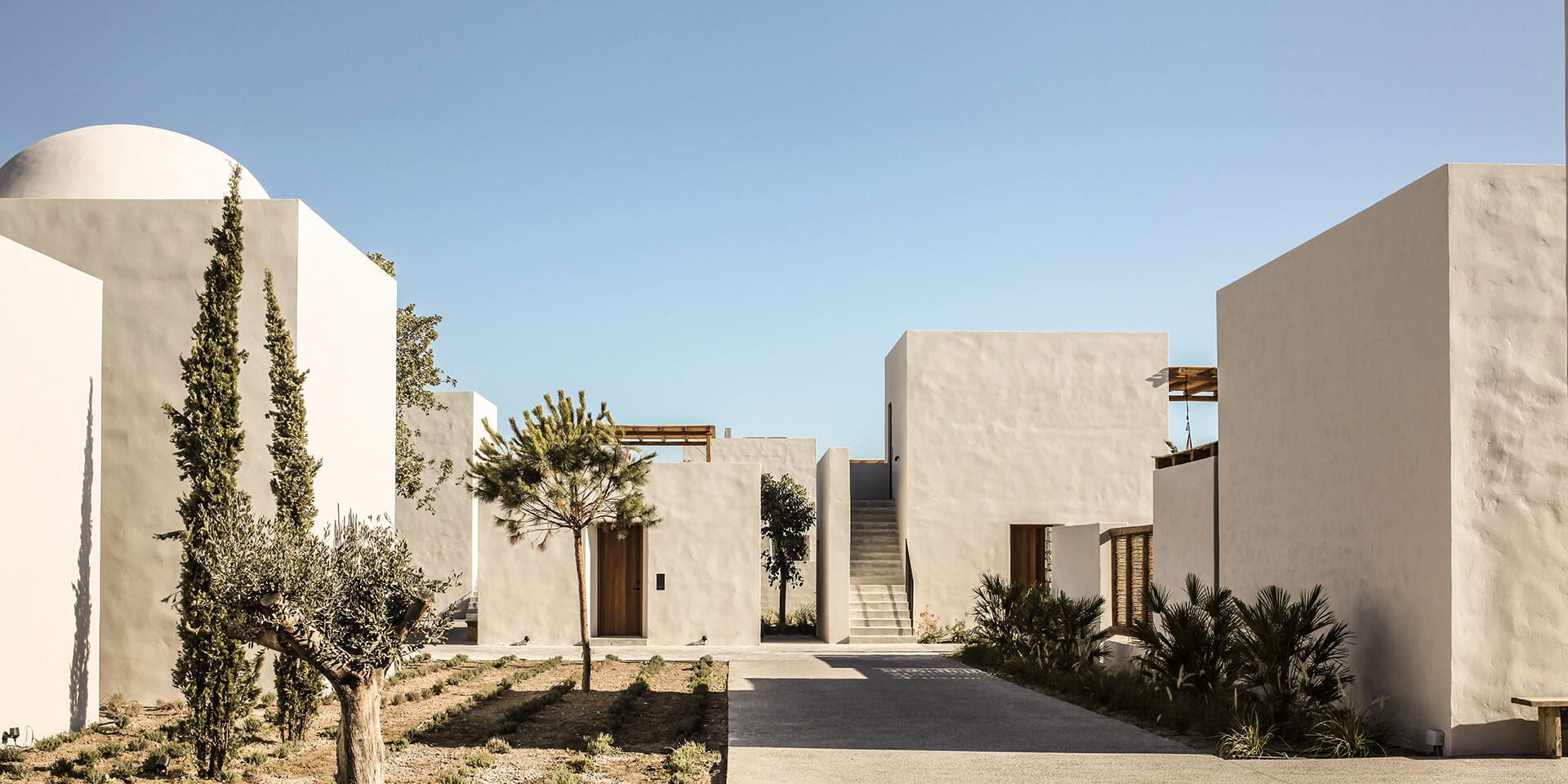 There are three types of rooms. Double rooms, allocated in ground floor and small two storey buildings; small houses with sitting areas, developed in clusters of two to three units with a communal swimming pool in an enclosed courtyard; and lastly, larger one or two bedroom houses with private pools and patios. The buildings are situated in three zones, according to their typology, reminiscent of island urban settlements, with narrow streets, unexpected openings – positions, external stairs and built-in outdoor sitting areas.