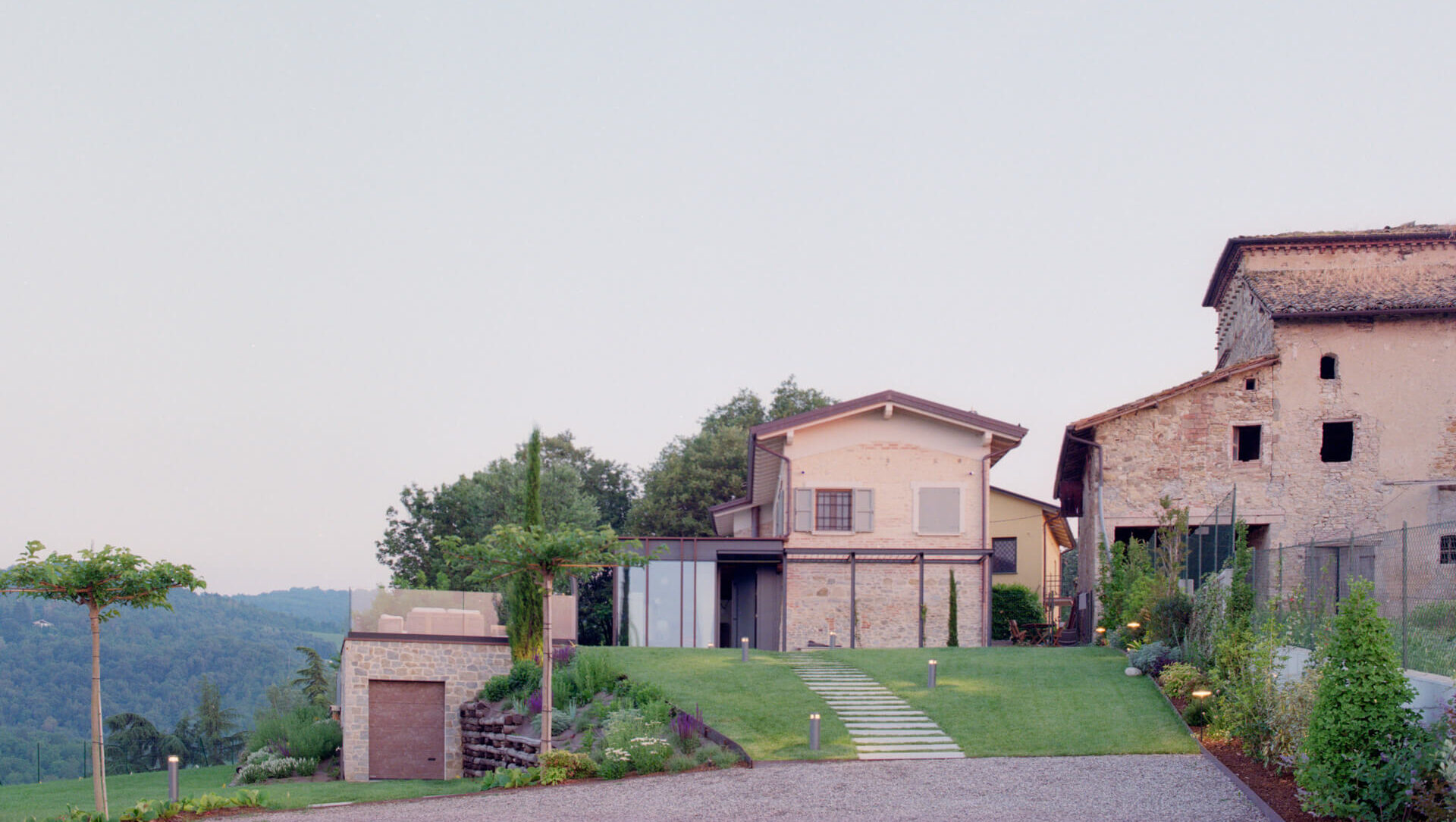 The project involves the renovation and extension of a farmhouse set within a courtyard on the crest of the hills in the Piedmont area of the Reggio Emilia Apennines. The original stone building, dating back to the early 1900s, had undergone several interventions over time, including structural consolidation works that introduced reinforced concrete terraces on the valley-facing sides, as well as more recent upgrades such as the refurbishment of the roof and the addition of a concrete-and-wood portico on the eastern elevation.