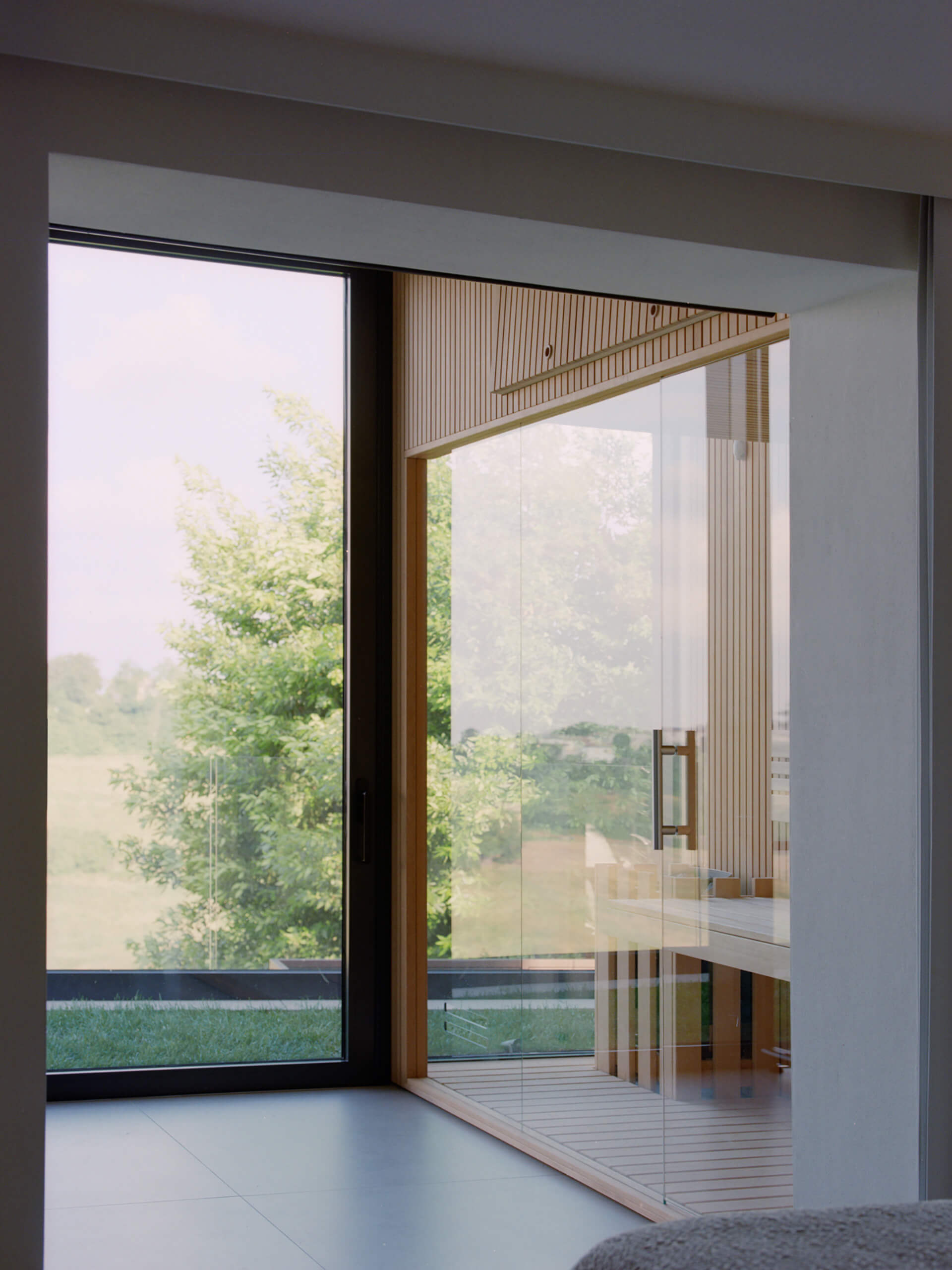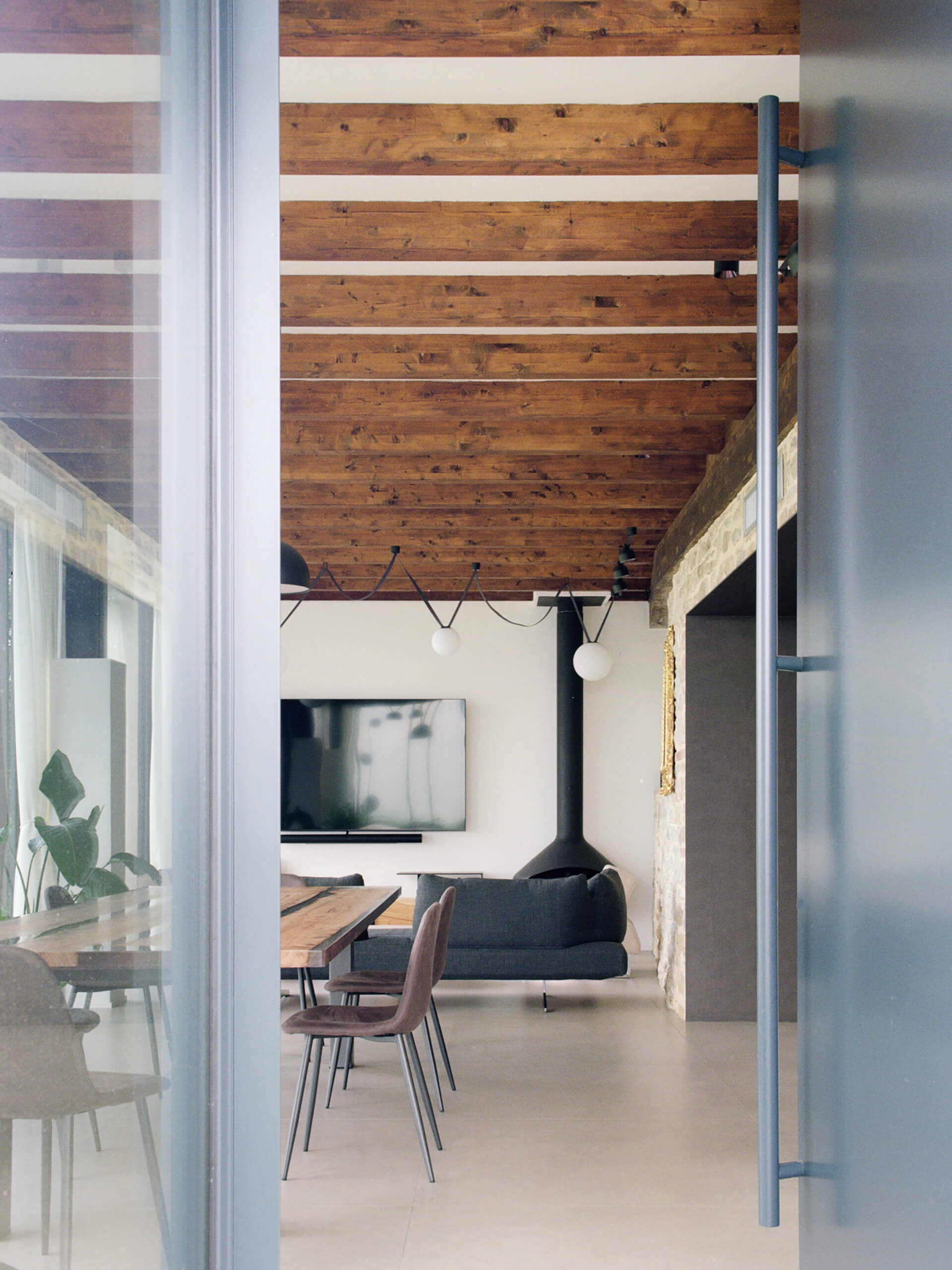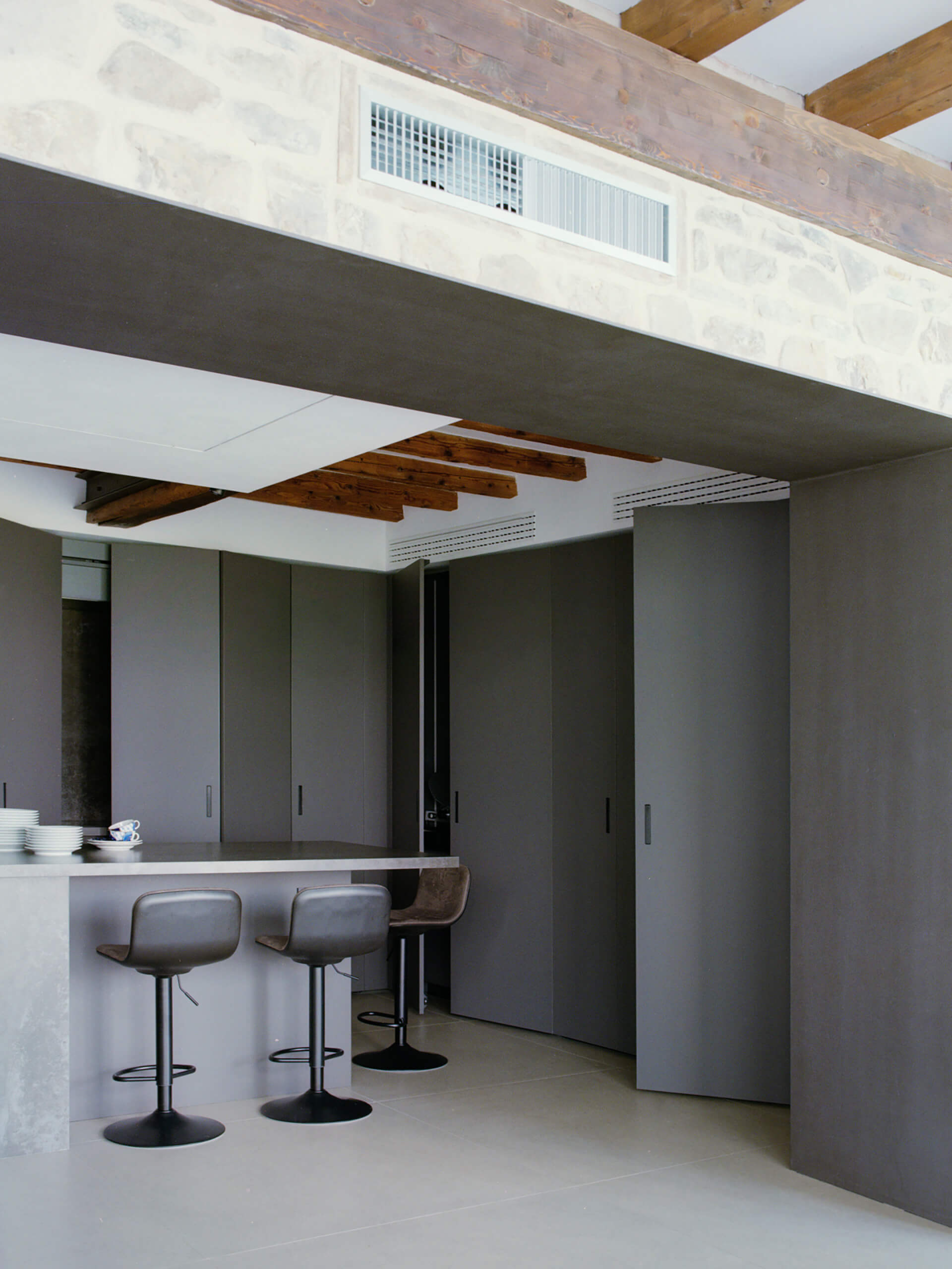 This new volume was enclosed with continuous glazing, articulated by staggered aluminum pilasters with a Corten finish, while the original stone wall was deliberately left exposed within the interior. The former living area was repurposed as a kitchen and connected to the new living space through a large sheet-metal-clad portal, created by reworking the existing wall openings. A similar intervention was carried out in the bedroom, where a new opening in the stone wall leads directly to the wellness area, which includes a sauna.
