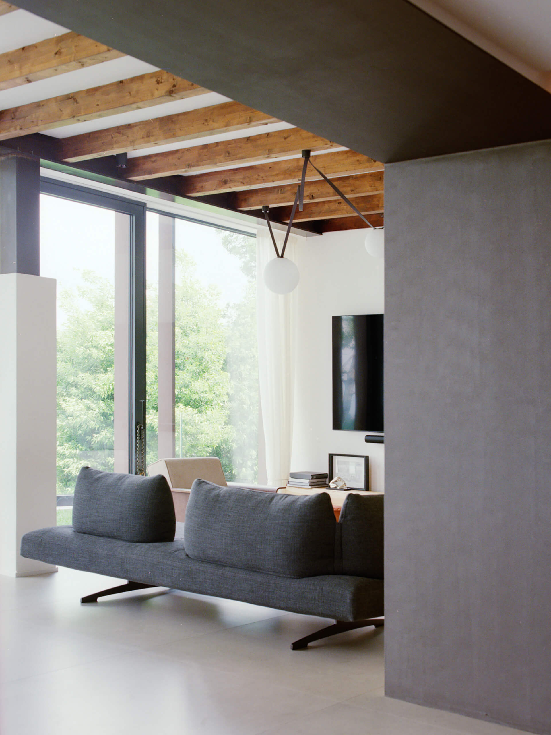 The reconfiguration of the living spaces began with the transformation of the existing sloped portico, which was converted into a new volume accommodating a living and dining area, along with a wellness extension connected to the ground-floor bedroom. The original wooden and tiled roof was removed, while the concrete pillars were retained. A new metal structure was introduced to support a flat roof slab, reusing the original wooden beams of the portico.