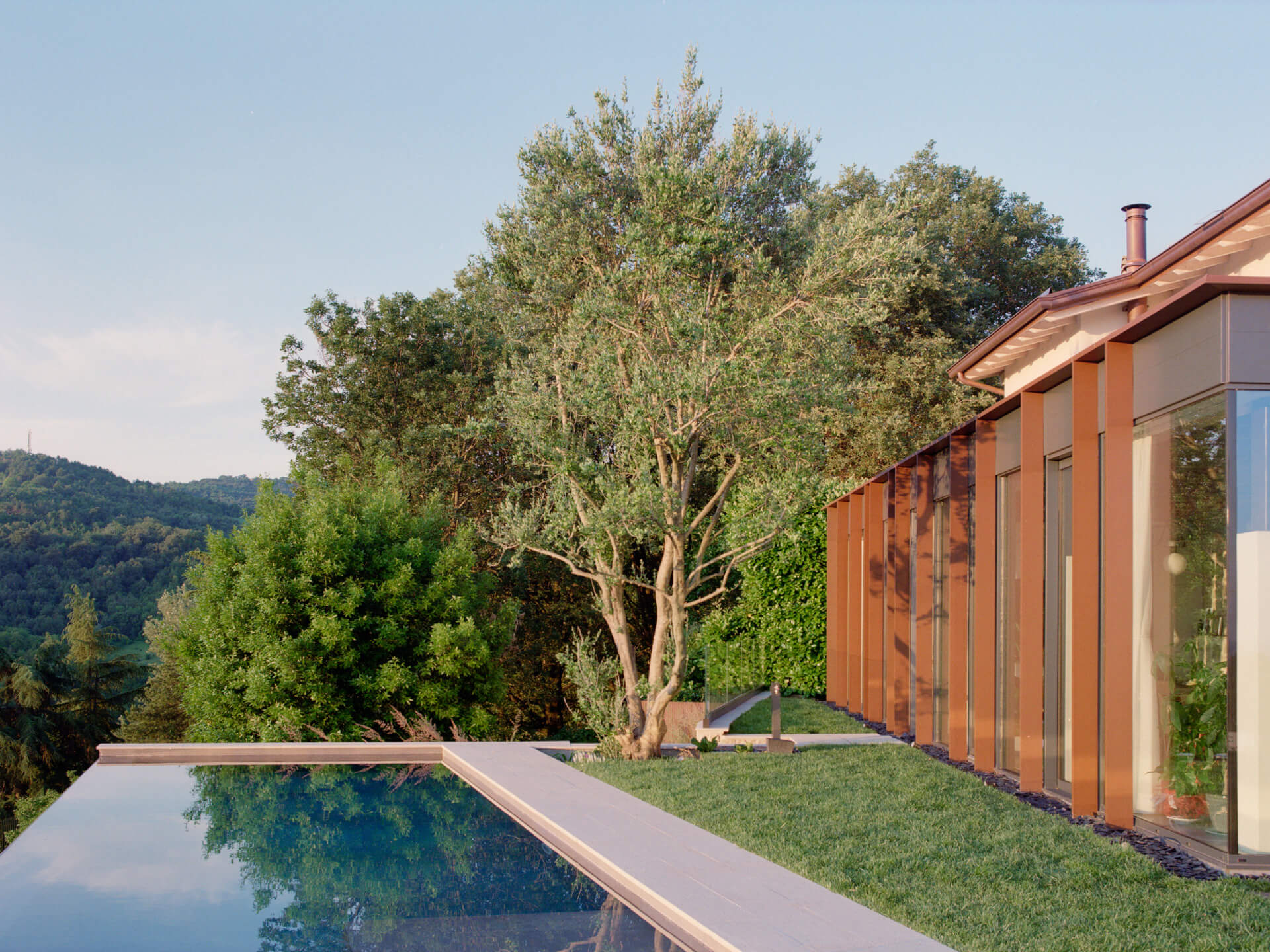 Externally, the existing terraces were redefined through the introduction of an infinity pool projecting toward the ridge, with a basement level beneath it housing technical systems and storage spaces. The terracing system was further expanded through the use of reinforced and gabion-retained earthworks, creating new landscaped areas designed for outdoor use.