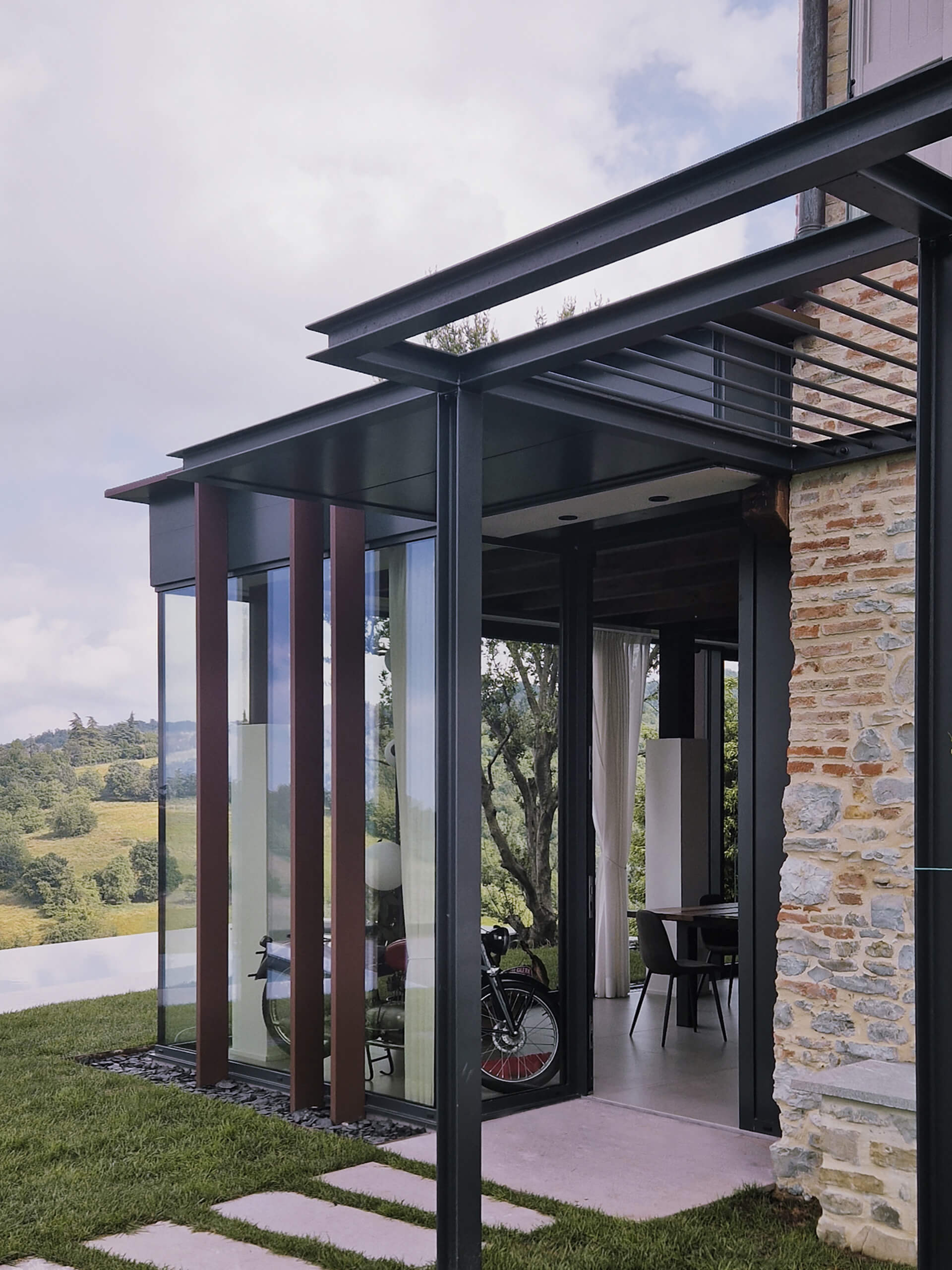 The new main façade is marked by an entrance structure consisting of a metal pergola, partially covering the main doorway and designed to support climbing vegetation, reinforcing the dialogue between architecture and landscape.