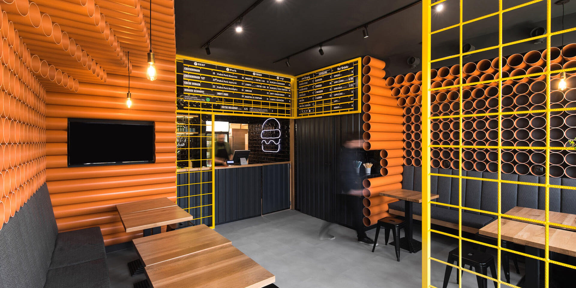The interior was filled with materials which came straight from a building supplies warehouse. About 300 PVC pipes covered the walls and ceilings, and their dynamic composition with yellow mesh panels became a trademark of Chichi 4U. Mesh panels around the counter helped with presenting the menu, and a big neon burger sign became a new addition to the brand. The interior was complemented with dark corrugated metal sheet, wood accessories and black tiles in the bar area.
