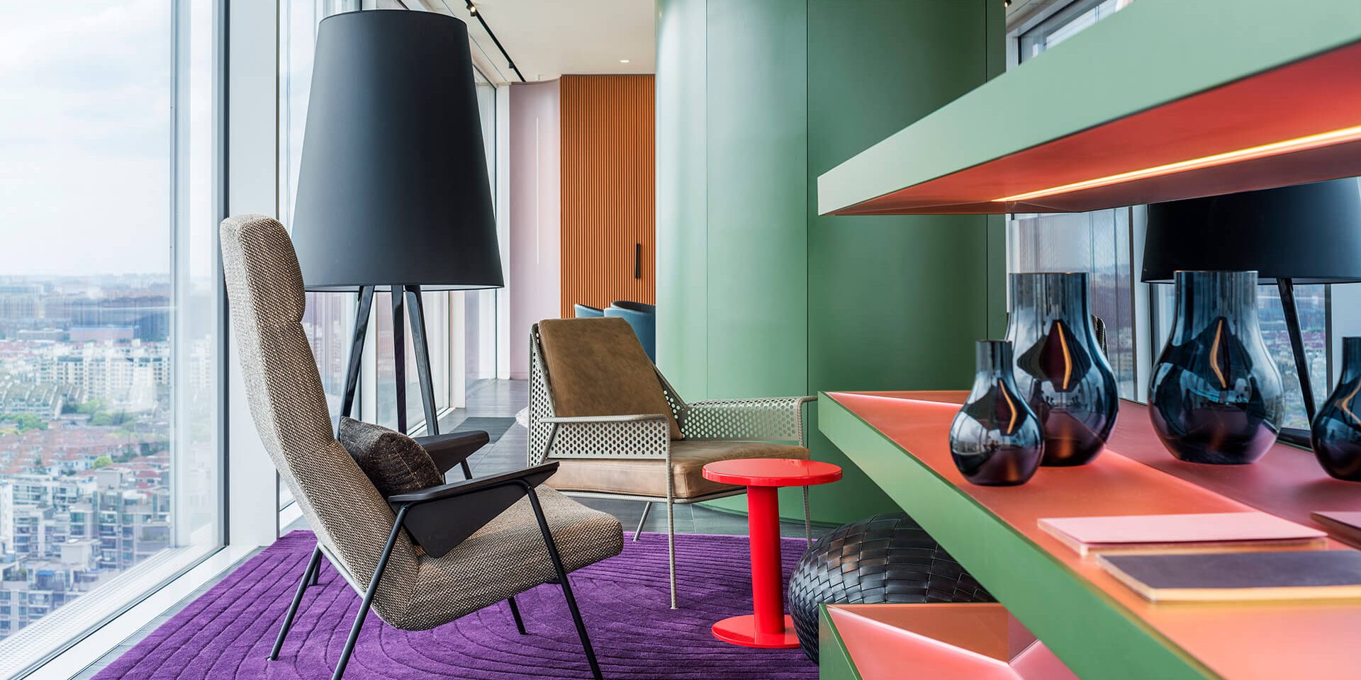 The breath-taking views of the metropolis dominate the sitting area. A ceiling recess in yellow nuances zones the space and enhances the effect of a fluent transition to the exterior, while a textured deep blue wall provides a striking high contrast. Carefully matched colour schemes and exciting contrasts recur in the bedrooms, where curved walls and a masterful mix of materials create a premium and cosy atmosphere. Arranged along the façade, the bathrooms with floor-to-ceiling glazing offer views of the city, reflecting its colours indoors with metallic mosaic tiles. Lastly, the bedrooms’ spacious balconies also provide fantastic views of the Chinese megapolis.