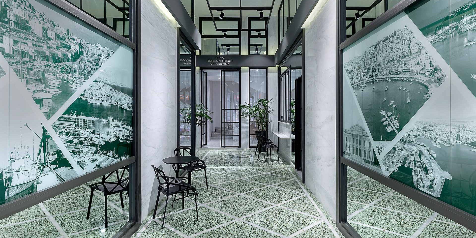 The old mosaic flooring was kept as a connecting element between the past and the present of the arcade, since this type of flooring is met in most of the old arcades in Athens and Piraeus. The diagonal stripes of the flooring extend on the walls through the sculptural composition, as well as the pictures composition that depict the past and the present of the city and port of Piraeus.