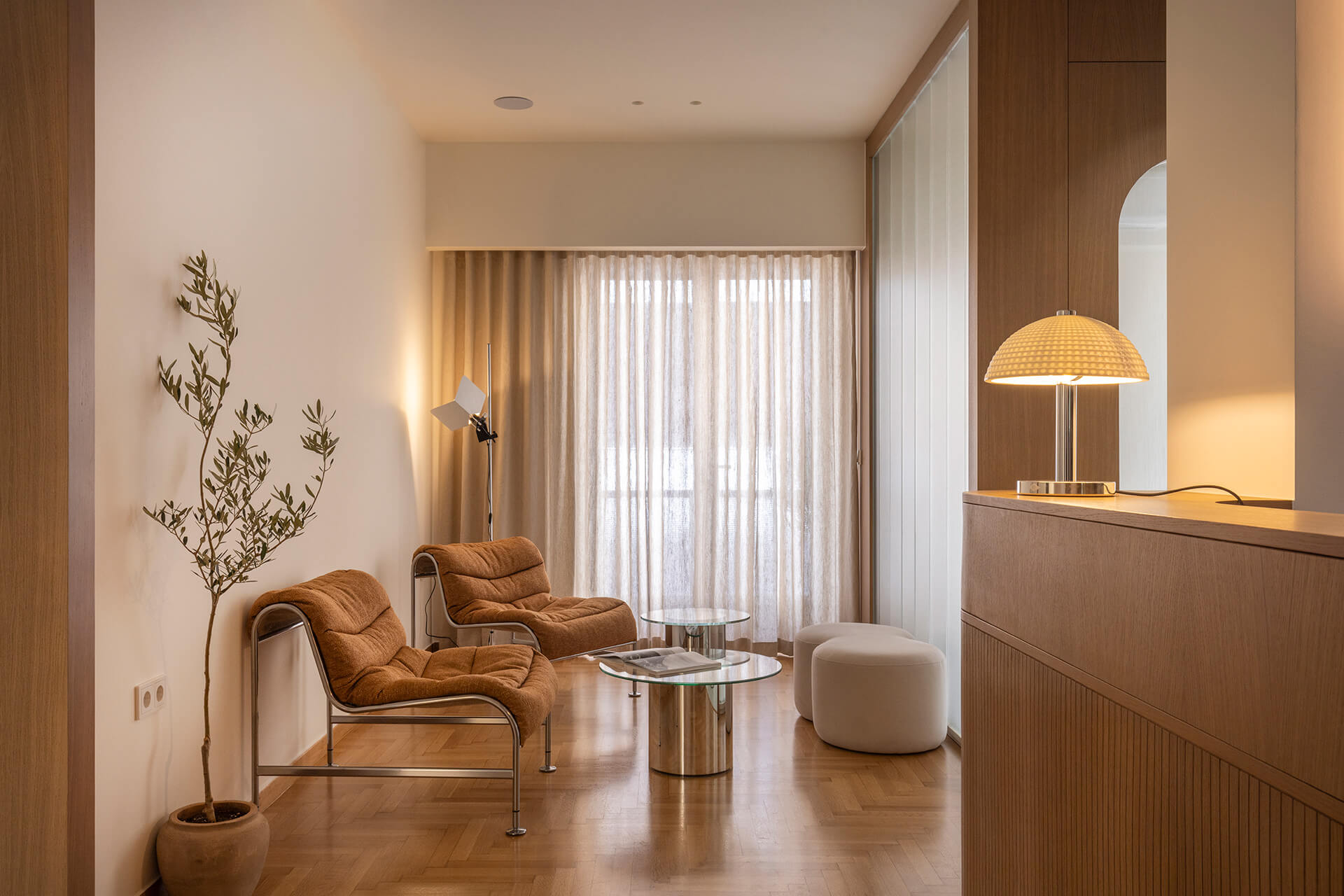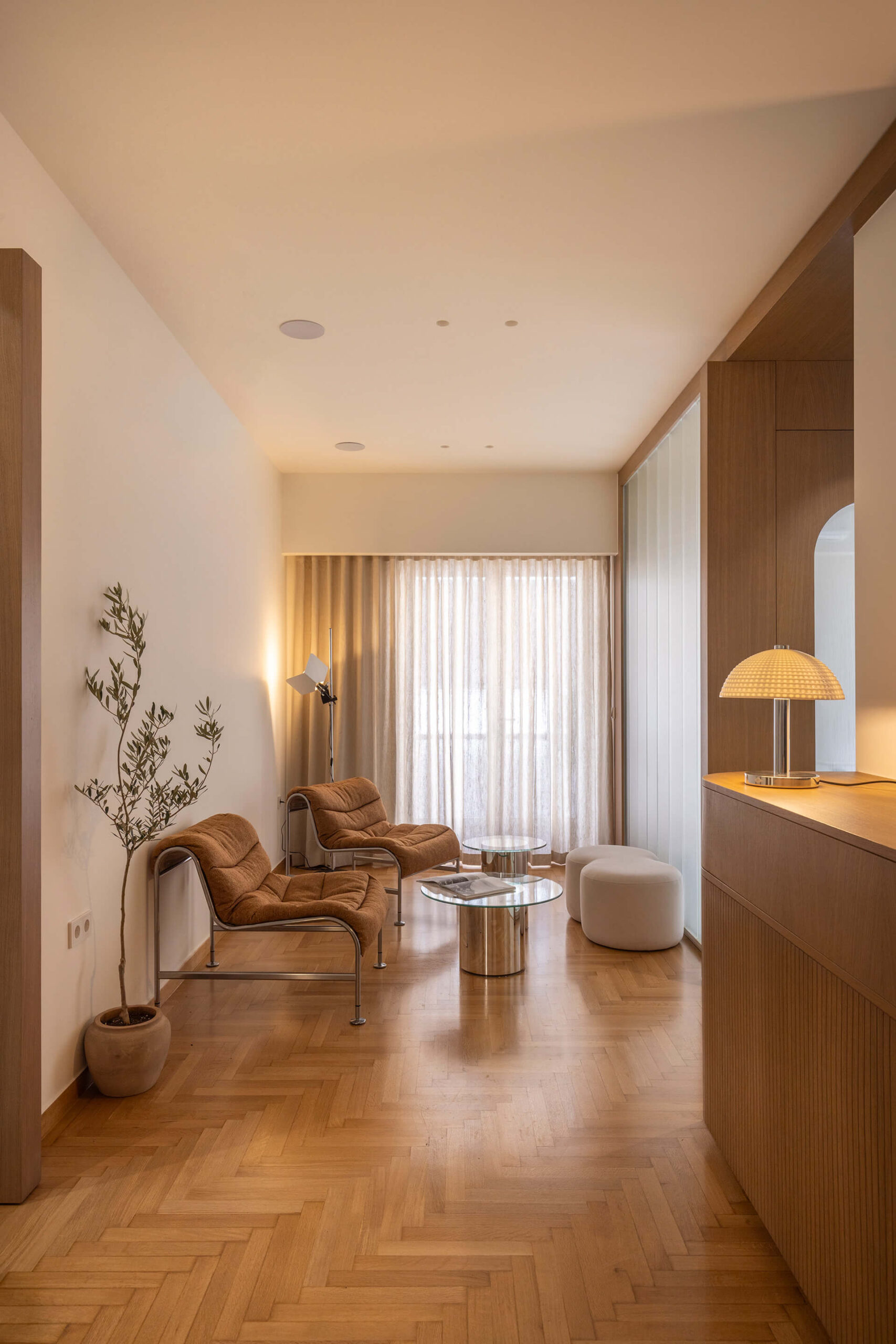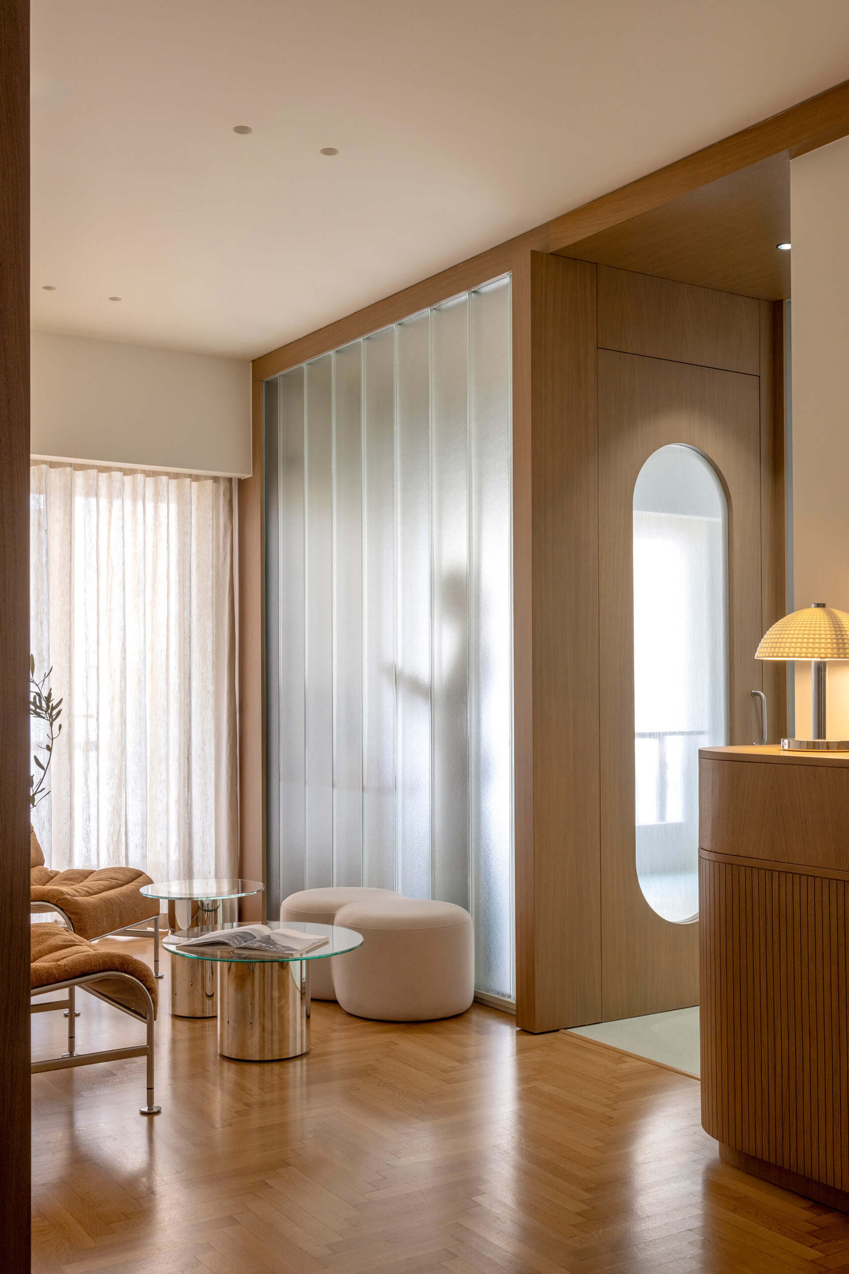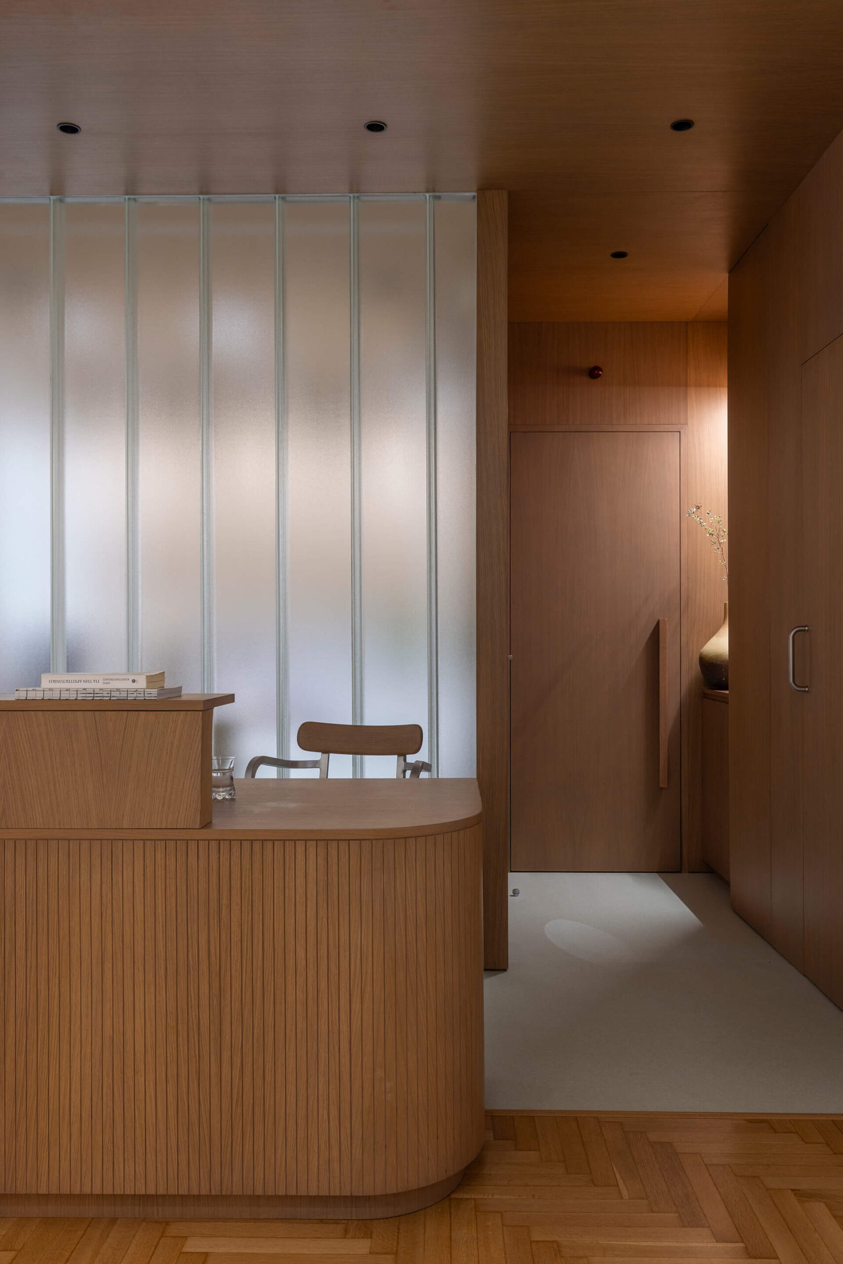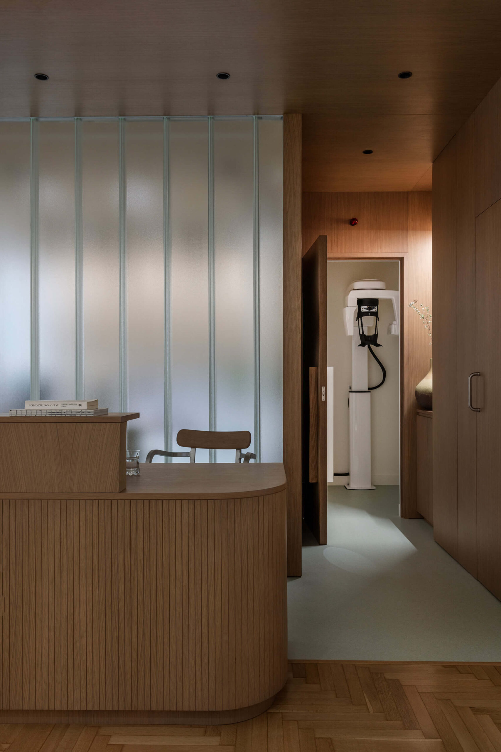 Housed in a 1960s apartment building near the port, the 110 m² residence is transformed into a multi-dental clinic for three dentists and their staff. The original living–dining area is removed and replaced by a timber-and-glass module made of channel glass, accommodating the reception, office, CT scan room, waiting area, and the main treatment room. Two additional treatment rooms, the restrooms, and staff areas are organized within the apartment’s existing partitions.