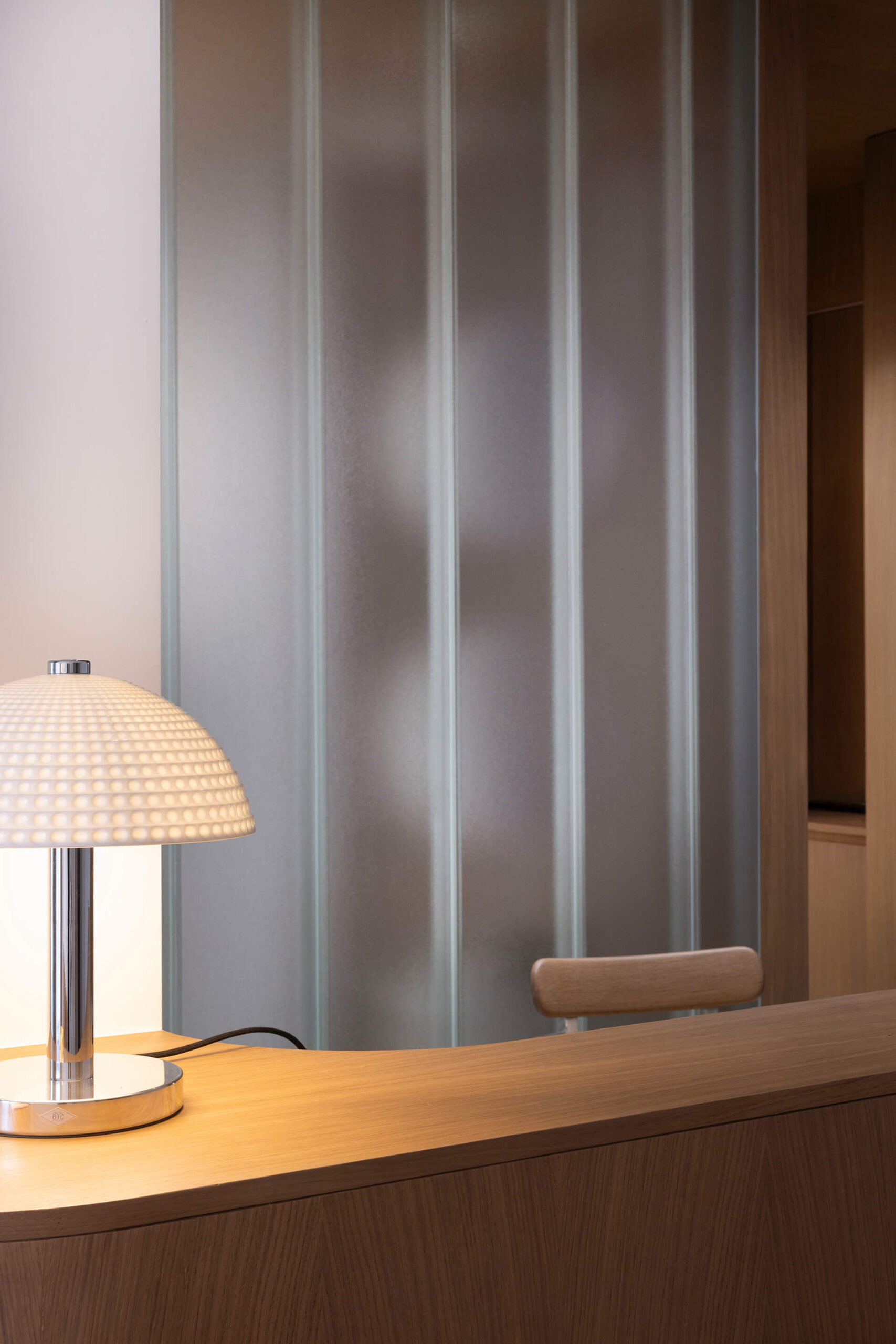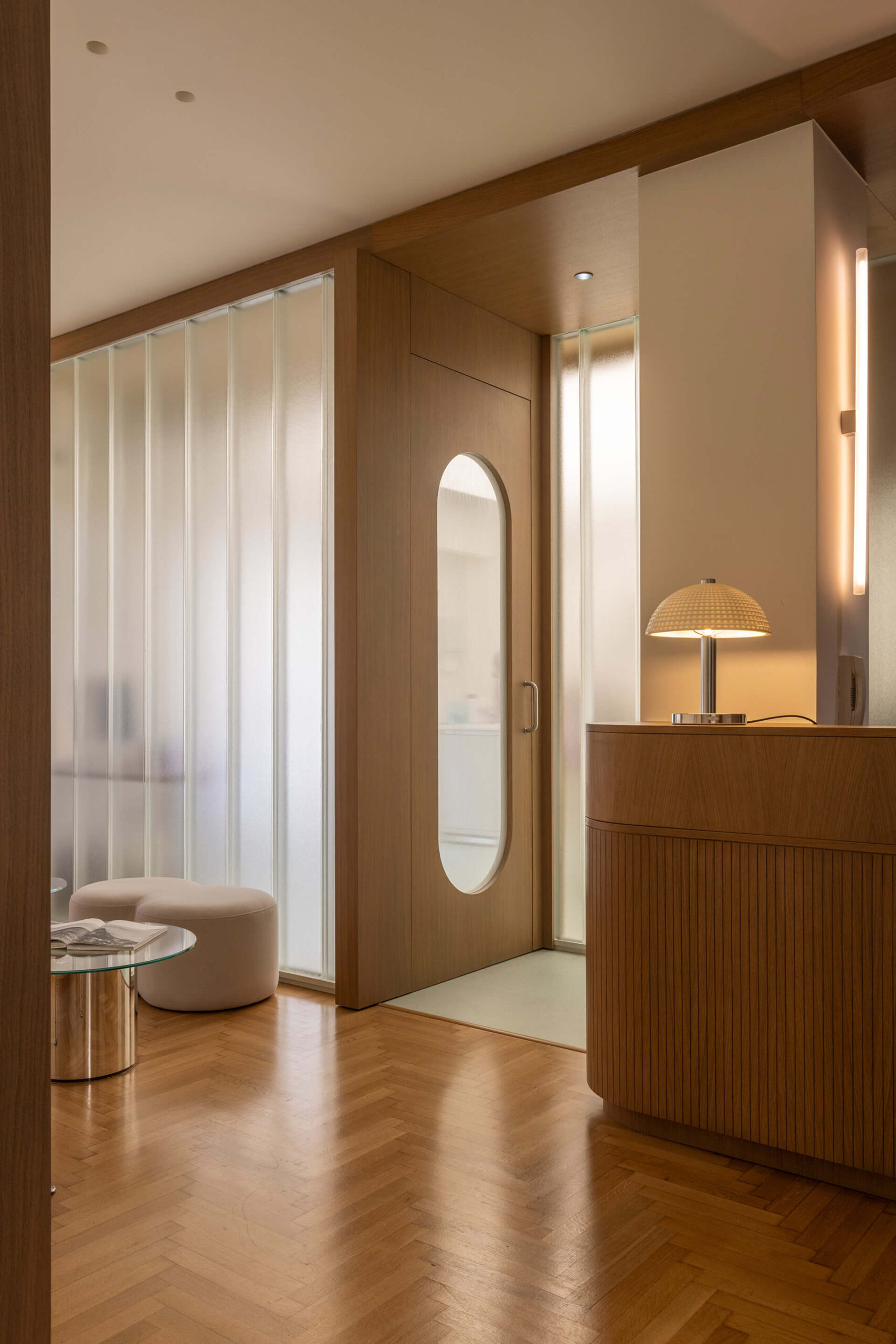 The clinic’s identity emerges from the combination of wood and glass, blending the typologies of clinic and home. Rather than concealing the conversion, the design embraces the space’s domestic origins, fostering a sense of comfort. Contemporary details subtly reference the modernism of the 1960s – the decade in which the building was constructed.