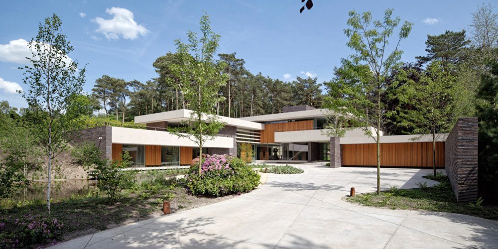The Netherlands is relatively flat. A site with a height difference of 6 meters thus provides unique possibilities. HILBERINKBOSCH architects was asked to fully exploit the qualities of the plot, while designing a luxurious villa. The plot is surrounded by three areas: dense vegetation towards the street, a large open space on the front side of the terrain and an open pine forest on the backside of the plot, which is characteristic for the area. An offshoot from the ‘Utrechtse Heuvelrug’ provides a significant height difference. The villa is situated on the north-east side of the lot, in and on the sand dune. The main areas of the residence are situated on the first floor which provides the best setting towards the forest. Because of its setting on top of the sand dune, one can walk straight out into the forest. In the dune on ground level, the guestrooms, fitness, sauna and pool are situated. Floating concrete floors, occasionally connected by robust brick walls emphasize the slope and the character of the terrain. Materials which are released on the building site are re-used whenever possible. Doing this, the building is deeply connected with its location, naturally and uniquely.