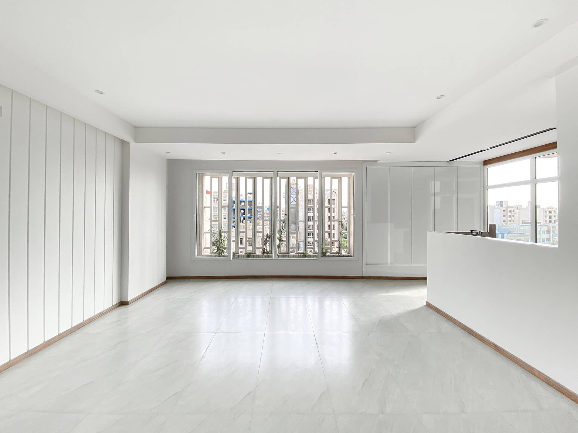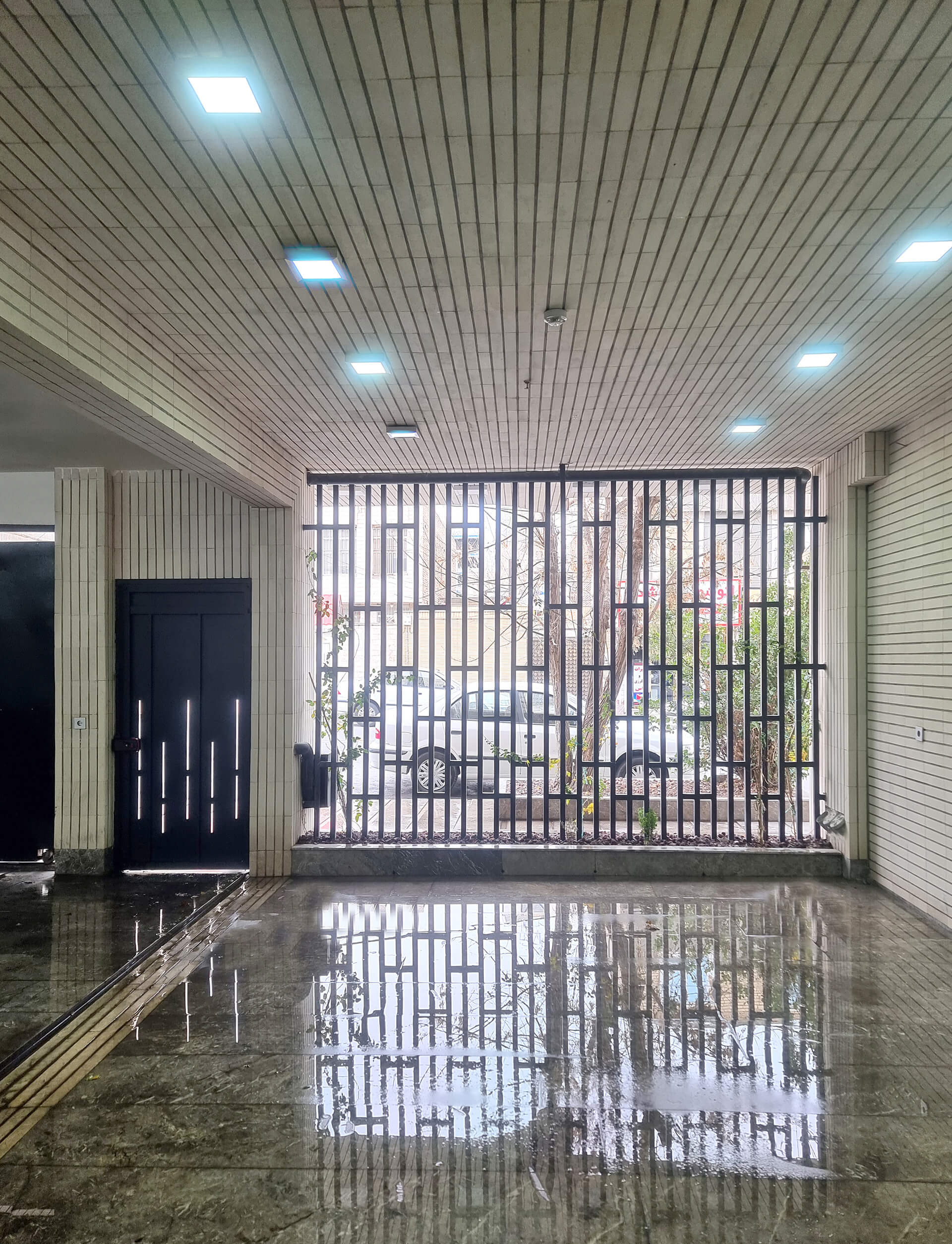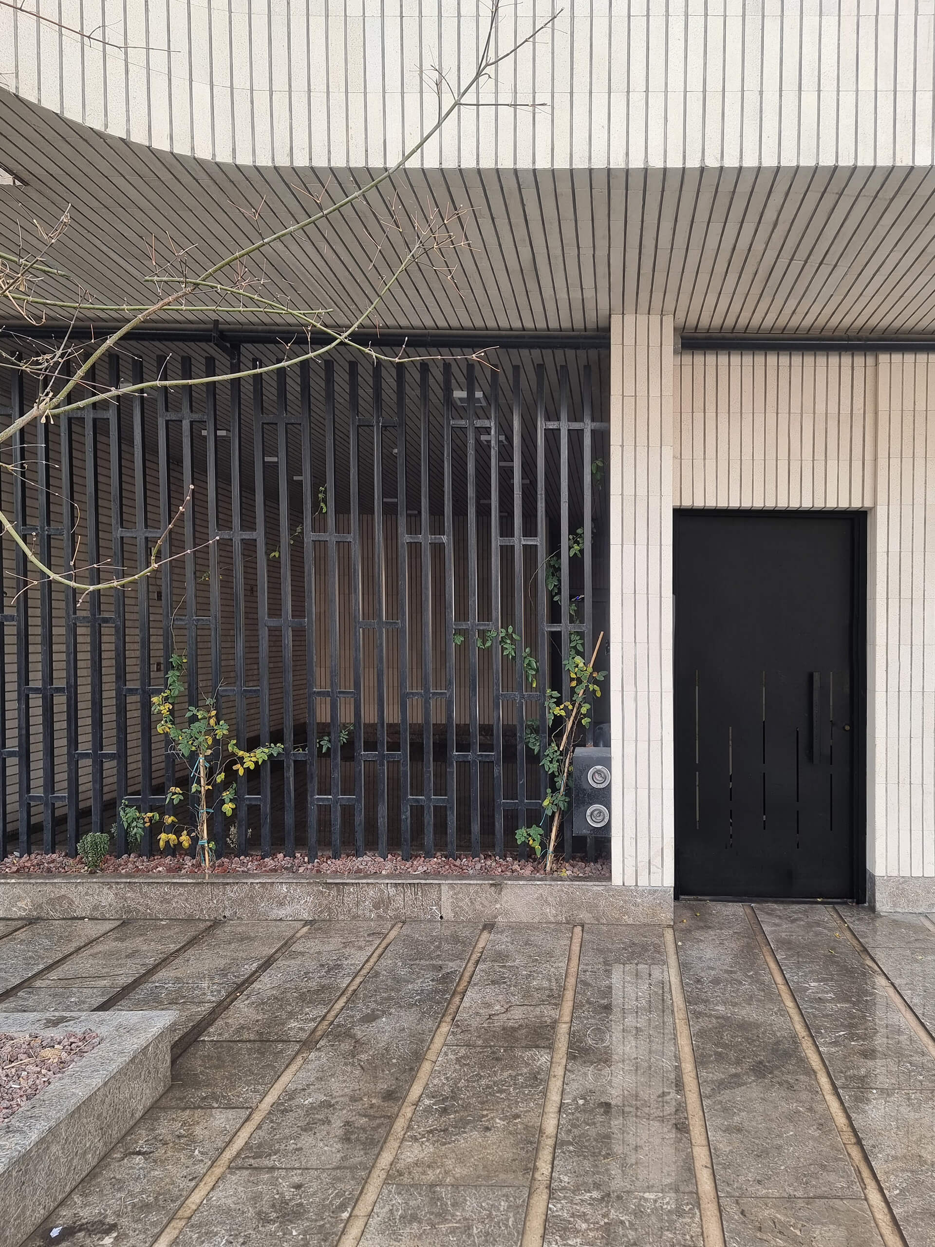Μέσα σε αυτό το λιτό πράσινο περιβάλλον, ένα μοναδικό δέντρο “Portulacaria afra” στεκόταν ως το μόνο ίχνος φύσης στο δρόμο. Απέναντι από το οικόπεδο, η θέα ανοίγεται προς συνεργεία αυτοκινήτων και ακατάστατες στέγες – συνθήκες που απαιτούσαν προσεκτική διαχείριση. Έτσι, το κτίριο διαμορφώνει ένα συγκροτημένο αστικό πρόσωπο προς την πόλη, ενώ ταυτόχρονα καλλιεργεί ένα εσωστρεφές οικιακό καταφύγιο για τους κατοίκους του.
