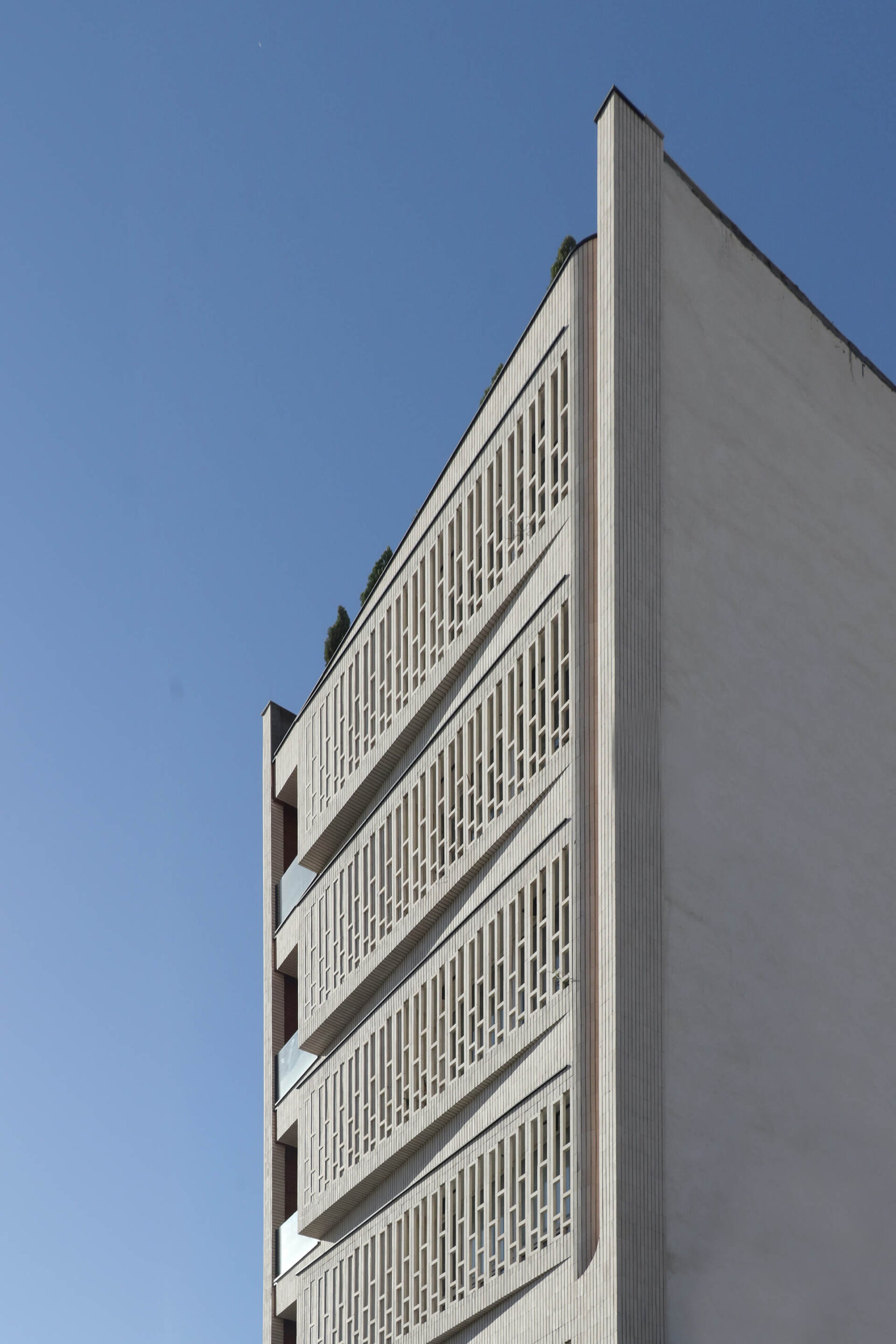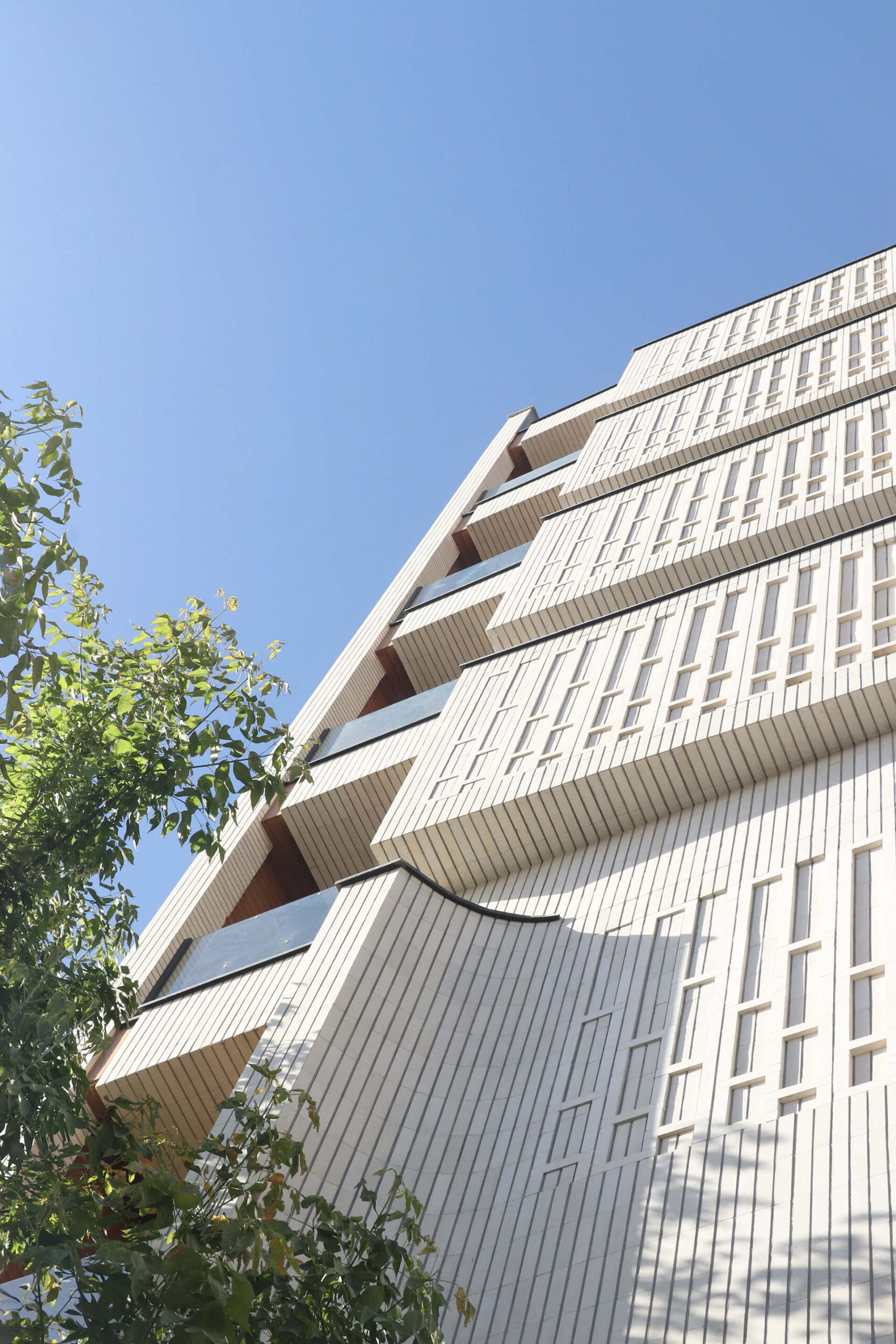 Η φαινομενική ρευστότητα της μορφής προκύπτει από ένα πειθαρχημένο αρθρωτό σύστημα, προσδίδοντας στο κτίριο μια διακριτική δυναμική: γειωμένο ανάμεσα στους παλαιότερους γείτονες, αλλά ελαφρώς κεκλιμένο προς τον δρόμο, σαν να αναγνωρίζει τον ρυθμό της πόλης.