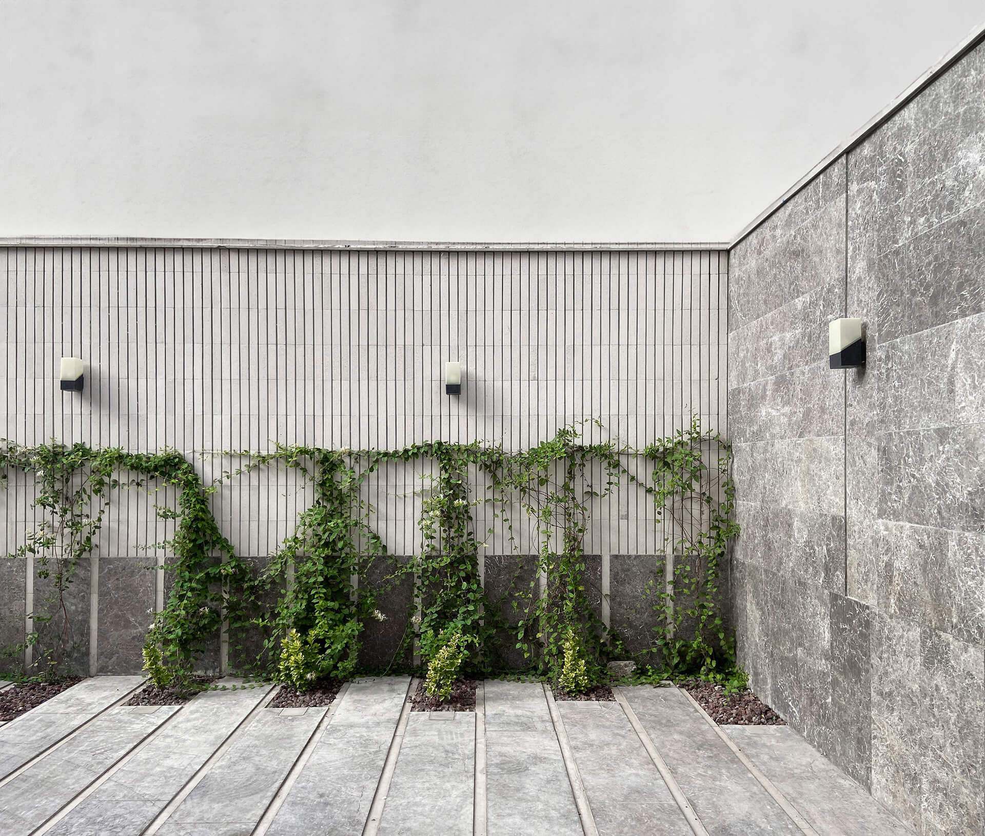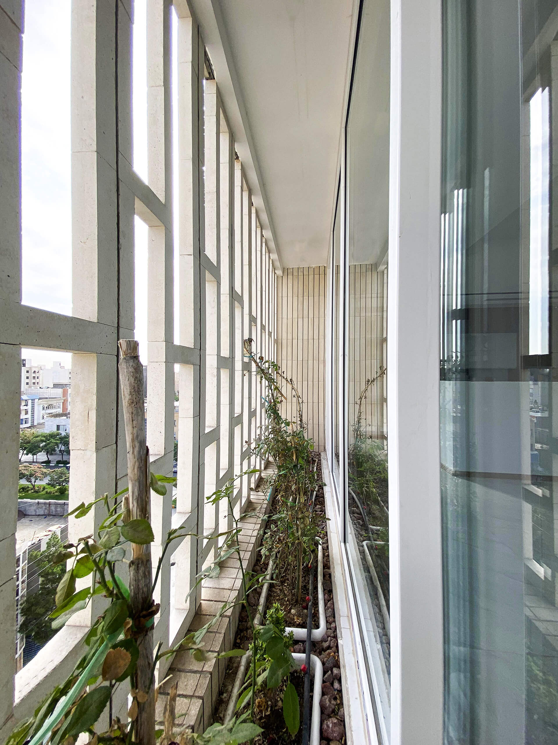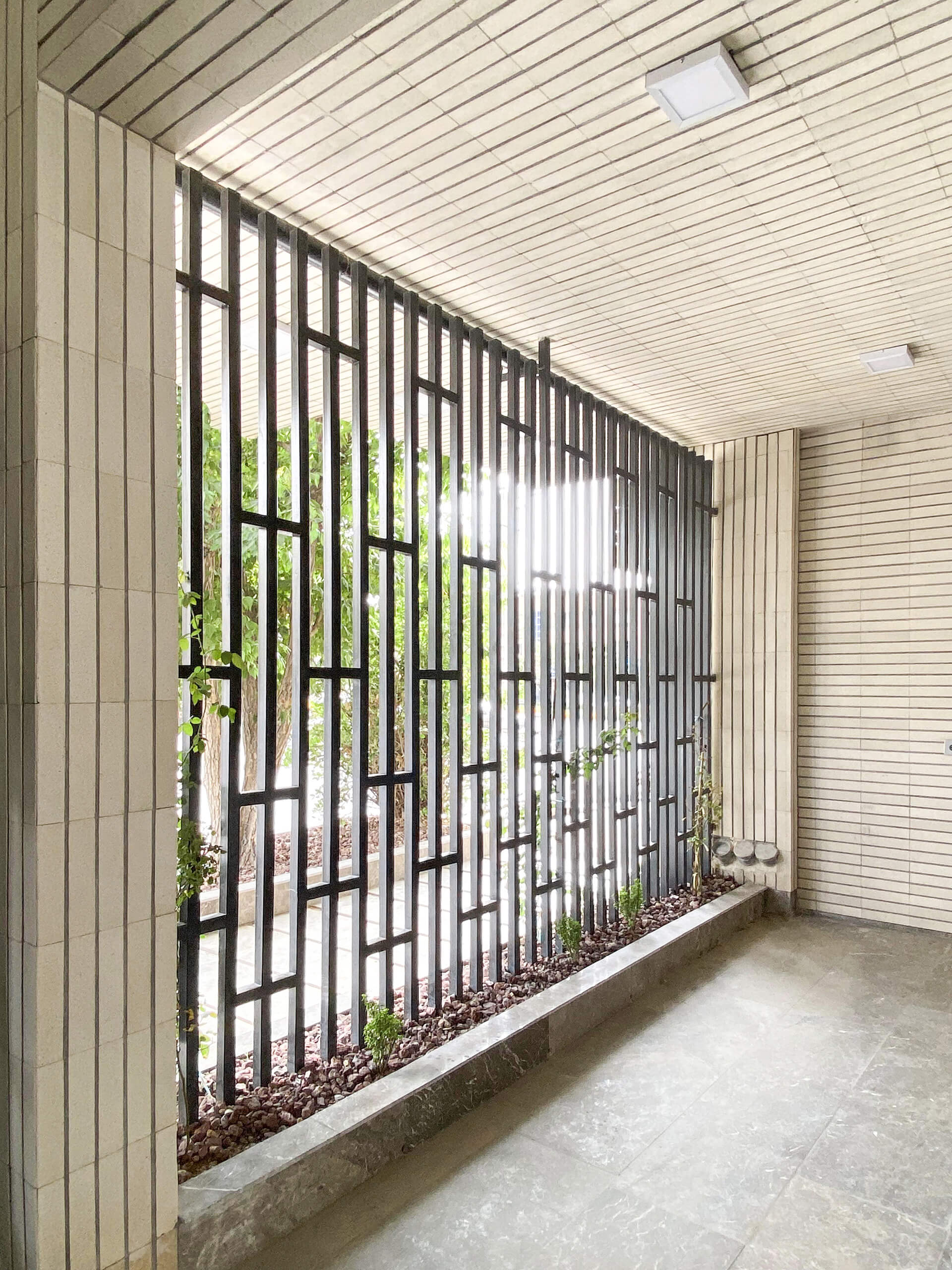Ένα διάτρητο πλέγμα από τούβλο περιβάλλει ολόκληρο το κτίριο, σχηματίζοντας μια πορώδη μεμβράνη ανάμεσα στην κατοικία και την πόλη. Πίσω του, ένα στενό γραμμικό αίθριο πρασίνου αναπτύσσεται κατά μήκος της όψης, εισάγοντας βλάστηση και διάχυτο φυσικό φως στο εσωτερικό, ενώ ταυτόχρονα μετριάζει τη σκληρή θέα προς τα απέναντι συνεργεία. Το τούβλινο αυτό φίλτρο λειτουργεί ως βιοκλιματικό και οπτικό διάφραγμα, ρυθμίζοντας φως, θερμοκρασία και ιδιωτικότητα. Συγκεκριμένα, δεν αποτελεί διακοσμητικό στοιχείο, αλλά μια ενεργή επιδερμίδα.