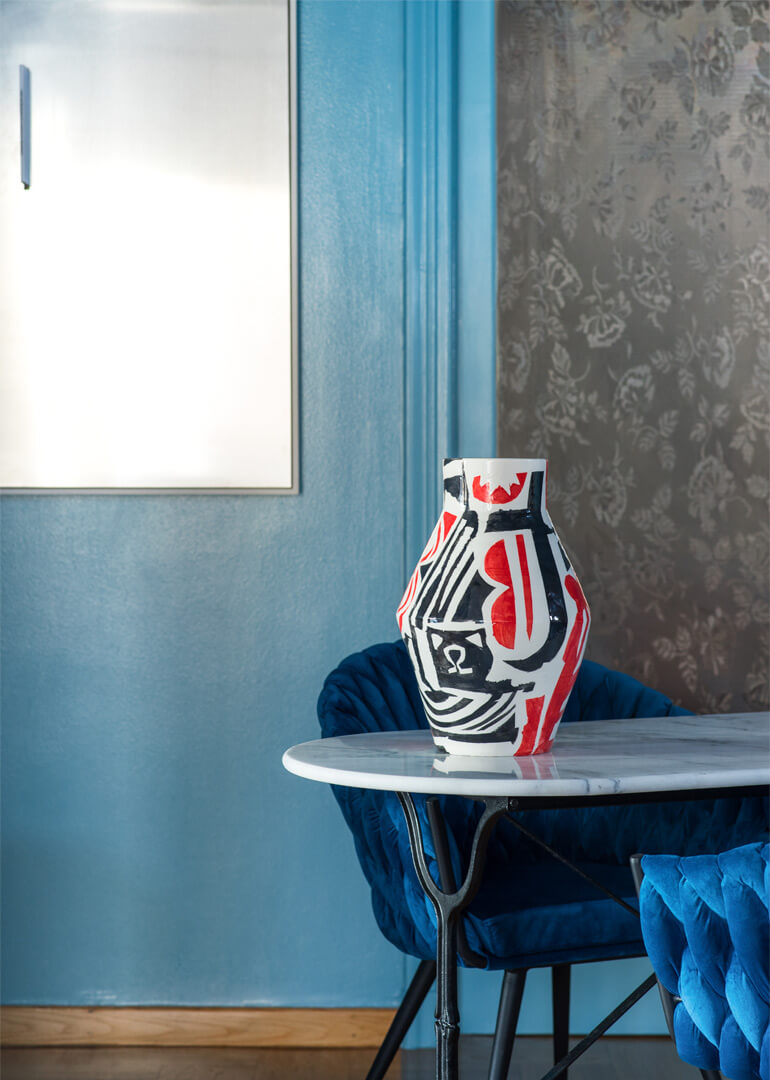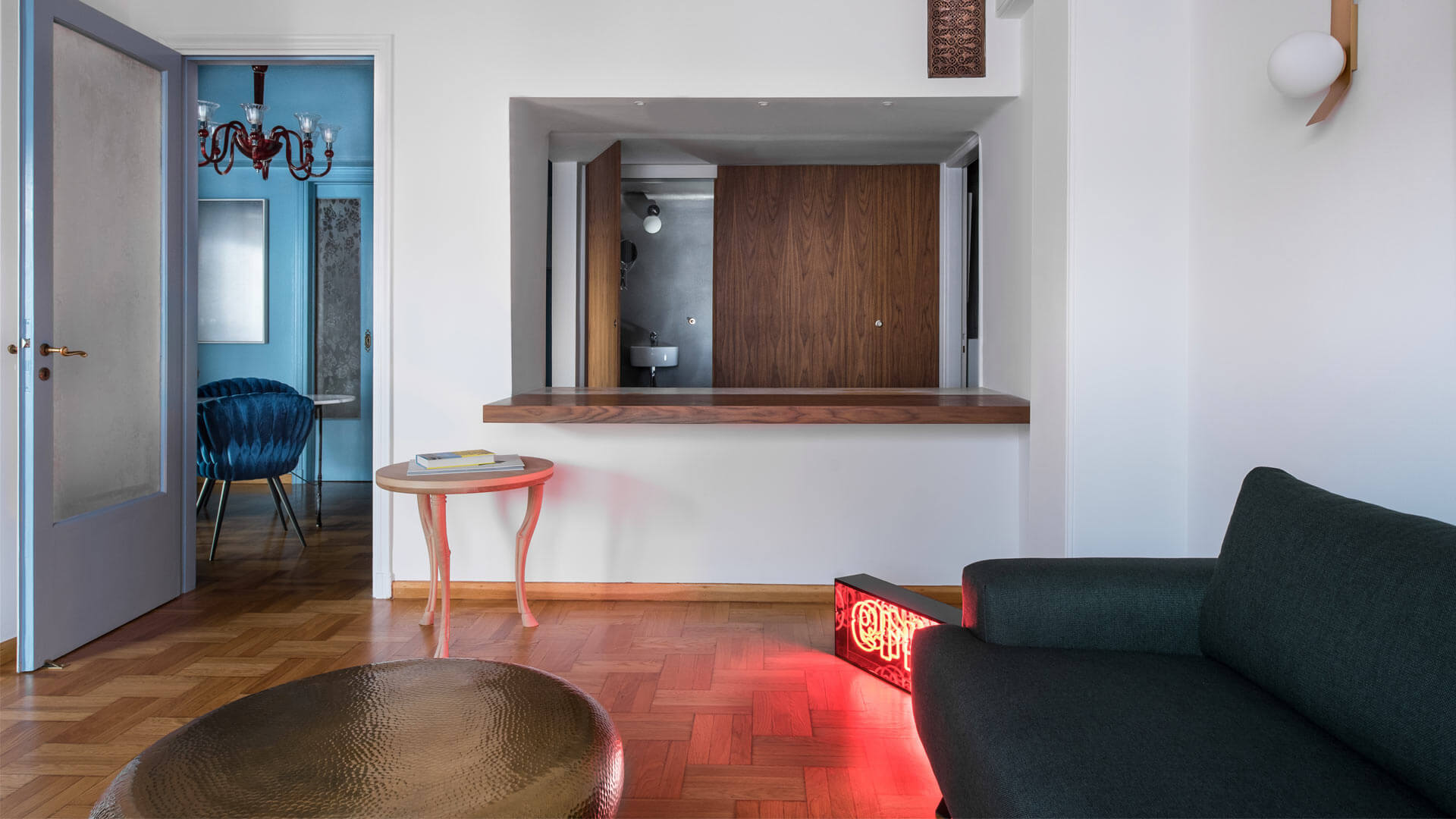 Όσον αφορά στην υλικότητα, ιδιαίτερη προσοχή δόθηκε στην αποκατάσταση των ξύλινων δαπέδων, ηλικίας 70 ετών, καθώς και στο γυάλισμα των μαρμάρινων πάγκων της κουζίνας. Μία σύγχρονη νότα προστέθηκε με έναν κατακόρυφο τοίχο από καρυδιά που κρύβει πίσω του το WC. Οι επενδύσεις των τοίχων κινούνται από υπόλευκο ματ χρώμα στα σαλόνια μέχρι γυαλιστερό στην κουζίνα και ασημί μεταλλικό στο WC. Ένα γυαλιστερό γαλάζιο δωμάτιο στη μέση της κάτοψης είναι μια ποπ παρεμβολή, καθώς εισέρχεται κανείς στο διαμέρισμα.