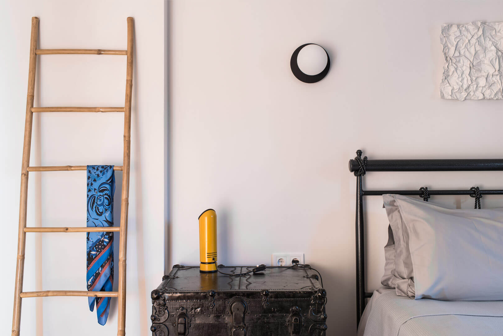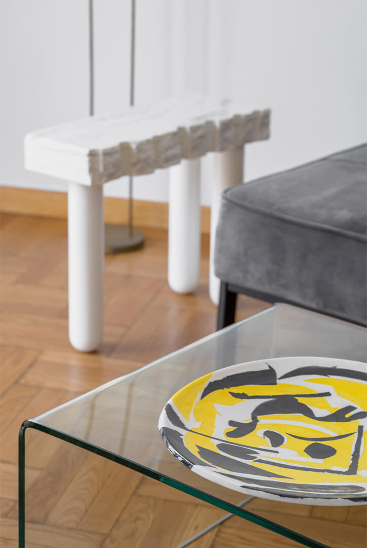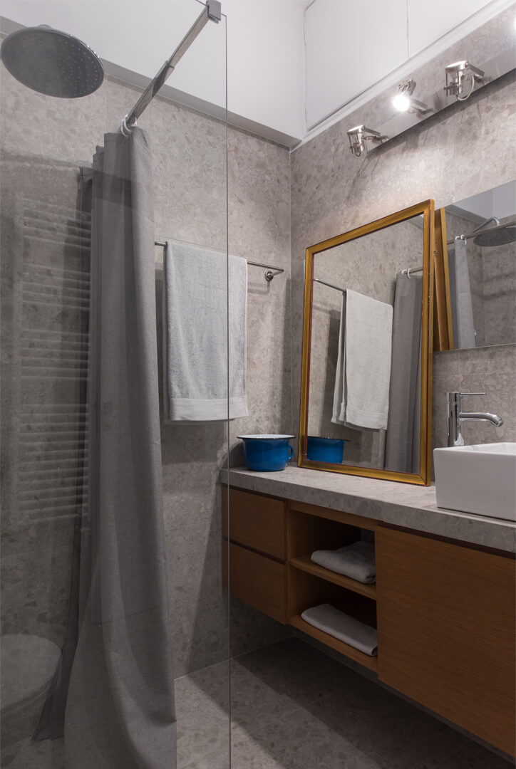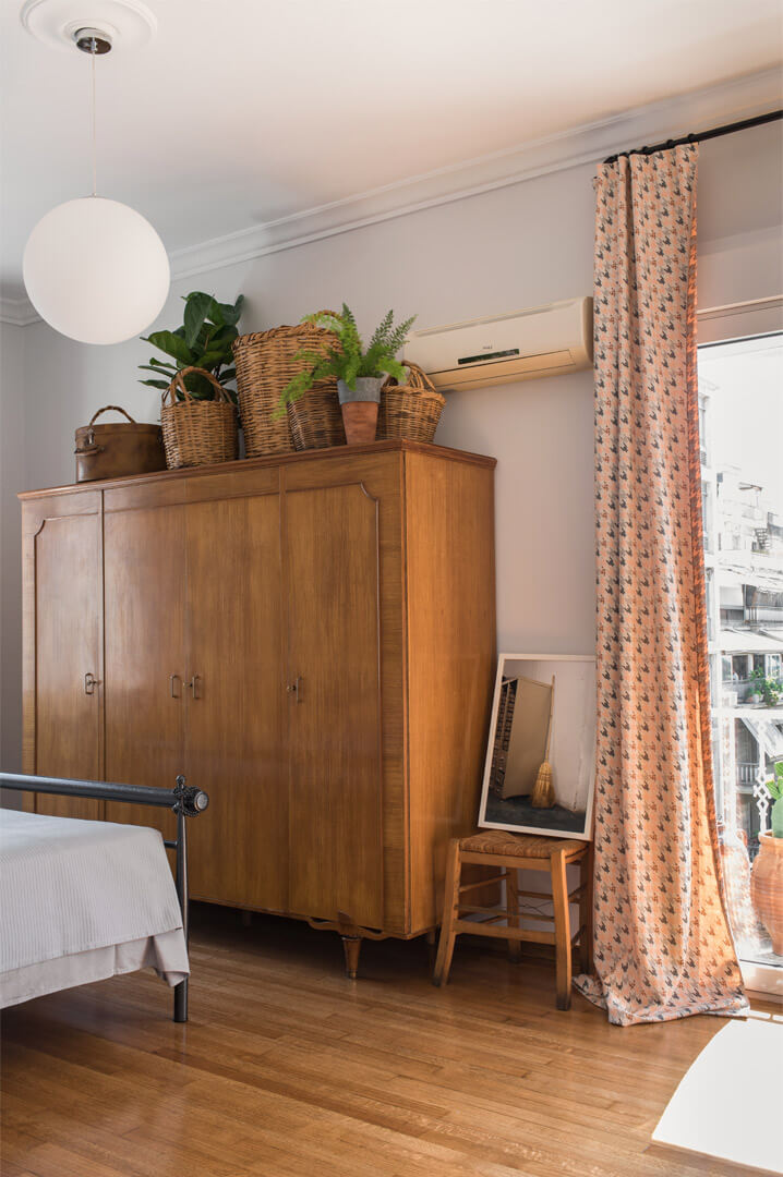 Αντικείμενα των προηγούμενων ιδιοκτητών, όπως βαλίτσες, δερμάτινα μπαούλα, ψάθινα καλάθια και καρέκλες καφενείου επαναχρησιμοποιούνται στη διακόσμηση του διαμερίσματος. Άλλα κομμάτια περιλαμβάνουν το αρχαιοελληνικό κάθισμα «κλισμός» και τα ειδικά κατασκευασμένα τραπεζάκια. Έργα καλλιτεχνών, φίλων του αρχιτέκτονα, διακοσμούν τους τοίχους και φέρνουν μια σύγχρονη νότα στον χώρο.