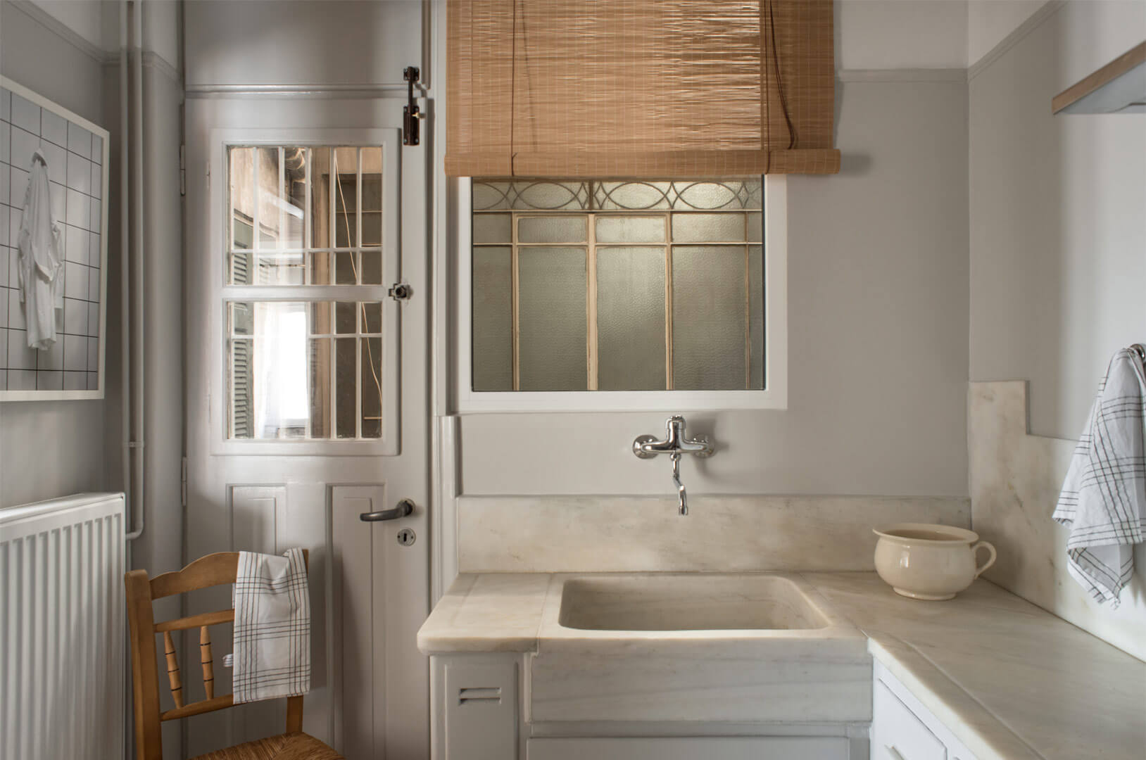 Κατά τον σχεδιασμό της ανακαίνισης του διαμερίσματος, διατηρήθηκαν όλα τα προηγούμενα χαρακτηριστικά, όπου συμπεριλαμβάνονται οι συρόμενες πόρτες, τα σκαλιστά ξύλινα κουφώματα και οι γύψινες διακοσμήσεις της οροφής. Η μόνη σημαντική μετατροπή ήταν το άνοιγμα σε έναν τοίχο ώστε να μετατραπεί η πρώην αποθήκη σε μεγάλο πάγκο.