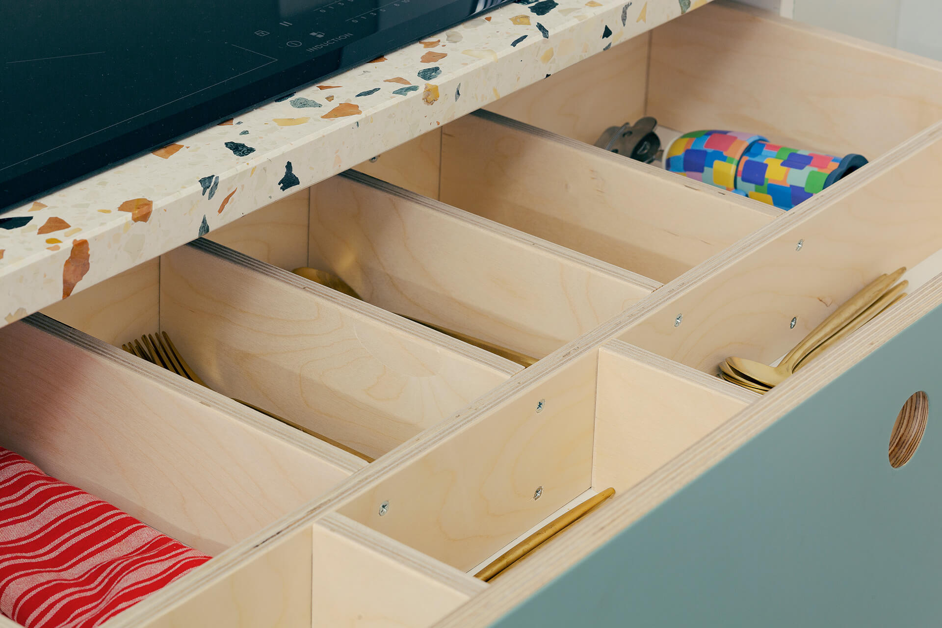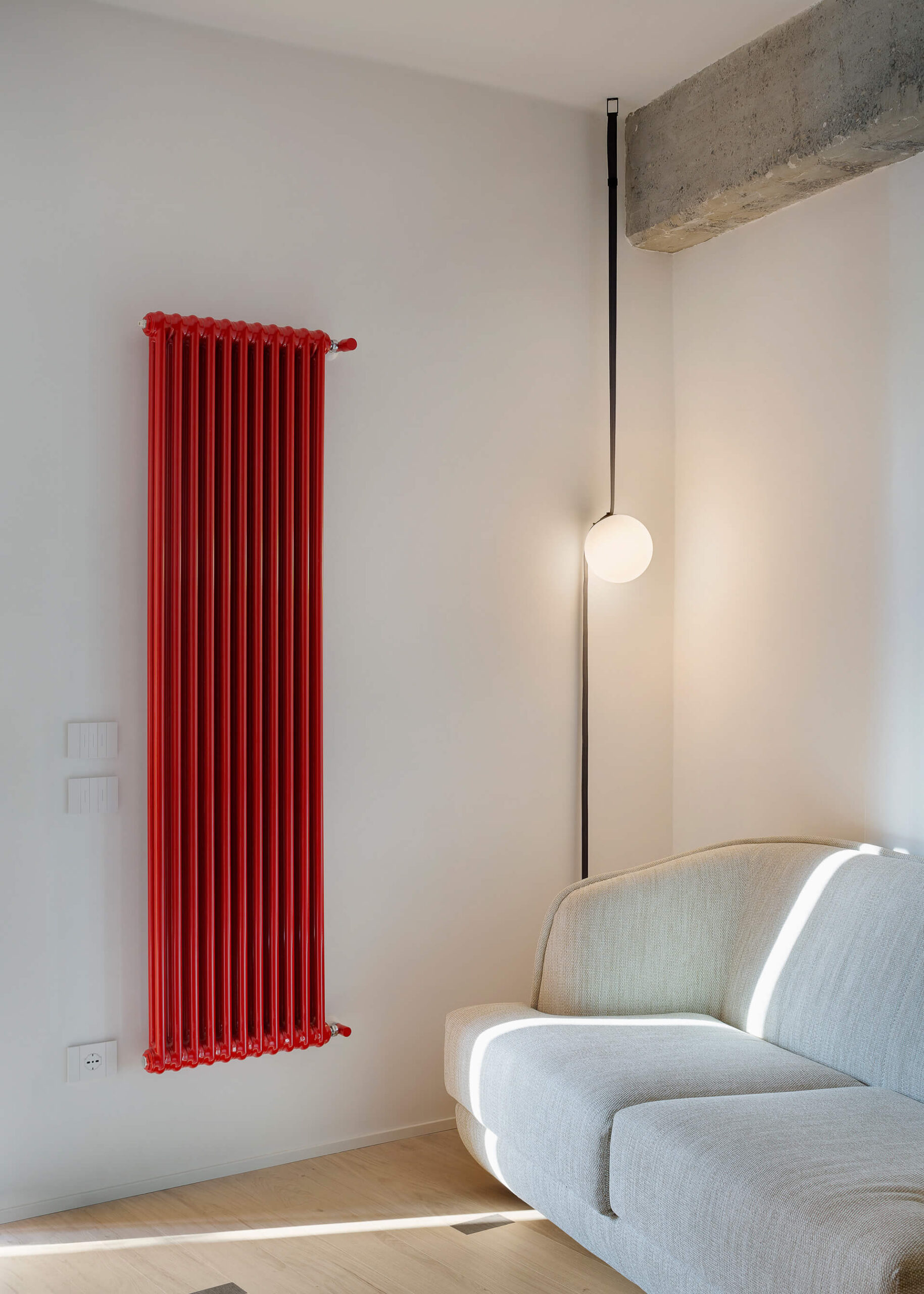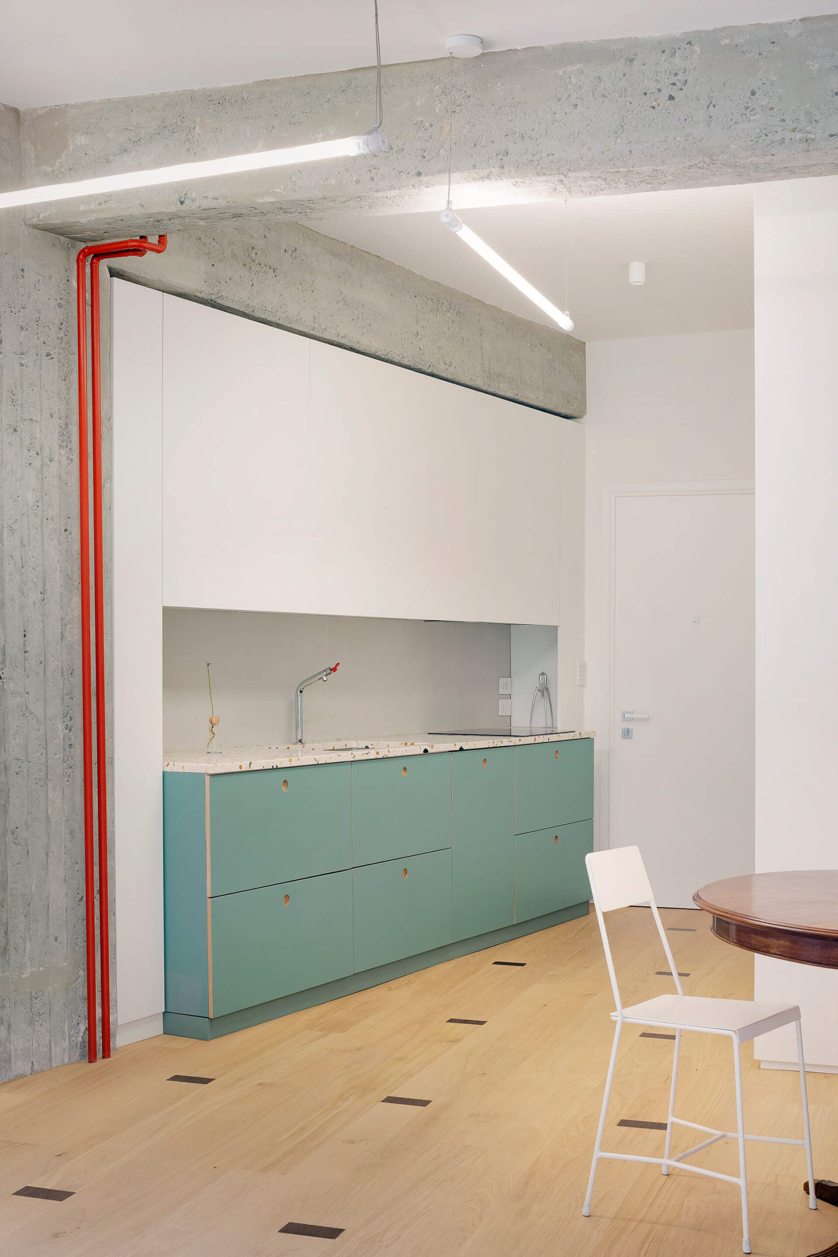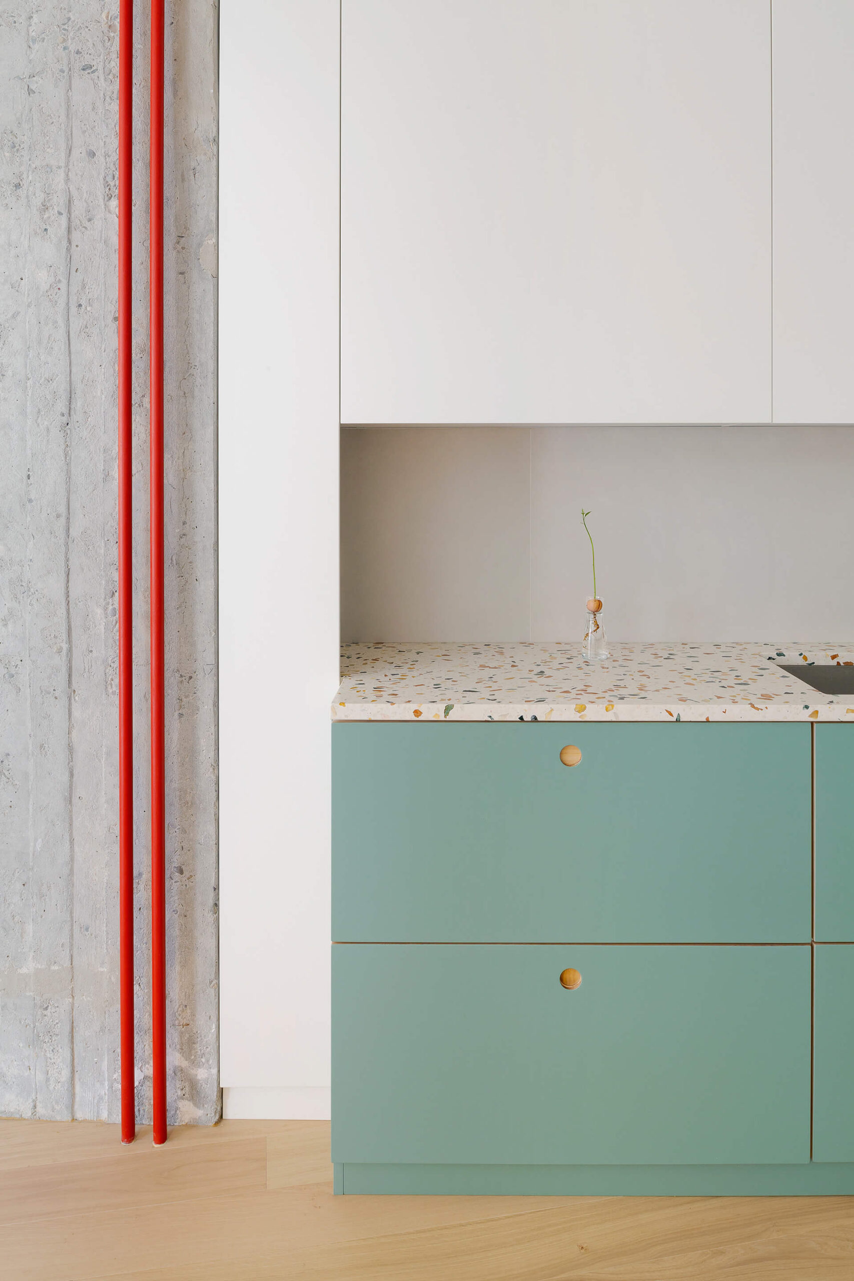 Το κόκκινο ξύλο σημύδας διαδραματίζει κεντρικό ρόλο στη διαμόρφωση του χαρακτήρα του διαμερίσματος, προσδίδοντας βάθος και ζεστασιά στη μινιμαλιστική σύνθεση. Η φυσική νεύρωση και οι χρωματικές διακυμάνσεις του δημιουργούν έναν οπτικό ρυθμό που αντιπαραβάλλεται με τις ουδέτερες επιφάνειες και τις λεπτοδουλεμένες λεπτομέρειες. Η πέτρα, το μέταλλο και το φως ενσωματώθηκαν ως συμπληρωματικά στοιχεία, αναδεικνύοντας τη δεξιοτεχνία και την υλικότητα του χώρου.