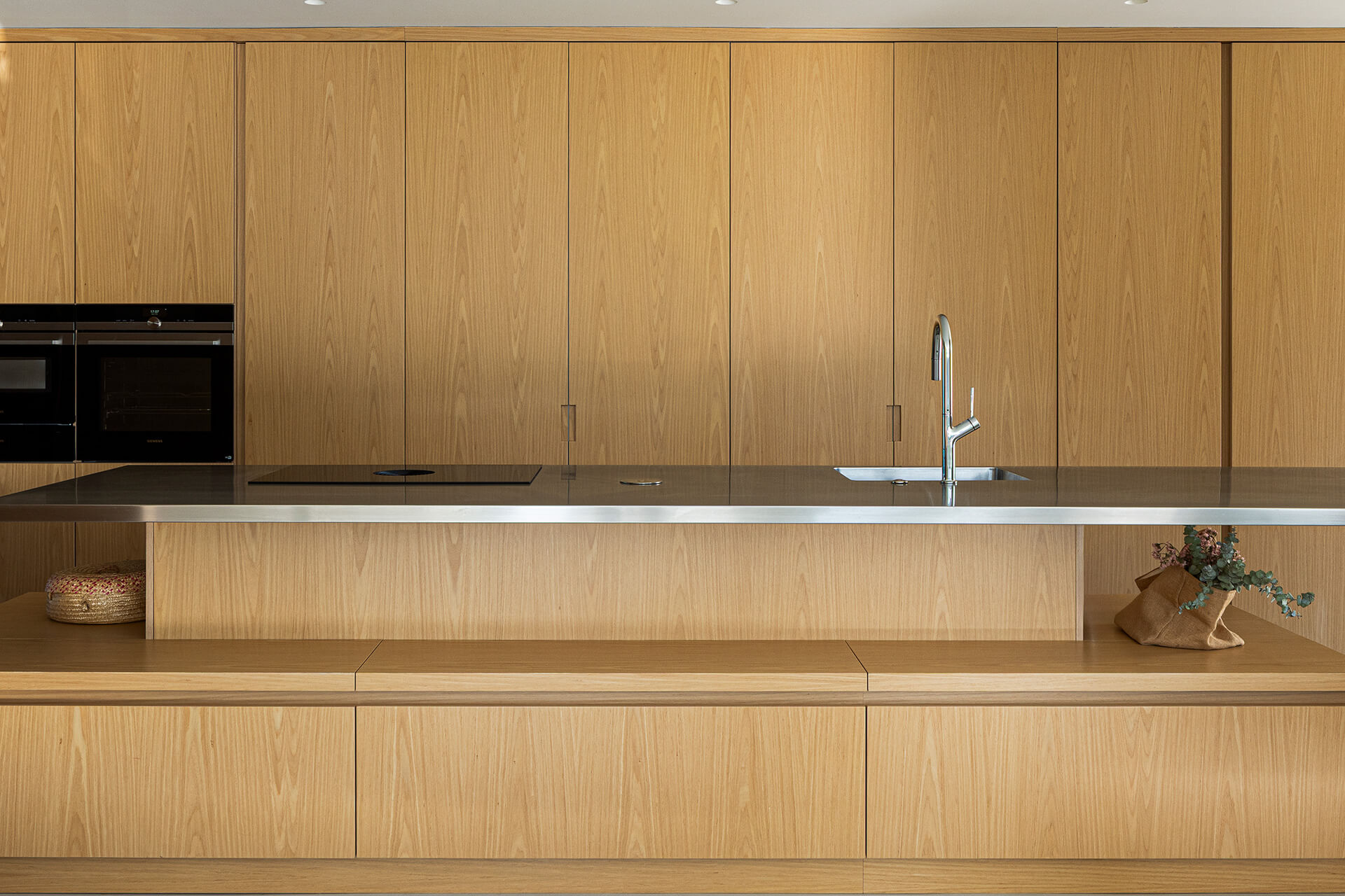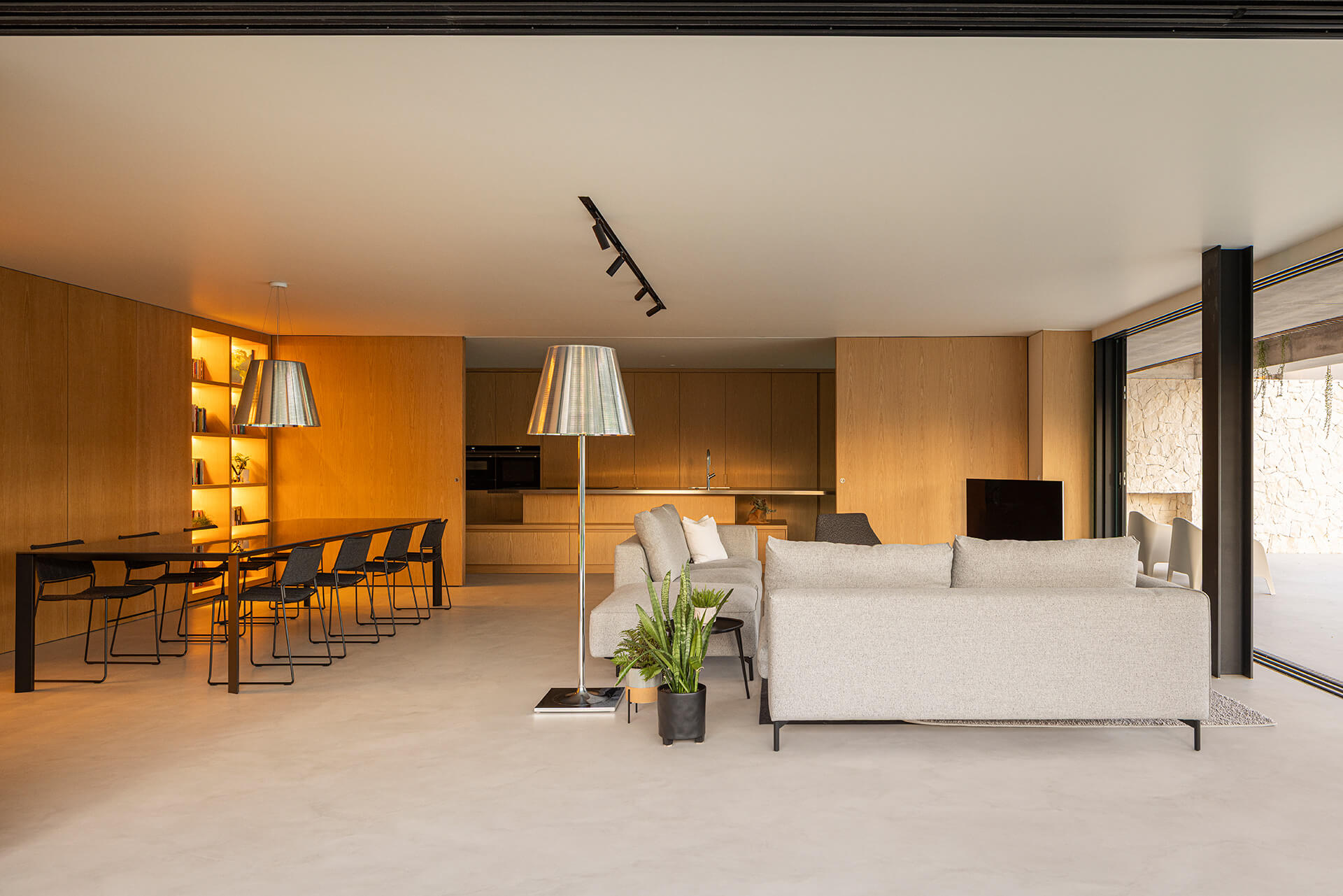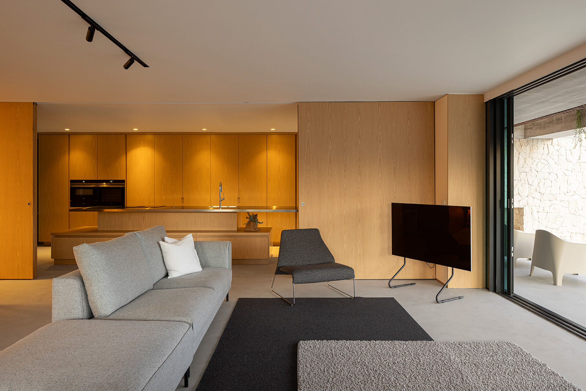 Η επιλογή των υλικών συμβάλλει καθοριστικά στη συνολική αισθητική και αίσθηση του χώρου. Κυριαρχούν το ξύλο στα έπιπλα και το μικροτσιμέντο στα δάπεδα, δημιουργώντας μια ενιαία, ήρεμη υλικότητα που ενισχύει τη ροή μεταξύ των χώρων. Η μετάβαση από το καθιστικό στην κουζίνα μπορεί να ελεγχθεί μέσω δύο ξύλινων συρόμενων πάνελ, προσφέροντας ευελιξία στη χρήση και την ιδιωτικότητα. Η κουζίνα έχει σχεδιαστεί με ένα σύστημα πάνελ, το οποίο, όταν κλείνει, αποκρύπτει πλήρως τις λειτουργίες της –από τα ντουλάπια και τους πάγκους, μέχρι τις συσκευές και τα μαγειρικά σκεύη– μεταμορφώνοντας τον χώρο σε ένα καθαρό, μινιμαλιστικό περιβάλλον.
