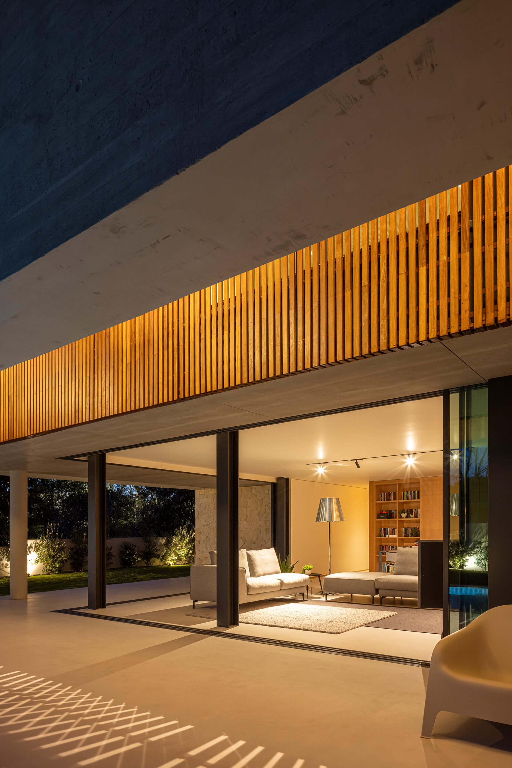 Η εσωτερική οργάνωση του σπιτιού βασίζεται σε μια καθαρή λειτουργική λογική. Με την είσοδο στην κατοικία, ο επισκέπτης οδηγείται σε έναν κεντρικό χώρο διανομής, από όπου αποκτά πρόσβαση σε όλους τους επιμέρους χώρους. Στο ίδιο επίπεδο βρίσκεται ένα κλειστό γκαράζ με χωρητικότητα τριών οχημάτων, ένας τεχνικός χώρος και ένας ξενώνας που μπορεί να λειτουργήσει και ως γραφείο, συνοδευόμενος από ιδιωτικό λουτρό. Οι ιδιωτικοί χώροι περιλαμβάνουν τη master σουίτα και δύο μικρότερες σουίτες, οι οποίες διαθέτουν όλα ανεξάρτητα μπάνια, γκαρνταρόμπες, υπνοδωμάτια και μπαλκόνια. Ολόκληρος ο όροφος, περιλαμβανομένων των θυρών του γκαράζ, είναι επενδυμένος με κάθετες ξύλινες περσίδες, προσδίδοντας στο σύνολο μία αίσθηση ενότητας και ζεστασιάς.