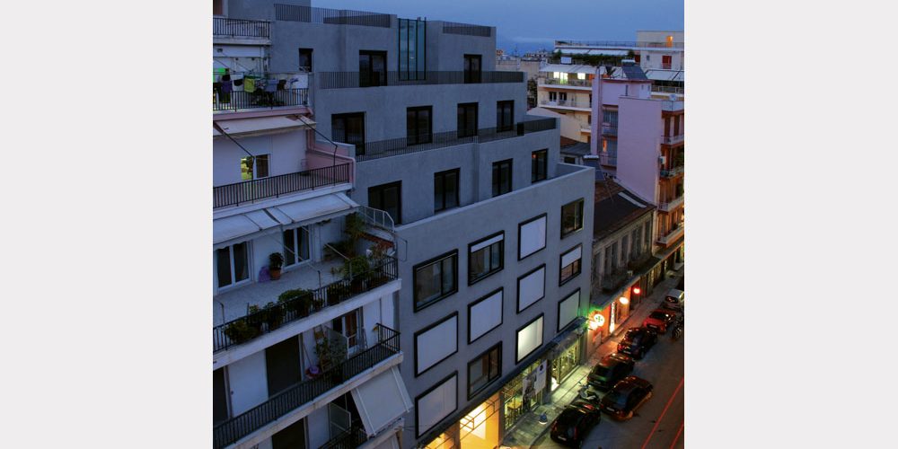 Ένα υφιστάµενο κτίριο από τη δεκαετία του 1970 – µια πρώην ιδιωτική κλινική – στα όρια του κέντρου της Πάτρας, ανακατασκευάζεται σε πρωτότυπο αστικό συγκρότηµα, προσφέροντας 50 φοιτητικά διαµερίσµατα και ποικίλους κοινόχρηστους χώρους. Η µελέτη ανακατασκευής, όσον αφορά στη σχέση κτιρίου – πόλης, προσπάθησε να αντιµετωπίσει τρία βασικά θέµατα: – τη διεύρυνση του στενού “φαραγγιού” της οδού της πρόσοψη µε την αποξήλωση των εξωστών,- τη συνδιαλλαγή της νέας όψης µε το γειτονικό νεοκλασικό µέσω της επιπεδότητας και κλίµακας των δώδεκα ανοιγµάτων στους τρεις πρώτους ορόφους και, – την ενεργοποίηση του ακάλυπτου µε την πρόβλεψη κοινόχρηστου προγράµµατος στη στάθµη του ισογείου και την αποξήλωση των συνεχόµενων εξωστών, προκειµένου να δηµιουργηθούν εξώστες ή γαλλικά παράθυρα, που αναφέρονται σε κάθε διαµέρισµα ξεχωριστά. Στη διευρυµένη πλέον οδό Καραϊσκάκη, τα 12 µεγάλα παράθυρα, µε τα εκφρασµένα µαύρα πλαίσια αλουµινίου, καδράρουν και αντανακλούν απόψεις της παλιάς πόλης, ενώ τα ηλεκτροκίνητα σκιάδια καθ’ όλη τη διάρκεια της ηµέρας µεταβάλλουν την όψη, προβάλλοντας πτυχές της καθηµερινότητας των ενοίκων. Στον ακάλυπτο, οι εξώστες – θεωρεία και ο κοινόχρηστος χώρος για τους ενοίκους καταδεικνύουν τις δυνατότητες ενεργοποίησης των υπολειµµατικών χώρων της ελληνικής πόλης. Οι ιδιαιτερότητες του προγράµµατος απαίτησαν την αποξήλωση όλων των εσωτερικών πετασµάτων και στα οκτώ επίπεδα του κτιρίου, προκειµένου να επιτευχθεί µια “εκλογίκευση” της χωρικής οργάνωσης. Τα µεγέθη των διαµερισµάτων κυµαίνονται από 20 m2 έως 48 m2 µε το µεγαλύτερο ποσοστό στα 35 m2. Ένα στοιχείο, που διαφοροποιούσε το υφιστάµενο κτίριο ήταν το εσωτερικό αίθριό του. Ο κατακόρυφος αυτός χώρος γίνεται ο κοινωνικός πυρήνας του κτιρίου, διαµέσου του οποίου πραγµατοποιείται η πρόσβαση στα διαµερίσµατα, ενώ παράλληλα διασφαλίζει τα βιοκλιµατικά οφέλη ενός διαµπερώς αεριζόµενου χώρου, φυσικό φωτισµό και µοναδικές θέες στους άνω ορόφους.