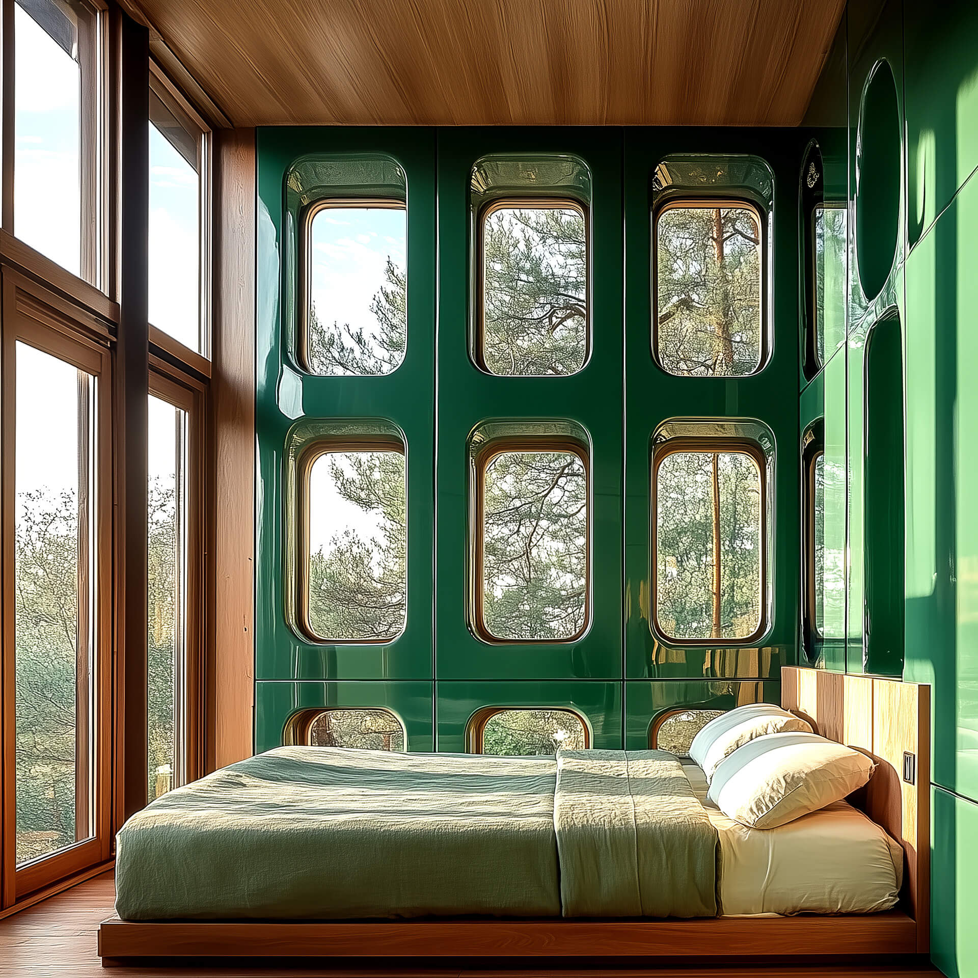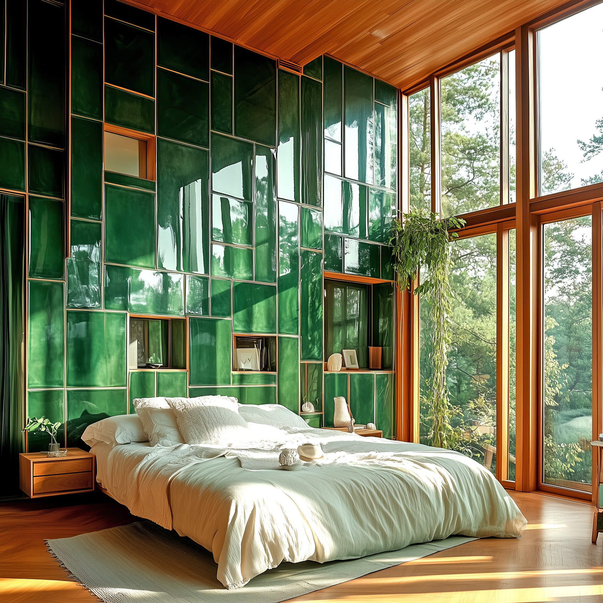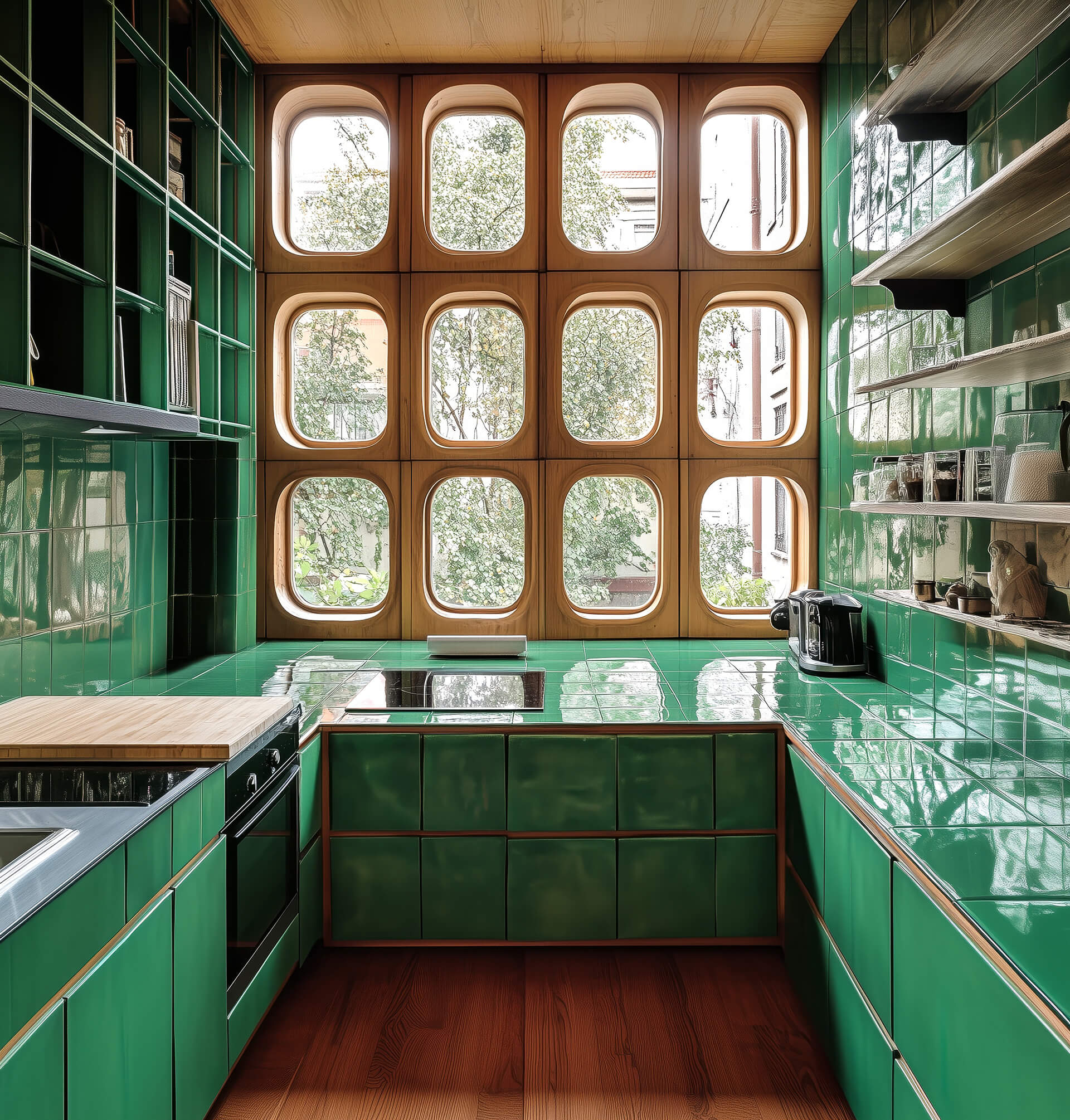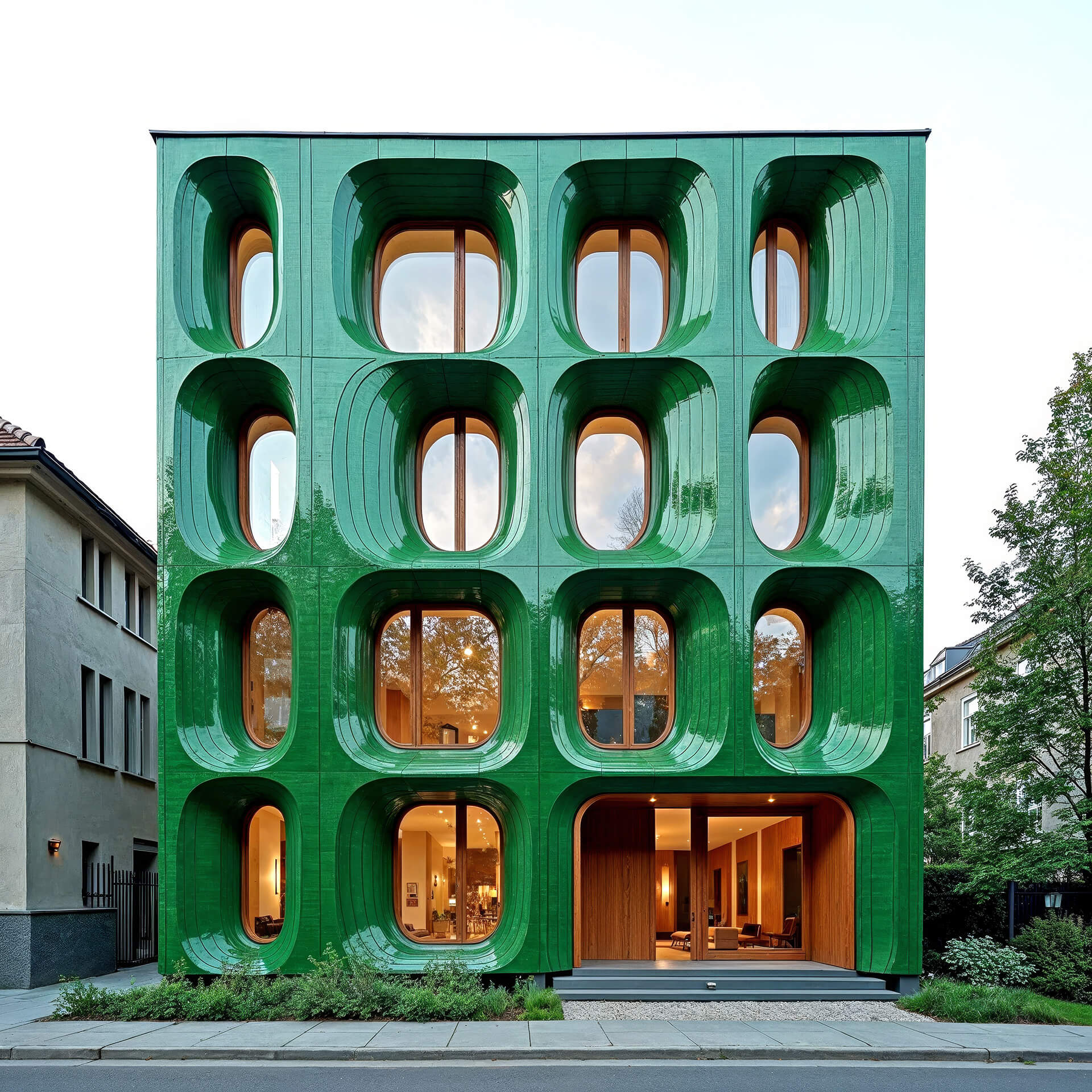 Ένα διαμέρισμα με πρόσοψη από πράσινη κεραμική. Σύγχρονο αρχιτεκτονικό ύφος.