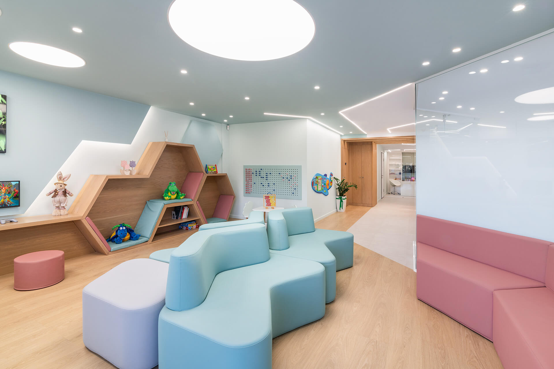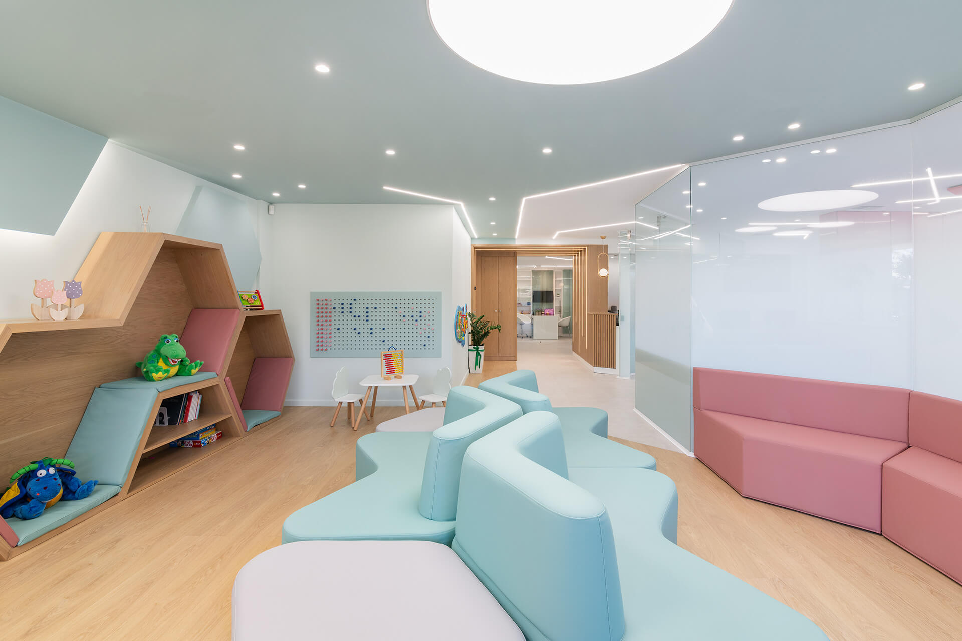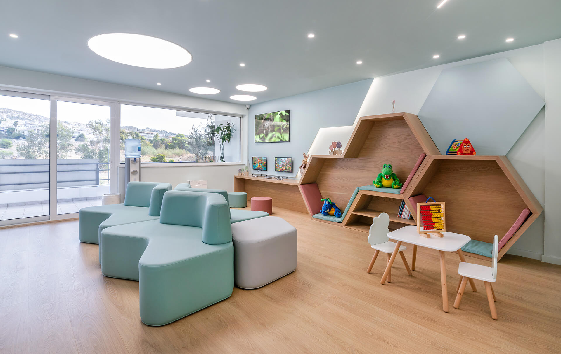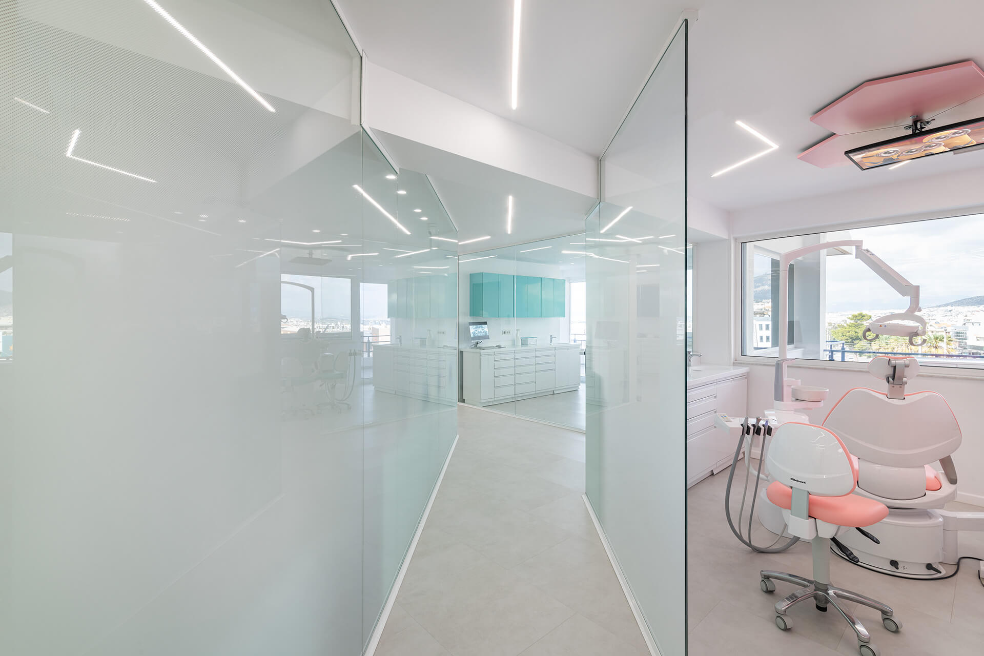 Η επιλογή των υλικών επικεντρώθηκε σε ανθεκτικές και φιλικές προς τα παιδιά επιφάνειες. Ξύλο, ζεστά χρώματα και υφές συνδυάστηκαν με μοντέρνα στοιχεία για να διαμορφώσουν έναν χώρο που ισορροπεί την οικειότητα με την υγιεινή και την ασφάλεια. Η κλινική εκμεταλλεύεται τη θέση της στον 3ο όροφο για να επιτρέψει στο φυσικό φως να διαχέεται στους εσωτερικούς χώρους. Η θέα προς την πόλη δημιουργεί μια αίσθηση ανοιχτότητας, ενώ η εσωτερική διαρρύθμιση ενισχύει την αίσθηση ηρεμίας και προστασίας.