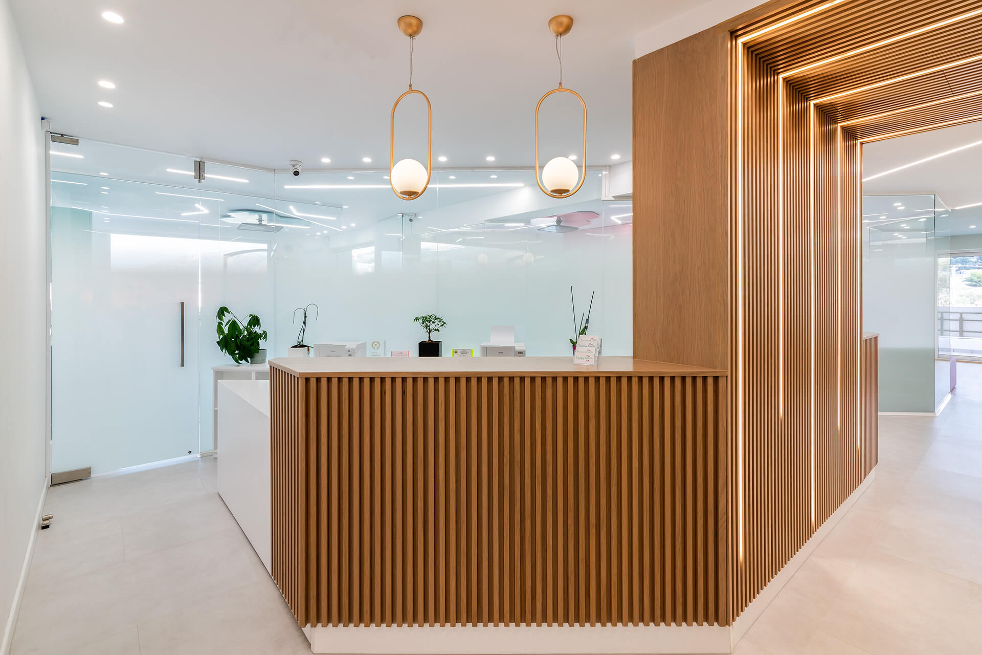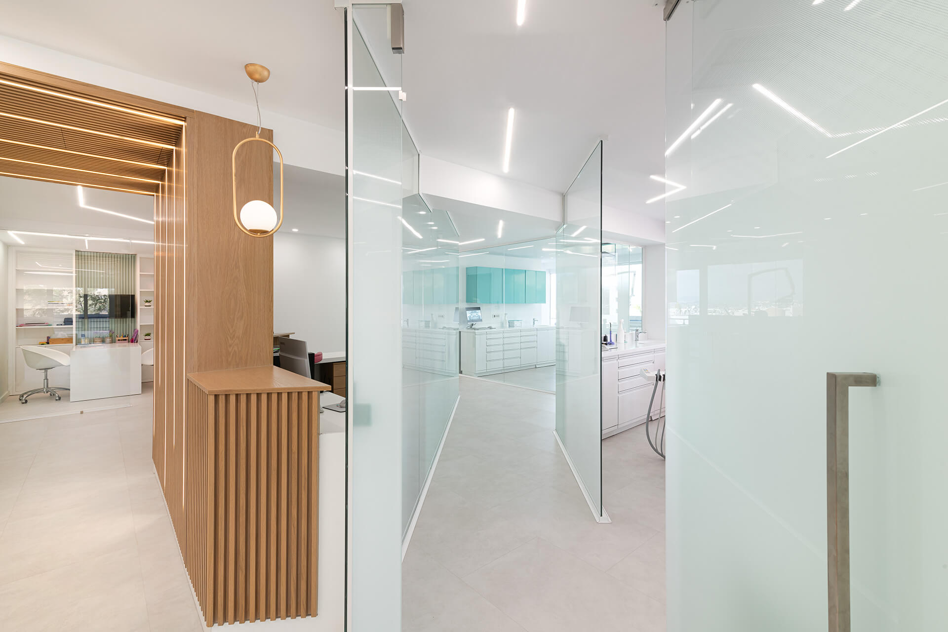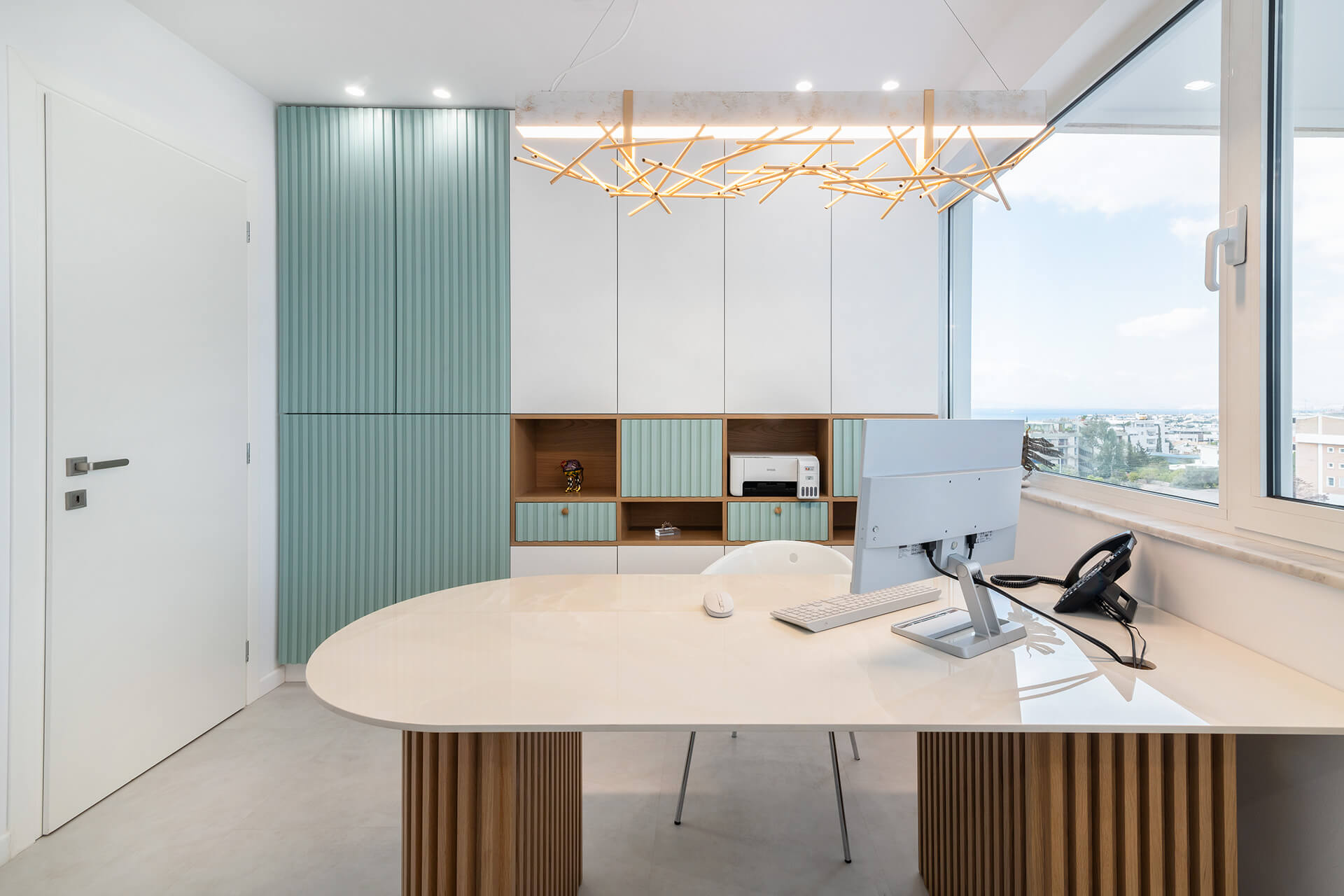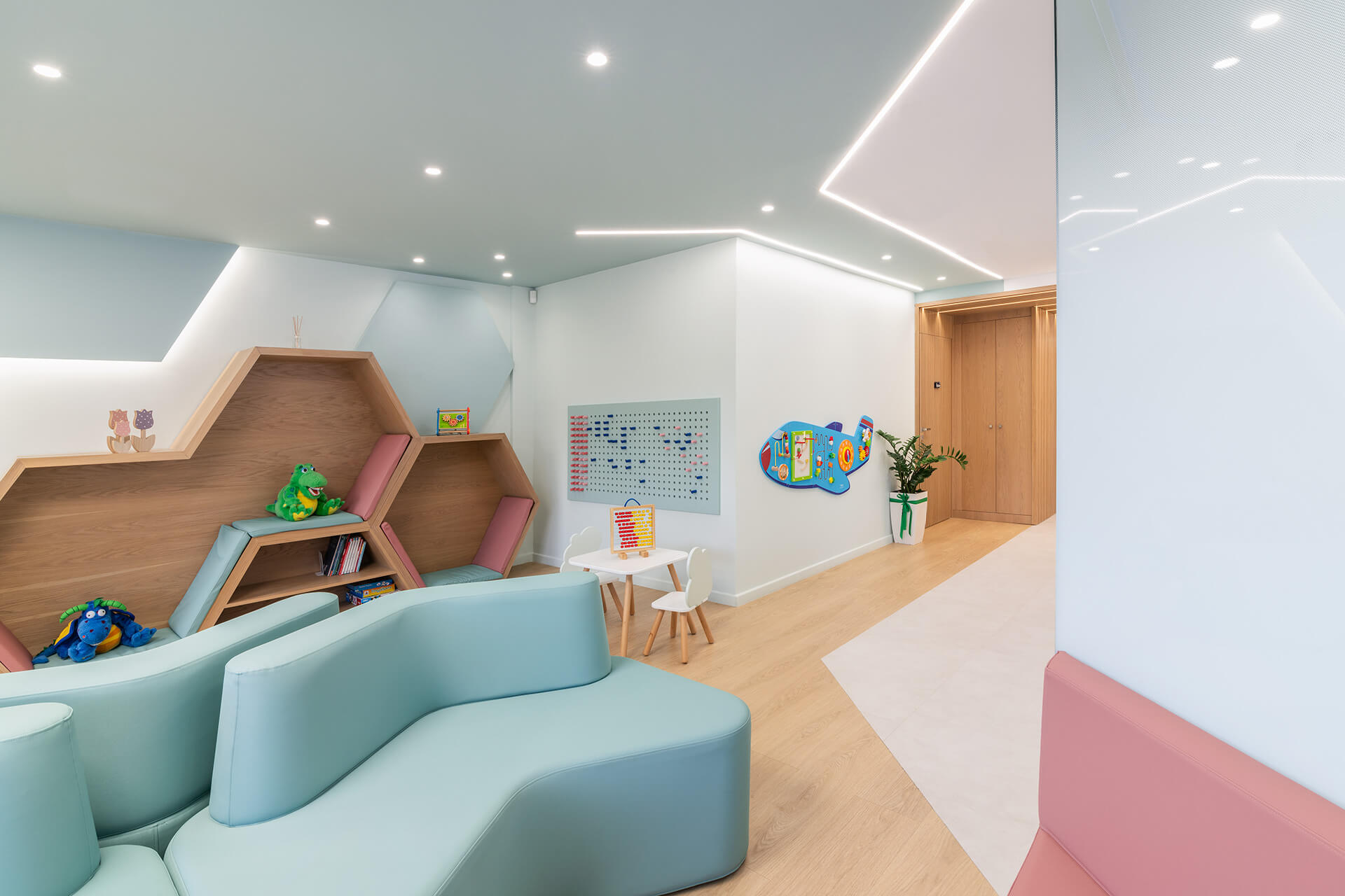 Η επιλογή των υλικών επικεντρώθηκε σε ανθεκτικές και φιλικές προς τα παιδιά επιφάνειες. Ξύλο, ζεστά χρώματα και υφές συνδυάστηκαν με μοντέρνα στοιχεία για να διαμορφώσουν έναν χώρο που ισορροπεί την οικειότητα με την υγιεινή και την ασφάλεια. Η κλινική εκμεταλλεύεται τη θέση της στον 3ο όροφο για να επιτρέψει στο φυσικό φως να διαχέεται στους εσωτερικούς χώρους. Η θέα προς την πόλη δημιουργεί μια αίσθηση ανοιχτότητας, ενώ η εσωτερική διαρρύθμιση ενισχύει την αίσθηση ηρεμίας και προστασίας.