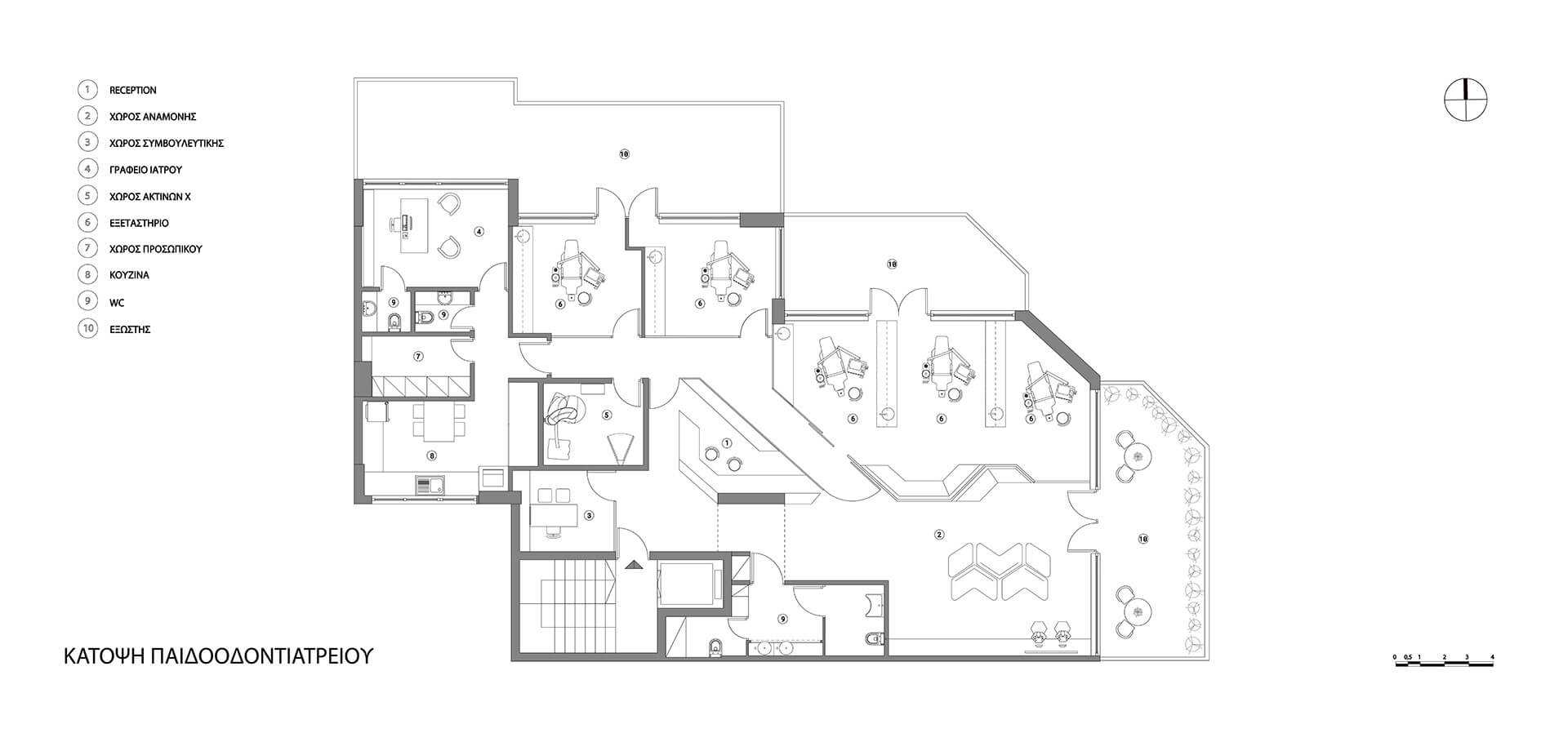 Ο σχεδιασμός οργανώθηκε γύρω από έναν κεντρικό διάδρομο που συνδέει τους χώρους υποδοχής, τις αίθουσες αναμονής και τα εξεταστήρια. Οι χώροι κατανέμονται με τρόπο που επιτρέπει άμεση πρόσβαση αλλά και σαφή διαχωρισμό μεταξύ δημόσιων και ιδιωτικών λειτουργιών. Οι αίθουσες θεραπείας και τα εξεταστήρια σχεδιάστηκαν με γνώμονα την άνεση των παιδιών και την εργονομία για τους οδοντιάτρους. Η χρήση χρωμάτων και παιχνιδιάρικων στοιχείων συμβάλλει στη δημιουργία θετικής εμπειρίας για τους μικρούς επισκέπτες.