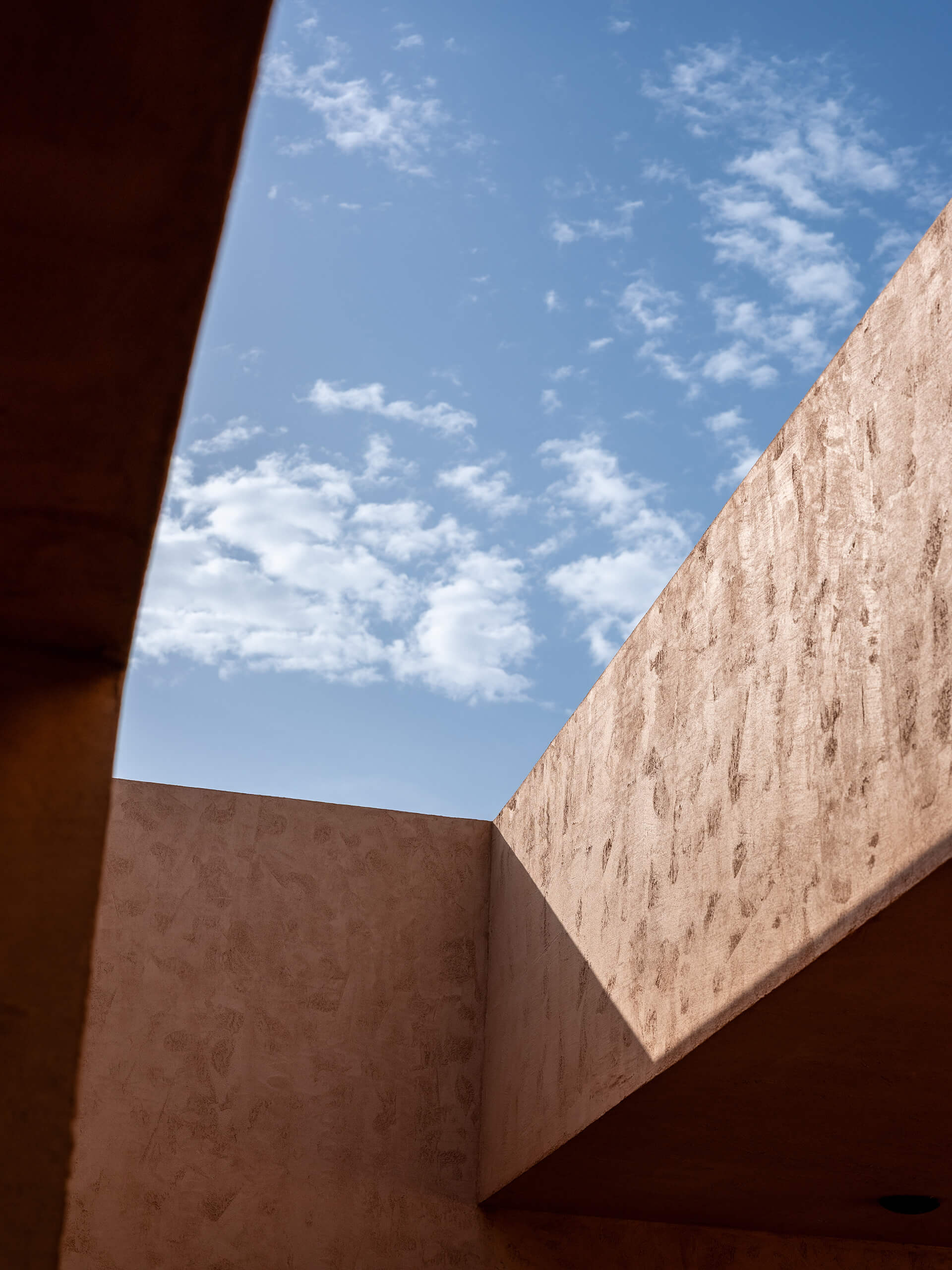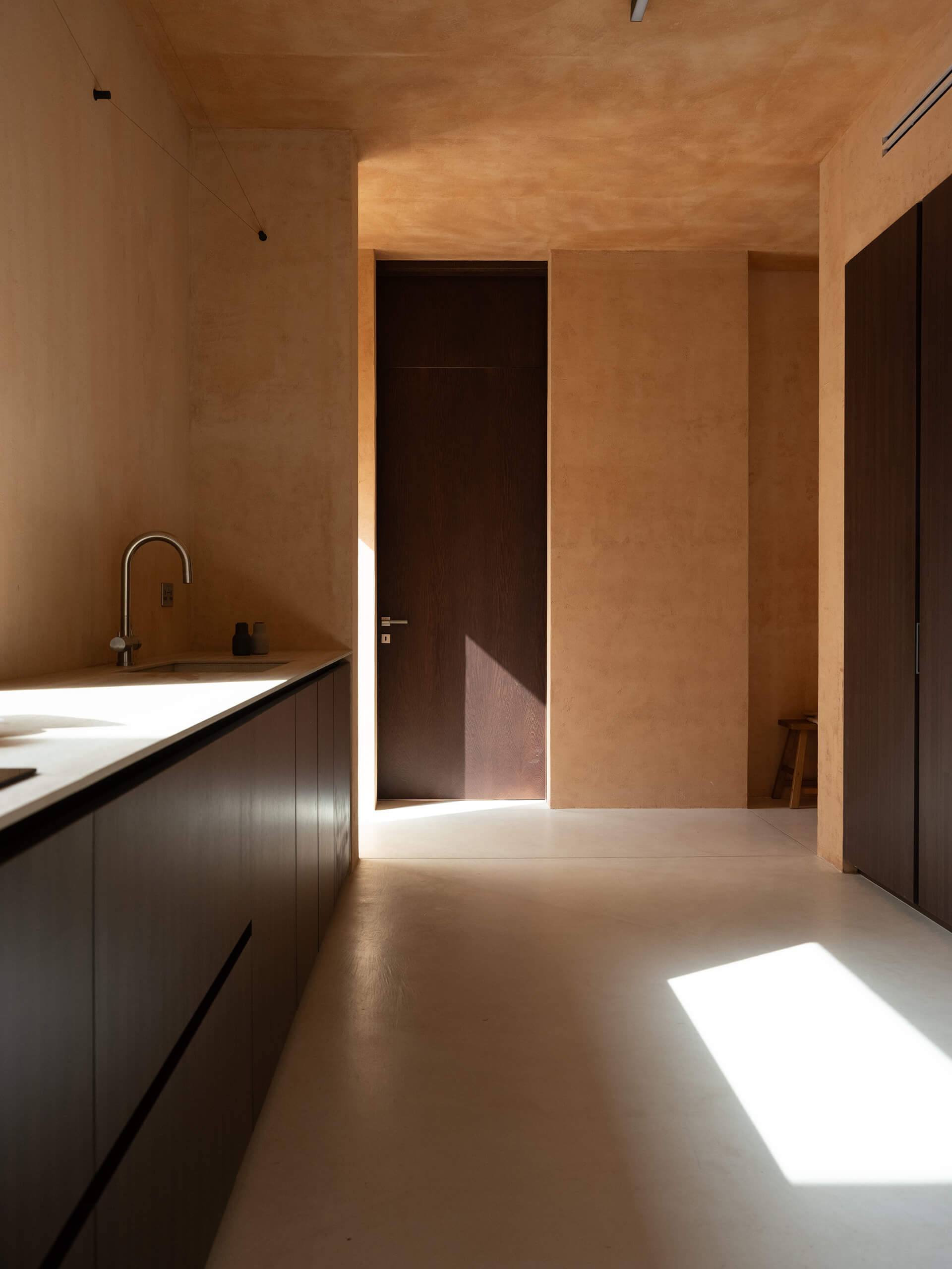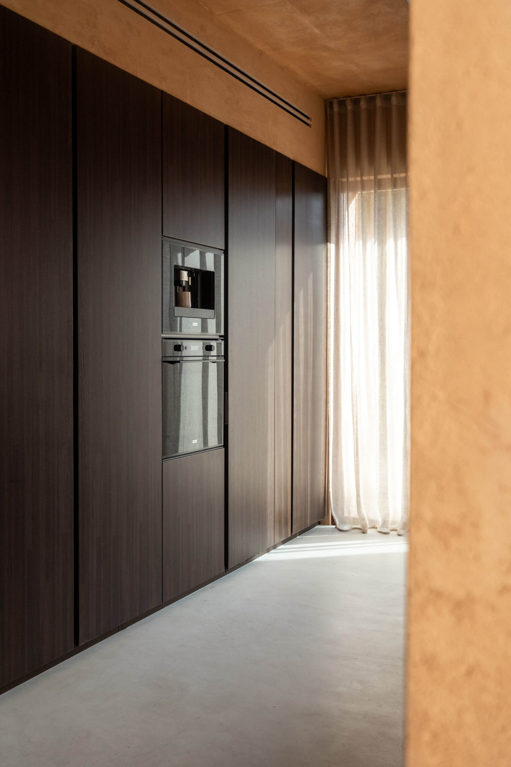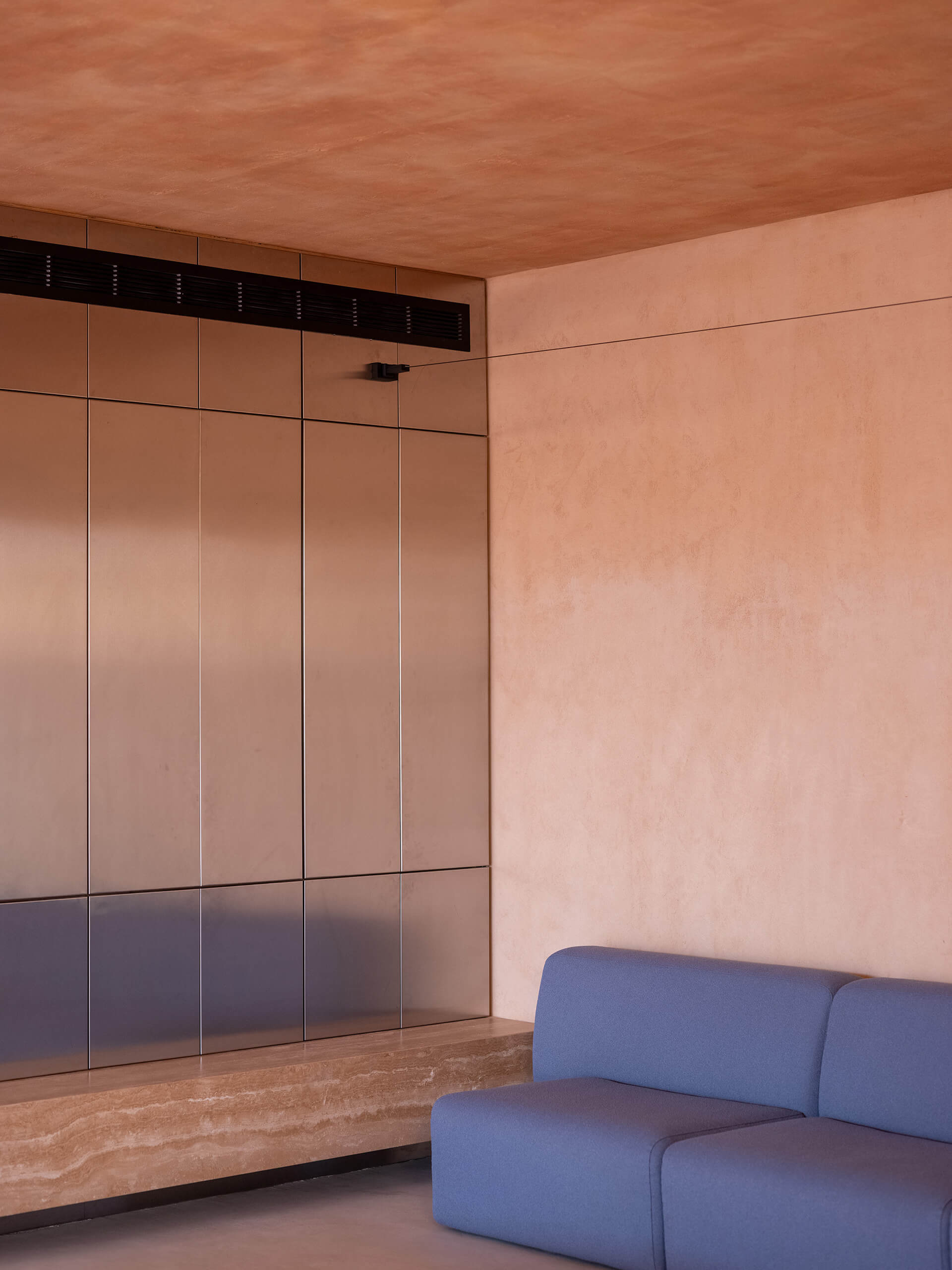 Η υλική στρατηγική βασίζεται σε φυσικές και απτικές επιφάνειες: σοβατισμένους τοίχους από τοιχοποιία, εμφανές σκυρόδεμα και ζεστές λεπτομέρειες από ξύλο. Αυτές οι επιλογές αντανακλούν τόσο τη διάρκεια όσο και τη σύνδεση με την παράδοση. Ο μονολιθικός χαρακτήρας της κατασκευής τονίζει τη μονιμότητα, ενώ οι εκλεπτυσμένες λεπτομέρειες εισάγουν άνεση και σύγχρονη ευαισθησία.
