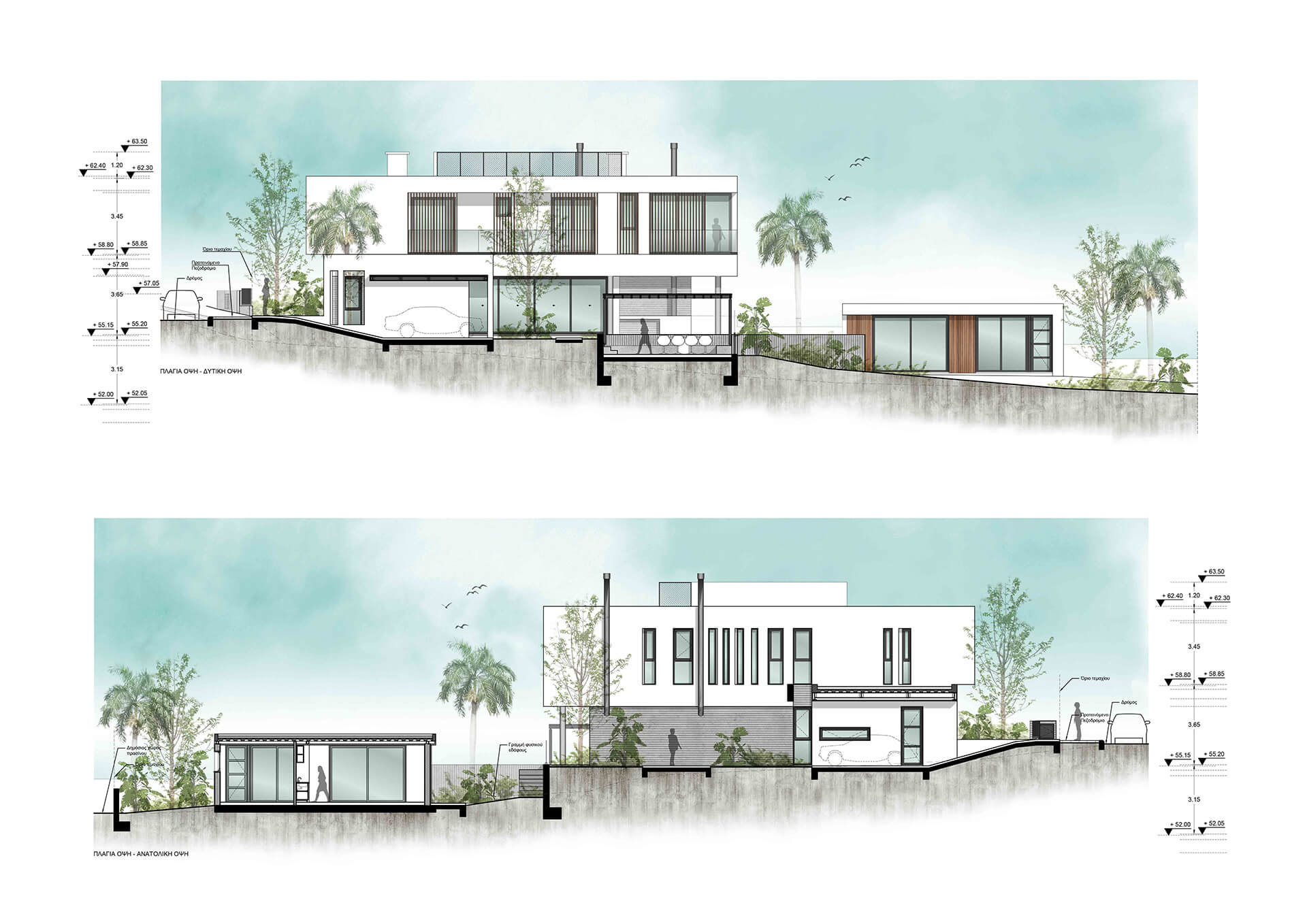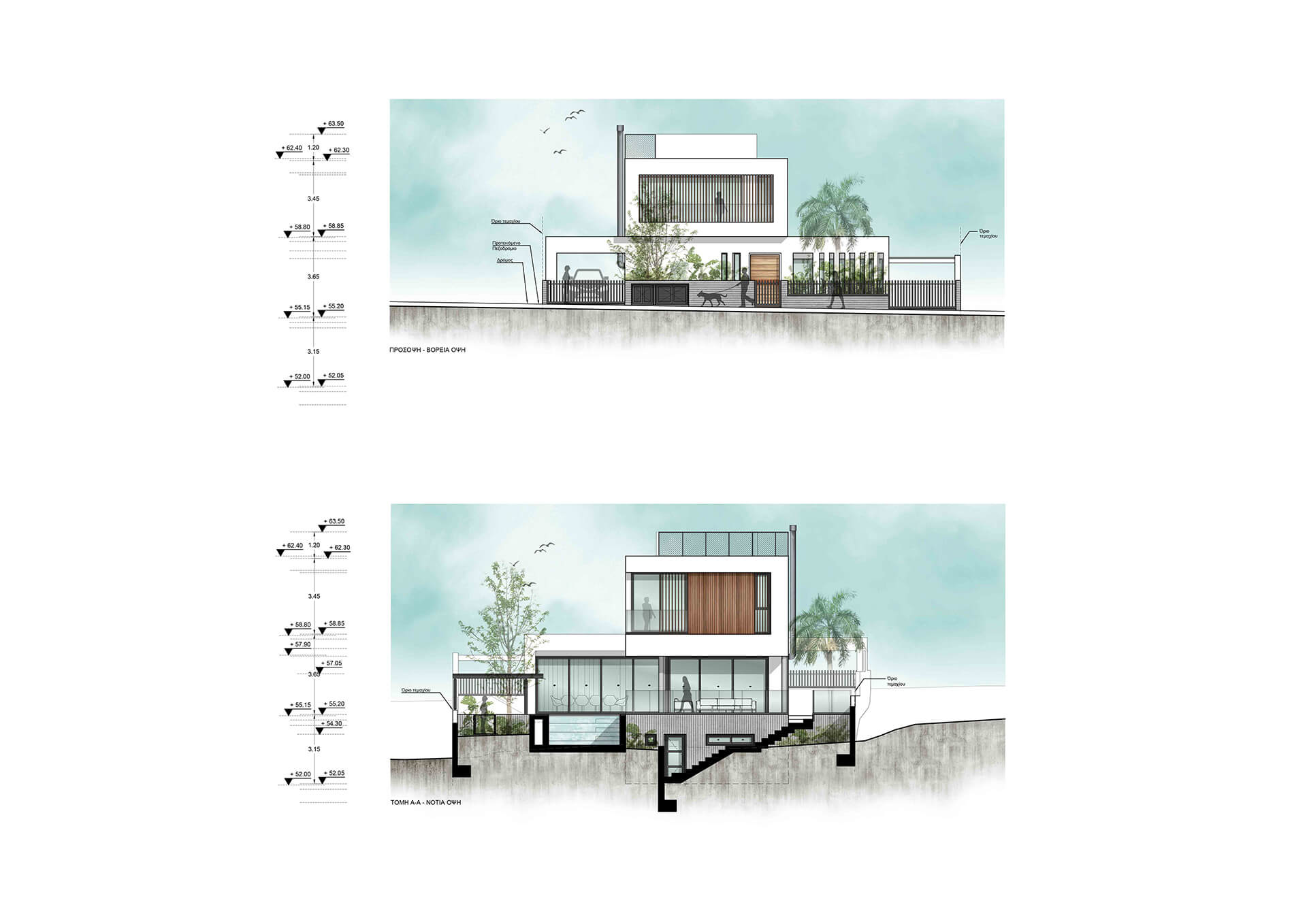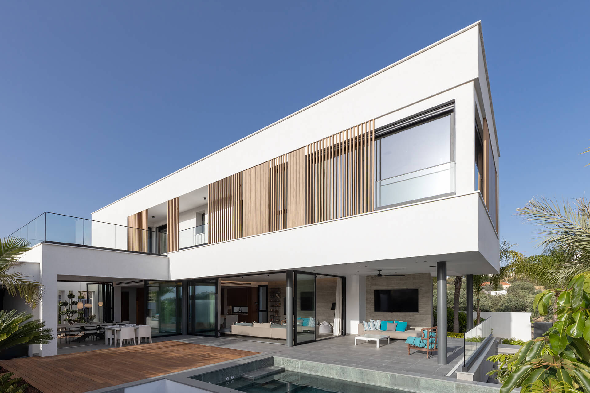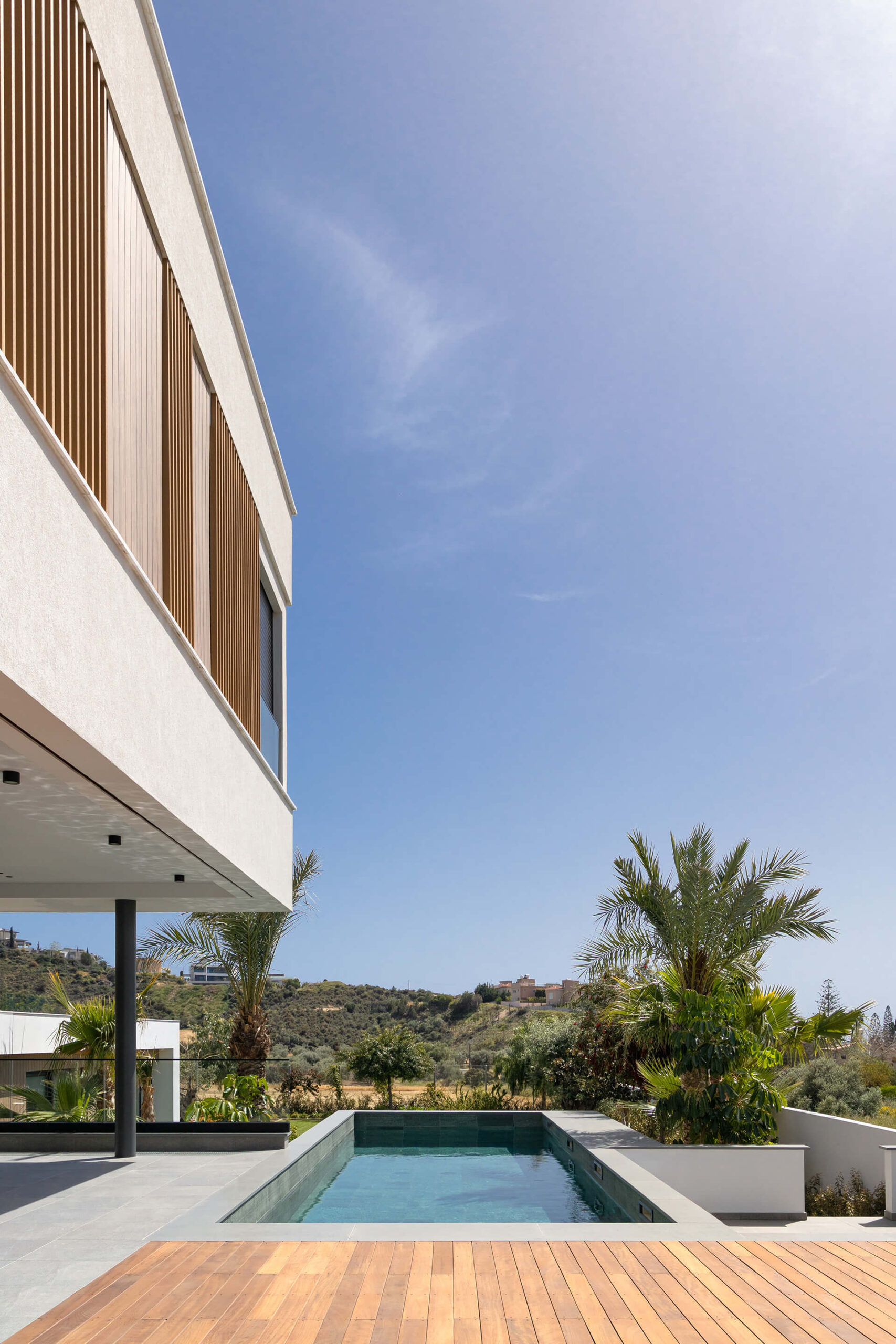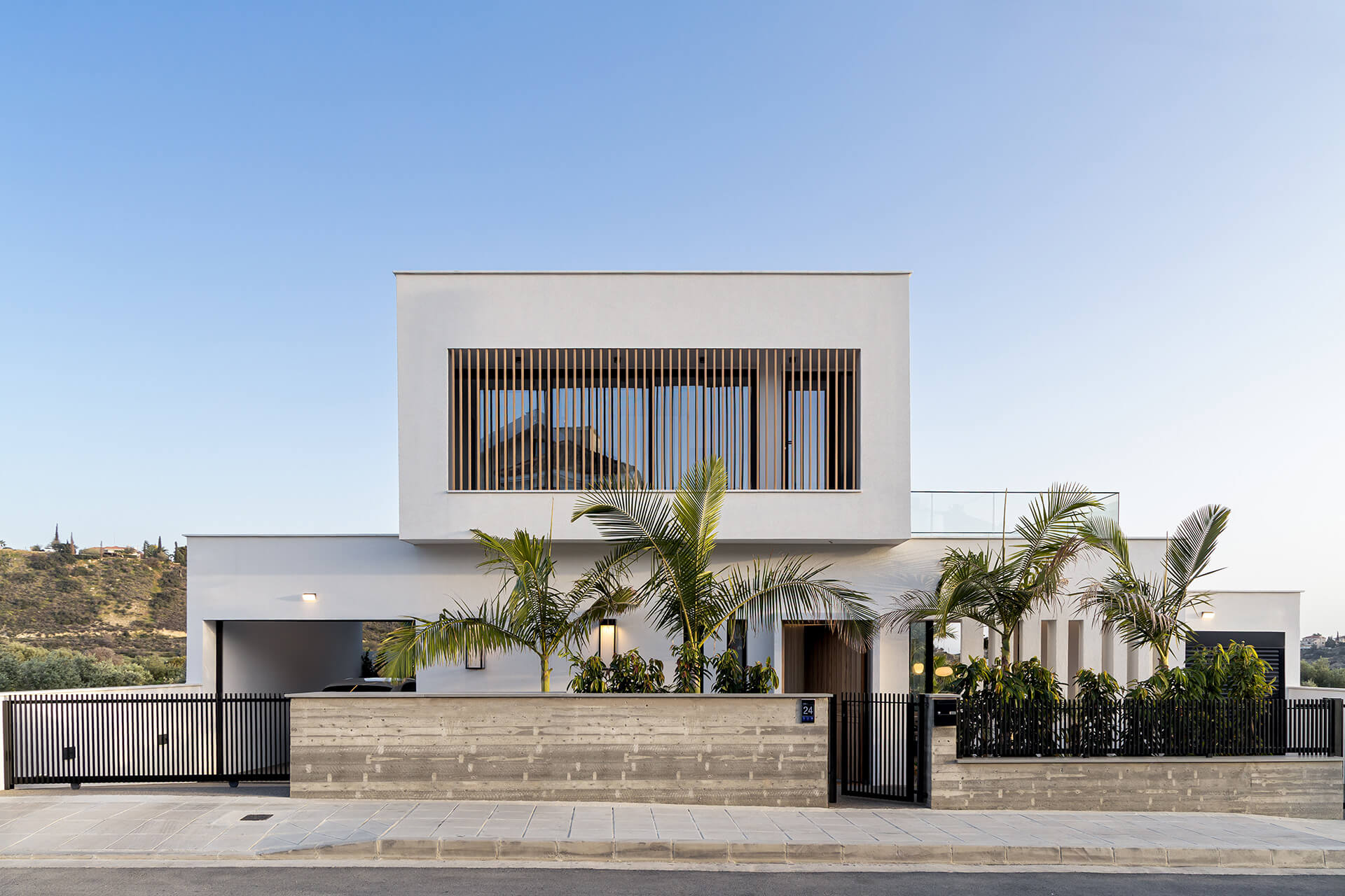 Η επιλογή των υλικών – σκυρόδεμα, πέτρα και ξύλο – αντικατοπτρίζει τη σχέση του κτιρίου με το φυσικό περιβάλλον, συνδυάζοντας ανθεκτικότητα και απλότητα. Η κατοικία αποτυπώνει τη σύγχρονη κυπριακή αρχιτεκτονική μέσα από τη σύνθεση καθαρών όγκων και την αίσθηση γαλήνης που προσφέρει.