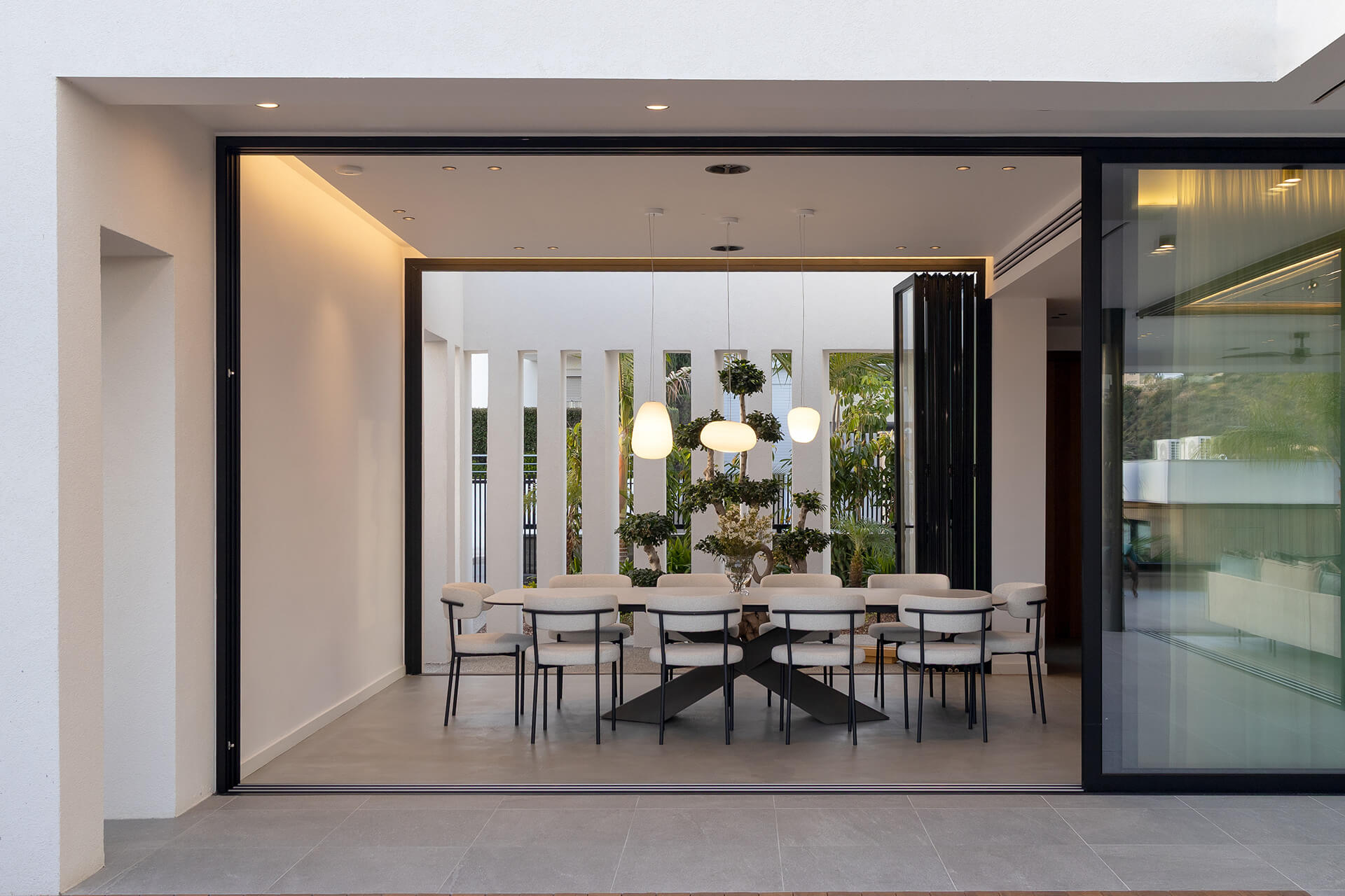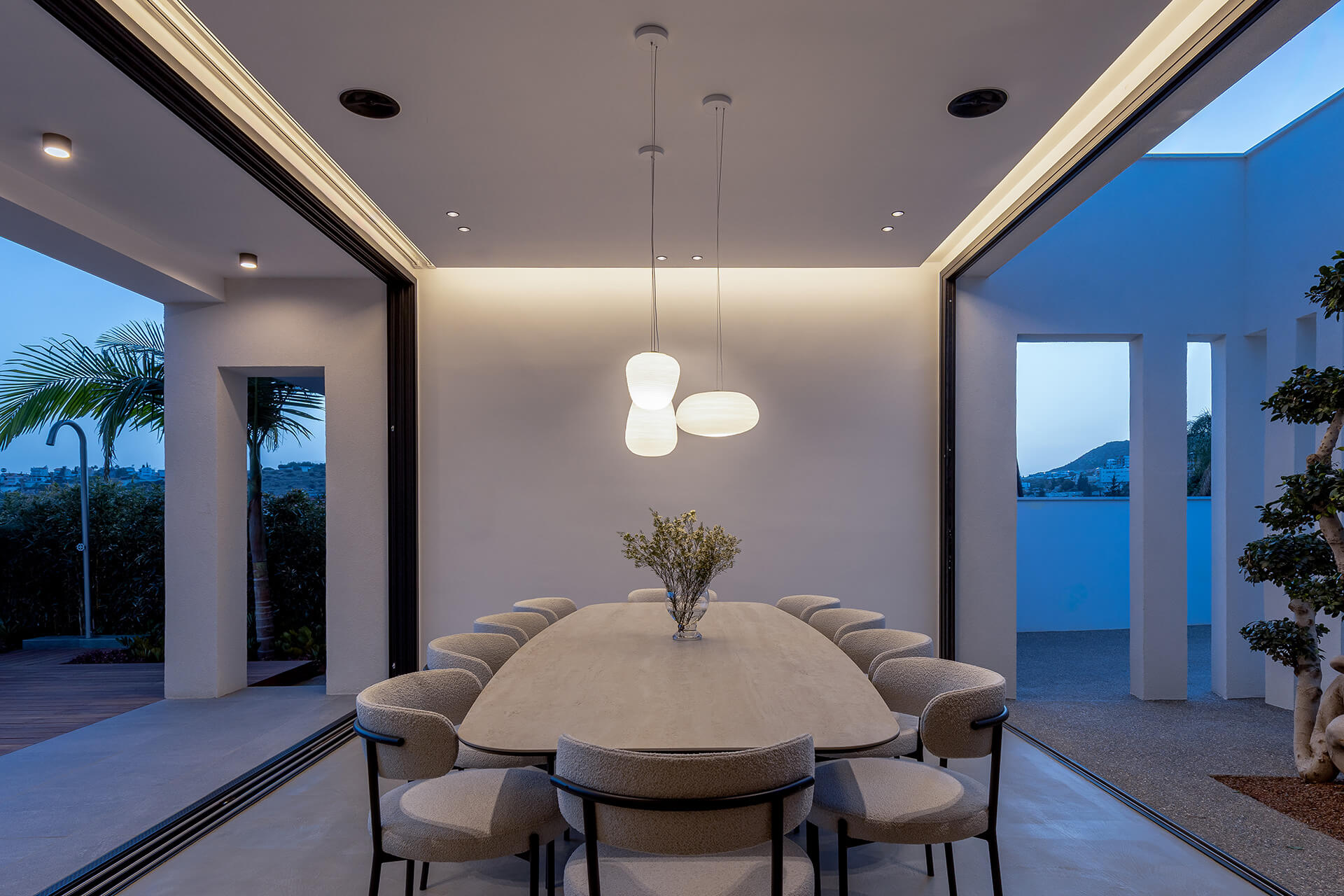 Η διάταξη οργανώνεται σε επίπεδα που ανταποκρίνονται στην κλίση του εδάφους, επιτρέποντας την ομαλή ροή μεταξύ εσωτερικών και εξωτερικών χώρων. Η κατοικία εκμεταλλεύεται τις οπτικές προς τη θάλασσα, ενώ προστατεύεται από τον άνεμο και τον ήλιο μέσω προσεκτικά τοποθετημένων στοών και ημιυπαίθριων περιοχών. Οι στοές και οι ημιυπαίθριοι χώροι λειτουργούν ως φίλτρα που προστατεύουν από τον ήλιο και τον άνεμο, προσφέροντας ταυτόχρονα σκίαση και διαβαθμίσεις ιδιωτικότητας.