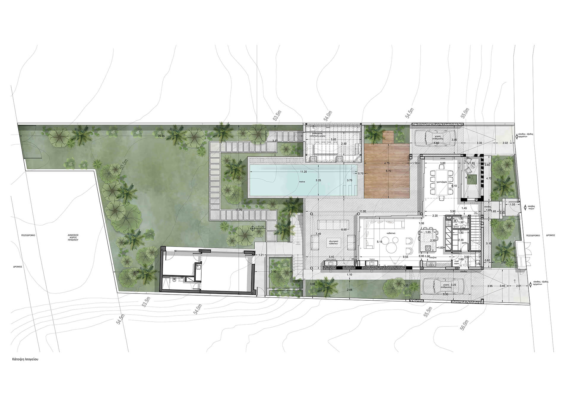 Η σύνθεση βασίστηκε στην ένταξη της αρχιτεκτονικής στον φυσικό περίγυρο, με στόχο τη δημιουργία μιας κατοικίας που ακολουθεί την τοπογραφία και αγκαλιάζει το τοπίο. Ο σχεδιασμός προσεγγίζει την έννοια της κατοικίας ως καταφυγίου, όπου η σχέση εσωτερικού και εξωτερικού γίνεται αδιάκοπη, επιτρέποντας στον κάτοικο να βιώνει τη φύση σε κάθε στιγμή της καθημερινότητας. Η μορφή και οι χαράξεις προκύπτουν από τις κινήσεις του εδάφους, μεταφράζοντας τη φυσική ροή του τόπου σε αρχιτεκτονική χειρονομία.