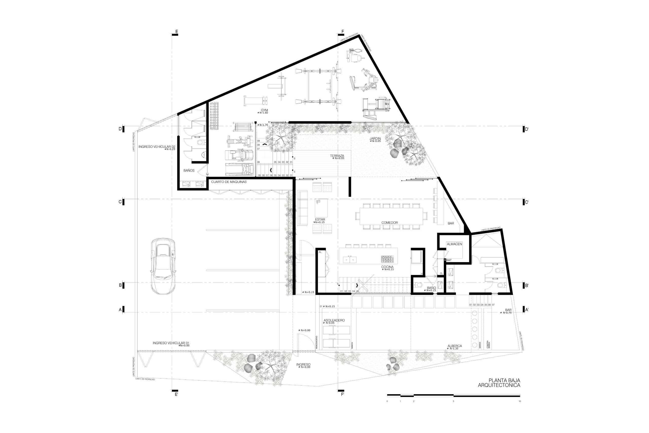 Η αρχιτεκτονική αξιοποιεί την φυσική κλίση του εδάφους για τη δημιουργία ενός ημιυπόγειου στο πίσω μέρος, προσφέροντας εργονομική διαρρύθμιση και αρμονία με το ανάγλυφο της γης. Στον επάνω όροφο διατάσσονται δύο καθαροί, γραμμικοί όγκοι, συνδεδεμένοι με μία γυάλινη επιφάνεια, οι οποίοι αποπνέουν κομψότητα και αρχιτεκτονική καθαρότητα. Οι εντυπωσιακοί πρόβολοι μήκους τεσσάρων μέτρων προσδίδουν ελαφρότητα και αιώρηση στη σύνθεση, ενώ η βάση, κατασκευασμένη εξ ολοκλήρου από εμφανές τούβλο, προσφέρει ζεστασιά και αίσθηση γείωσης.