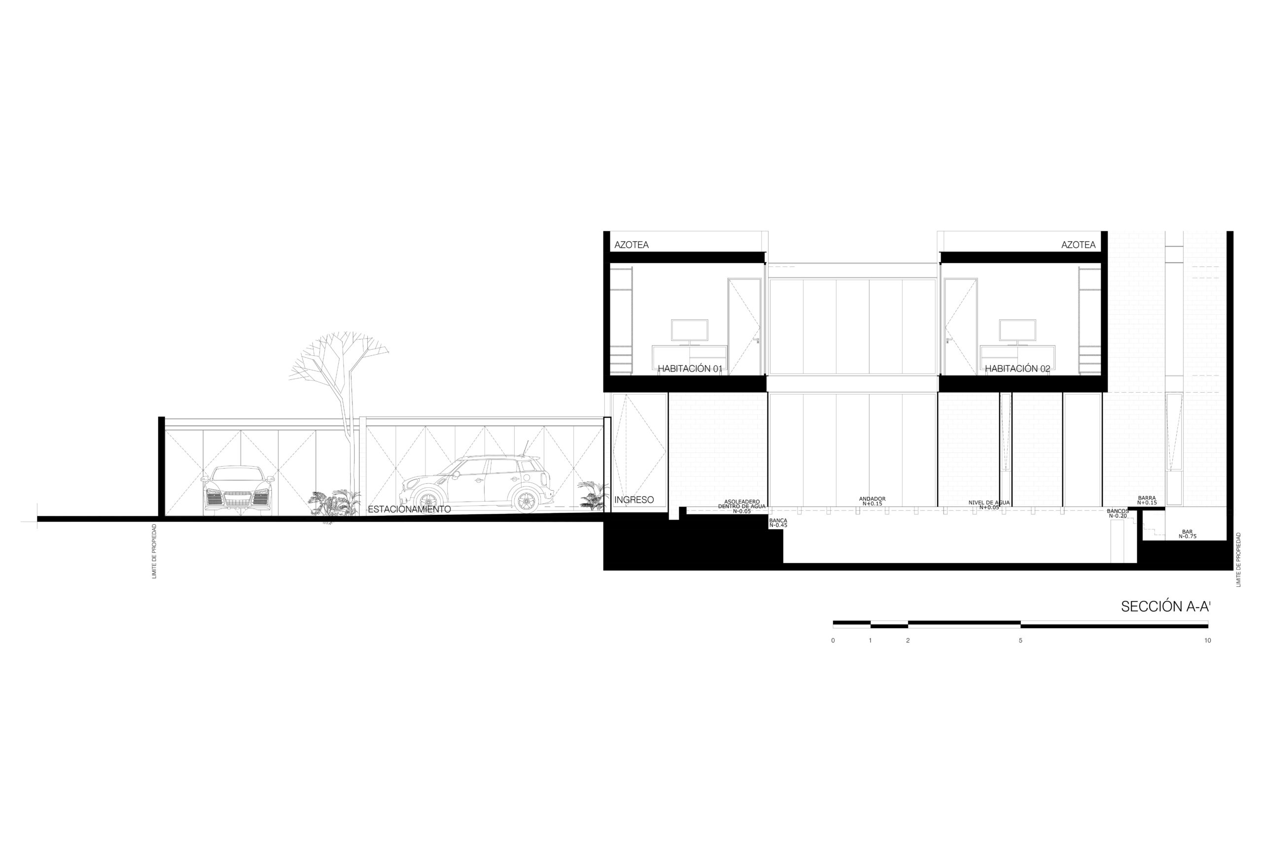 Η χρήση εμφανών τούβλων και σκυροδέματος αναδεικνύει τη δεξιοτεχνία των μαστόρων, η οποία αποτυπώνεται με ευαισθησία σε κάθε επιφάνεια. Η πέτρα στο δάπεδο ενισχύει τη σύνδεση με το φυσικό έδαφος, προσφέροντας μια αίσθηση γείωσης. Η πρόσοψη λειτουργεί ως “φίλτρο ιδιωτικότητας”, ενώ αντίθετα, η πίσω όψη ανοίγει προς το τοπίο, αποκαλύπτοντας μία δεντροφυτεμένη θέα και εκμεταλλευόμενη τον προσανατολισμό του οικοπέδου. Οι πλευρές των υπνοδωματίων έχουν οπτική επαφή με την πισίνα, δημιουργώντας εσωτερικές συνδέσεις που, στο ισόγειο, υποδέχονται τον επισκέπτη με ένα υδάτινο στοιχείο που θυμίζει μεγάλο καθρέφτη.