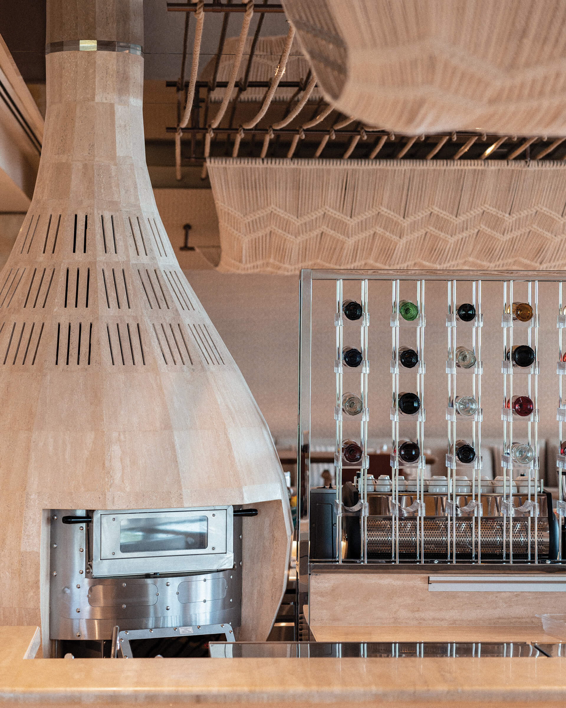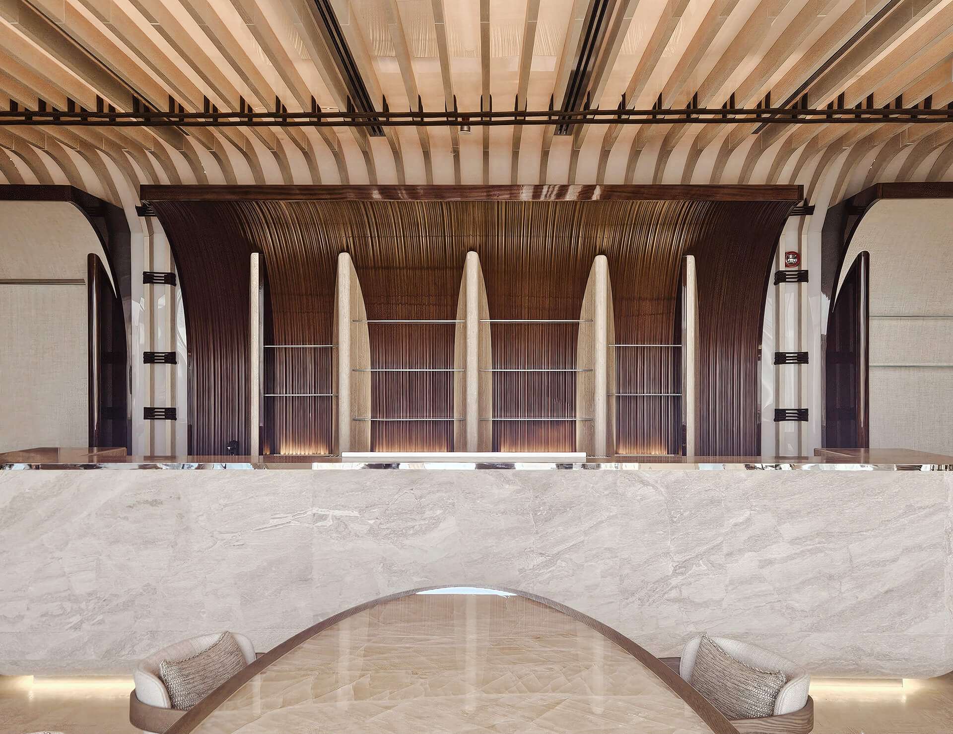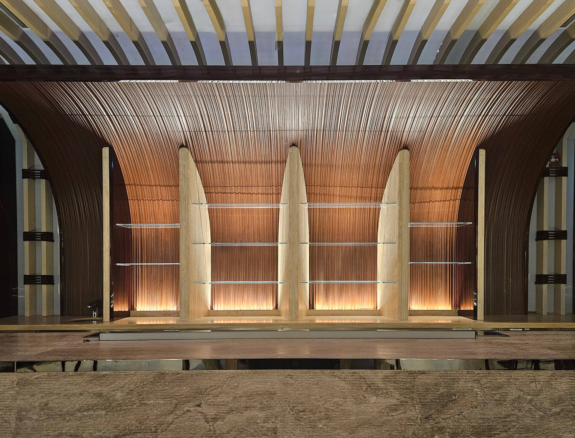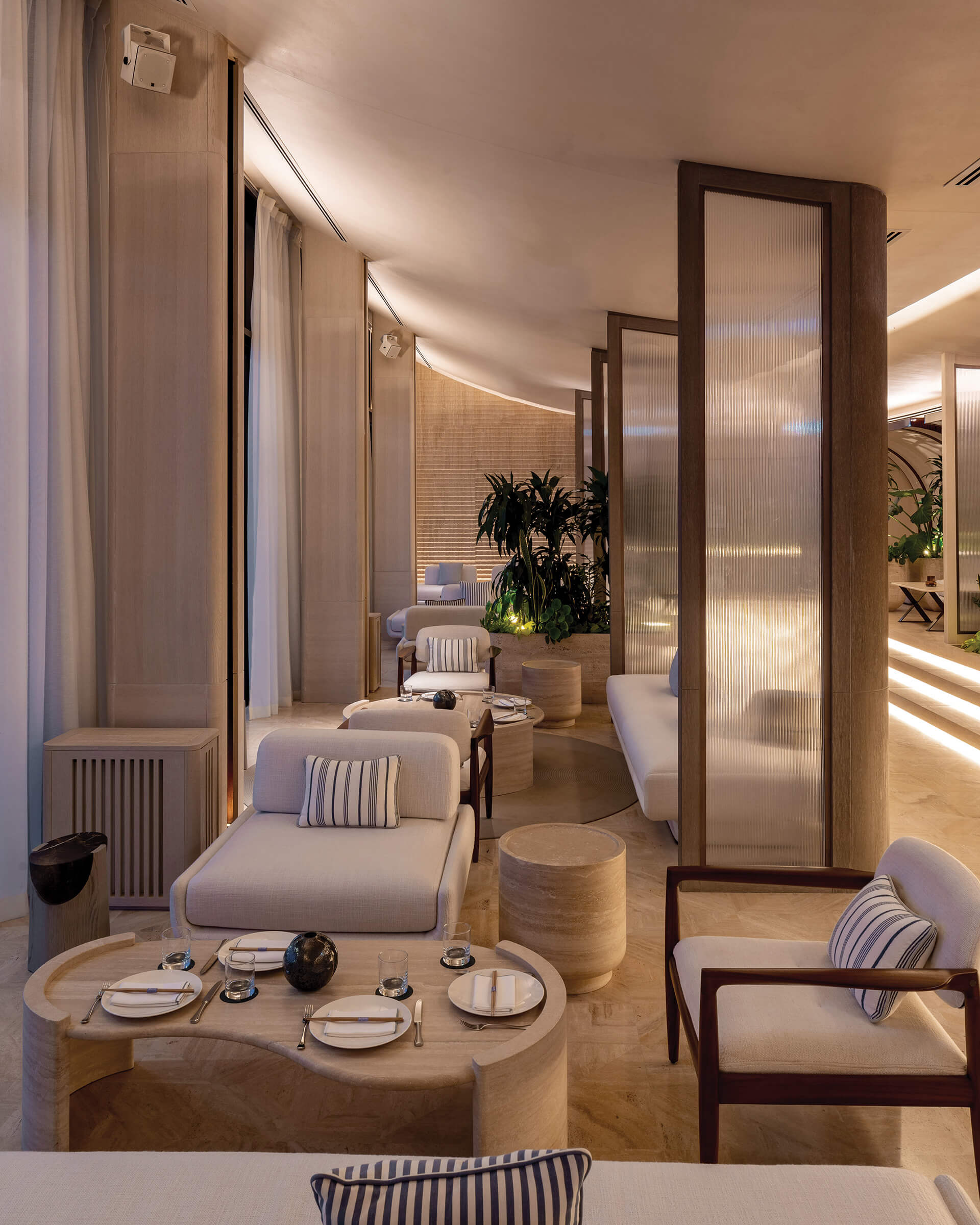 Η επιλογή των υλικών ενισχύει την ίδια αίσθηση ροής και συνέχειας. Τραβερτίνο, ξυλεία δρυός, teak και iroko, ραβδωτό γυαλί, γλυπτικές λεπτομέρειες και επενδύσεις από φυσικές ίνες συνθέτουν ένα θερμό και απτικό περιβάλλον.