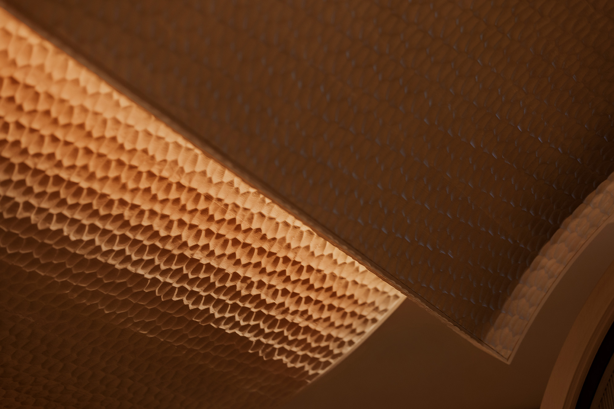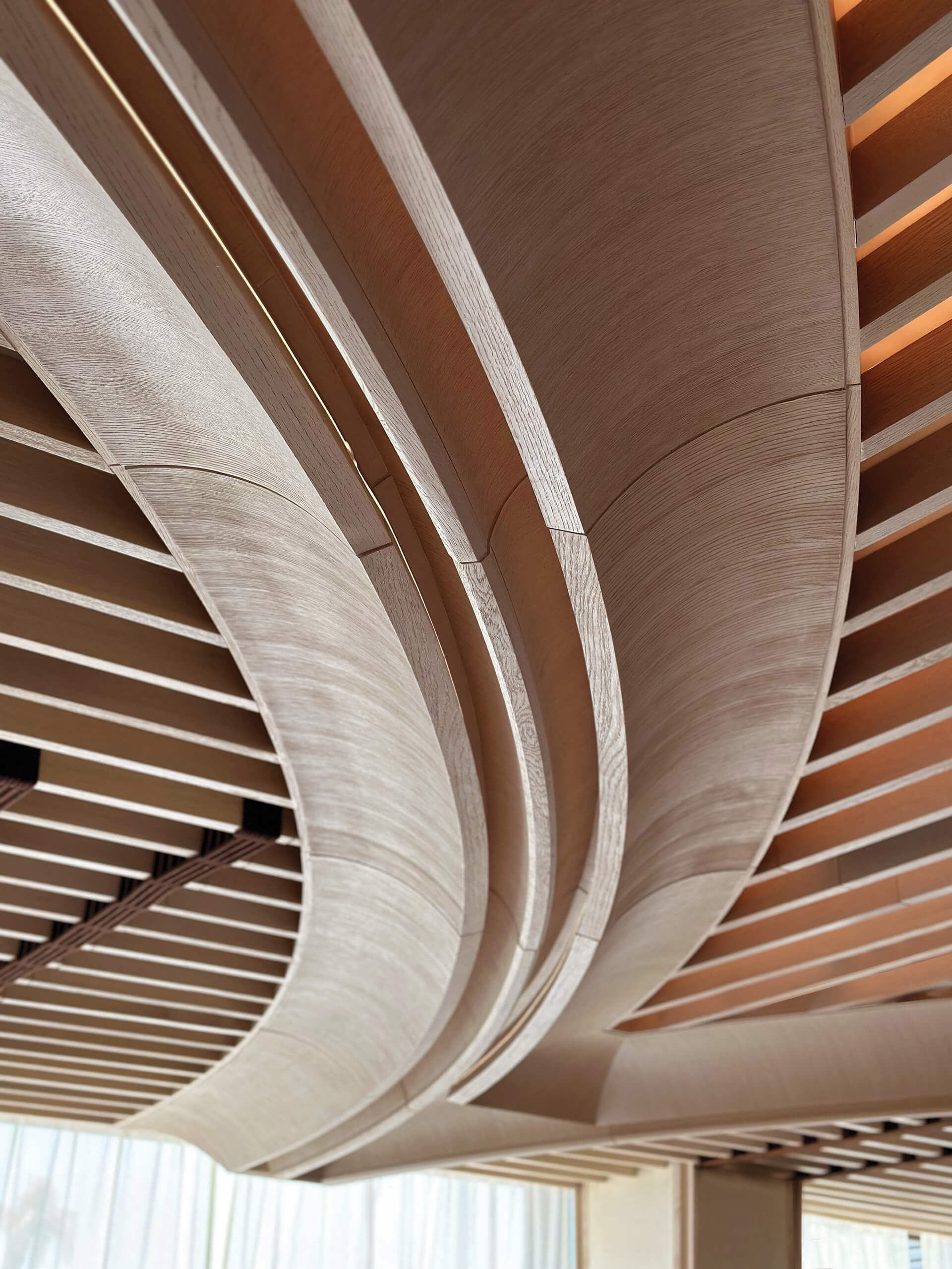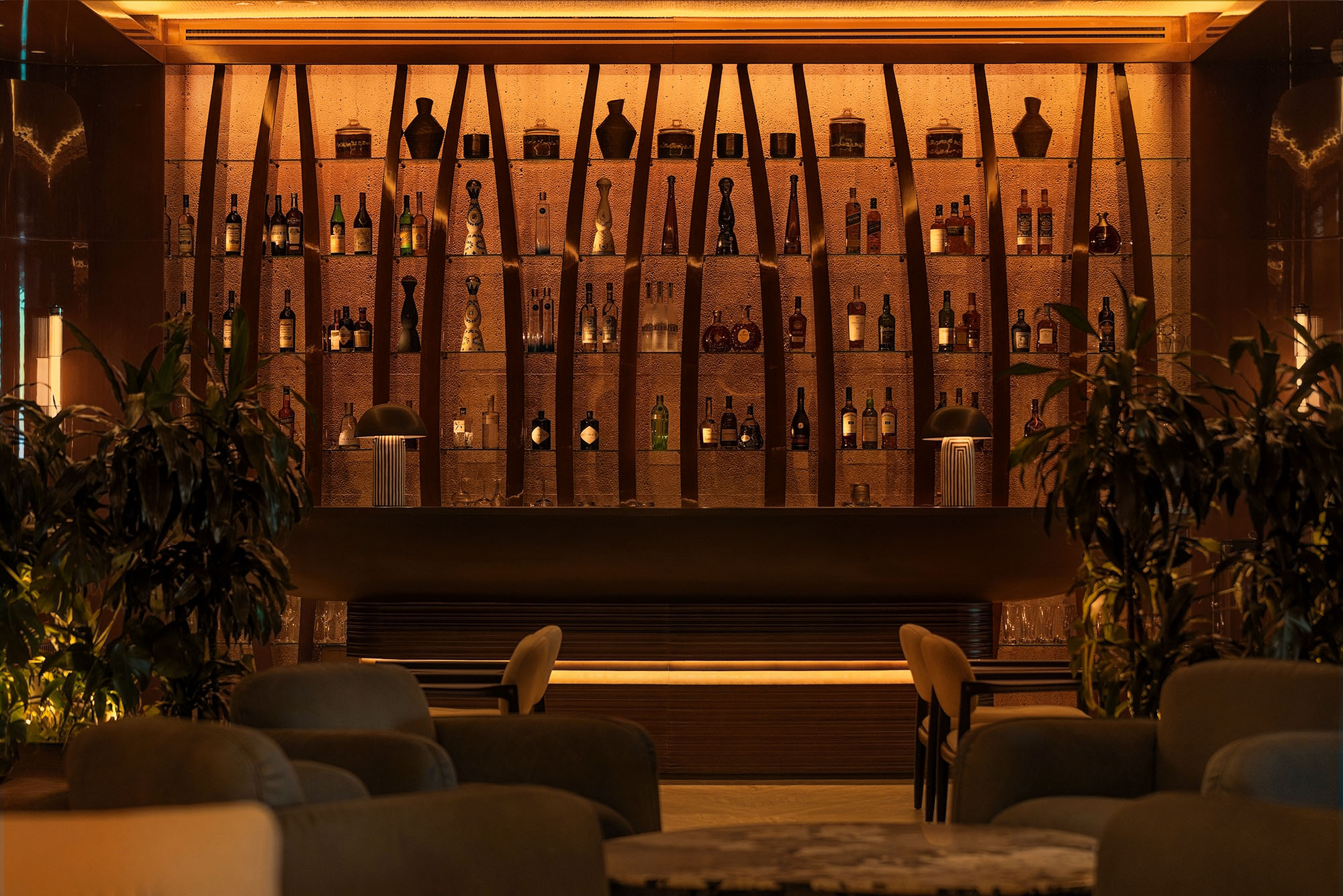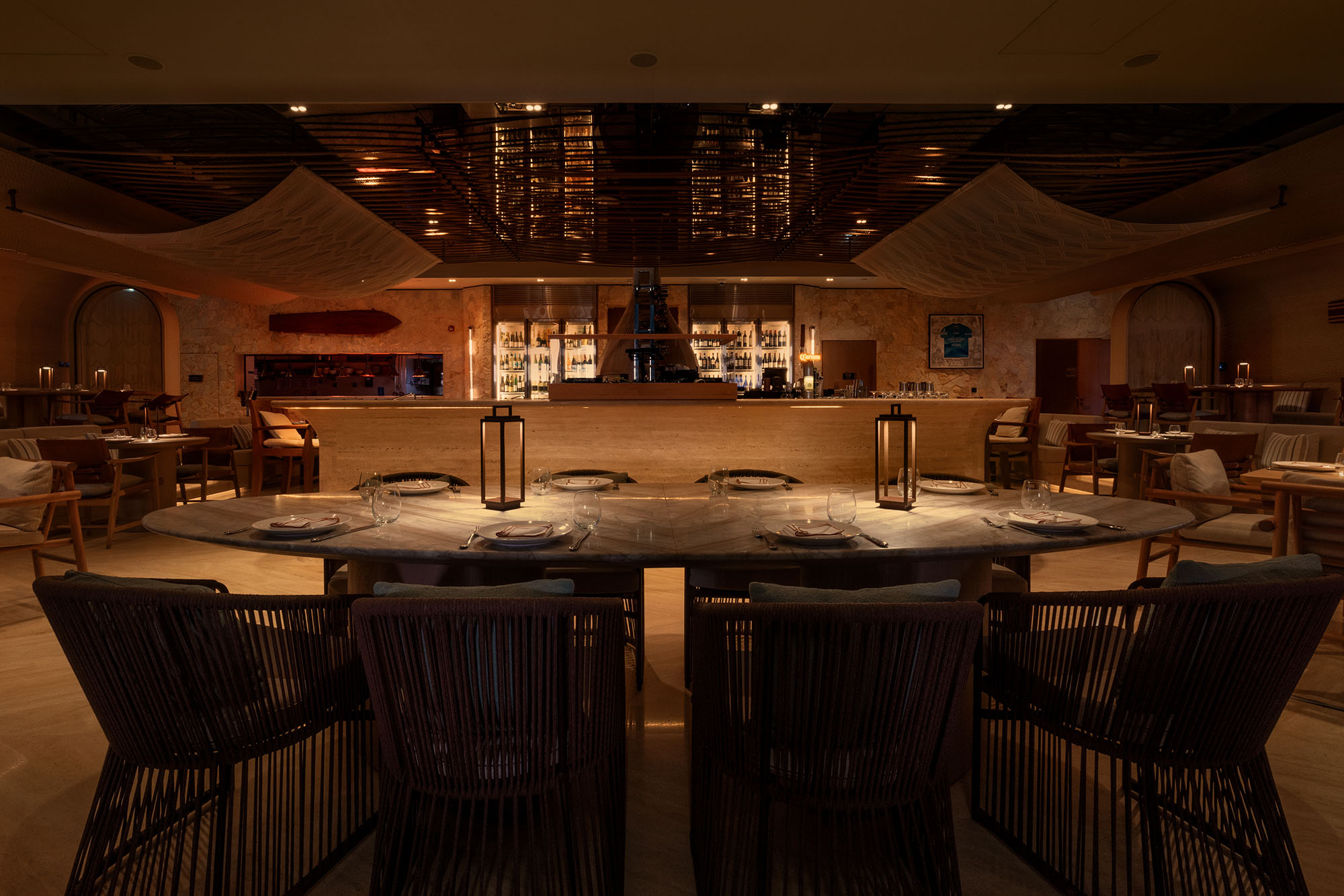 Η επιλογή των υλικών ενισχύει την ίδια αίσθηση ροής και συνέχειας. Τραβερτίνο, ξυλεία δρυός, teak και iroko, ραβδωτό γυαλί, γλυπτικές λεπτομέρειες και επενδύσεις από φυσικές ίνες συνθέτουν ένα θερμό και απτικό περιβάλλον.