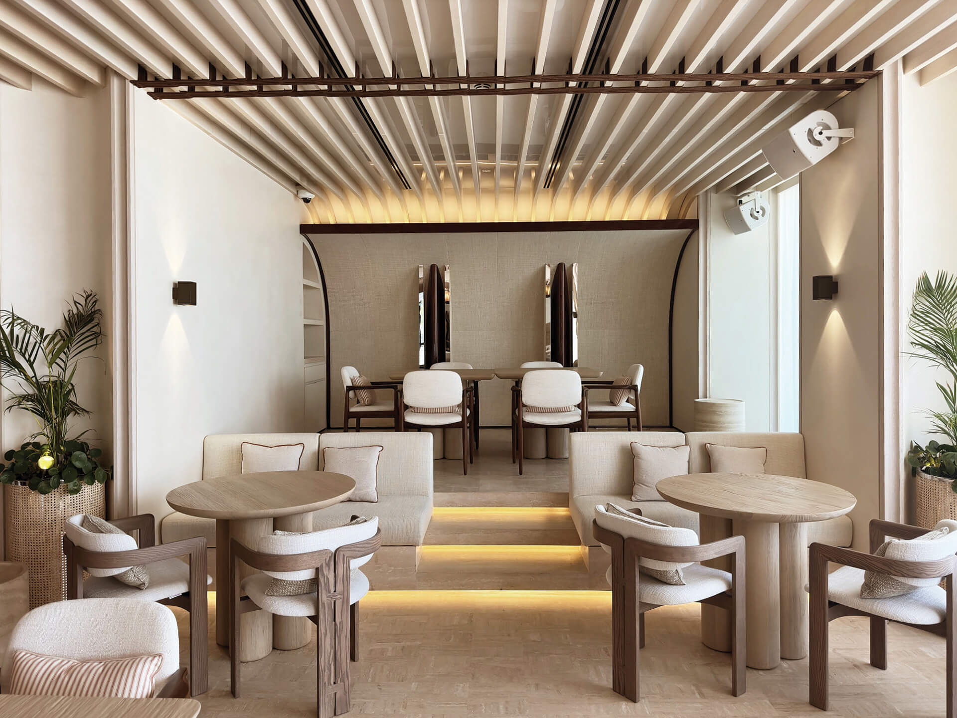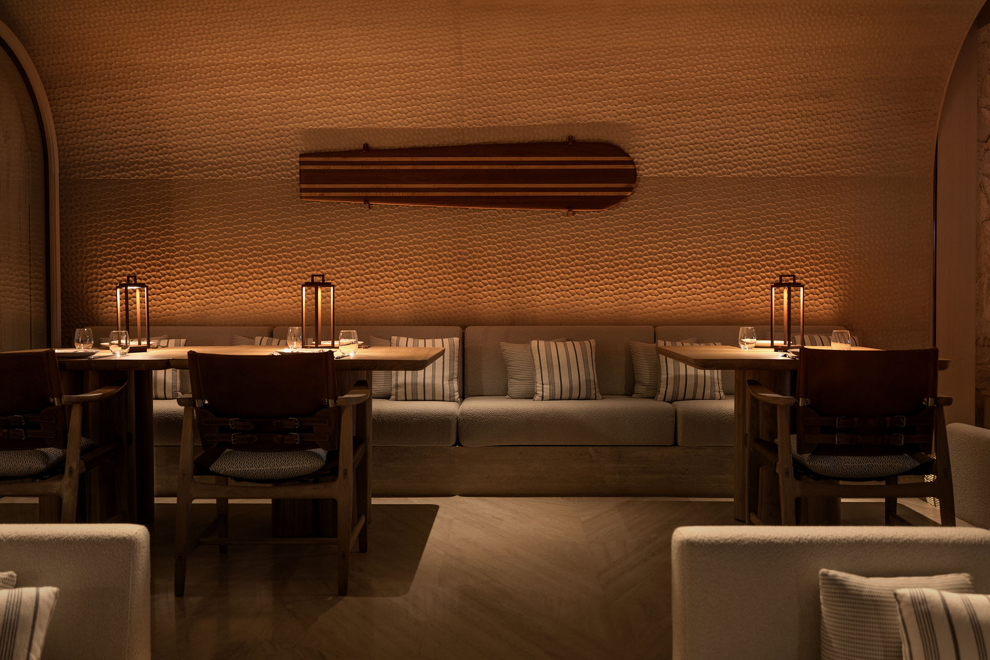 Αντίστοιχα, το Nalu Surf Club ενσαρκώνει τον ζωντανό και ανεπιτήδευτο παλμό του surf lifestyle. Θερμοί τόνοι και υφές που θυμίζουν άμμο, αλάτι και φθαρμένο ξύλο συγκροτούν ένα πιο γήινο περιβάλλον. Το ισόγειο επίπεδο παραμένει ενεργό και ζωντανό καθ’ όλη τη διάρκεια της ημέρας, ενώ στον πρώτο όροφο το VIP lounge προσφέρει μια πιο ιδιωτική και εσωστρεφή εμπειρία.