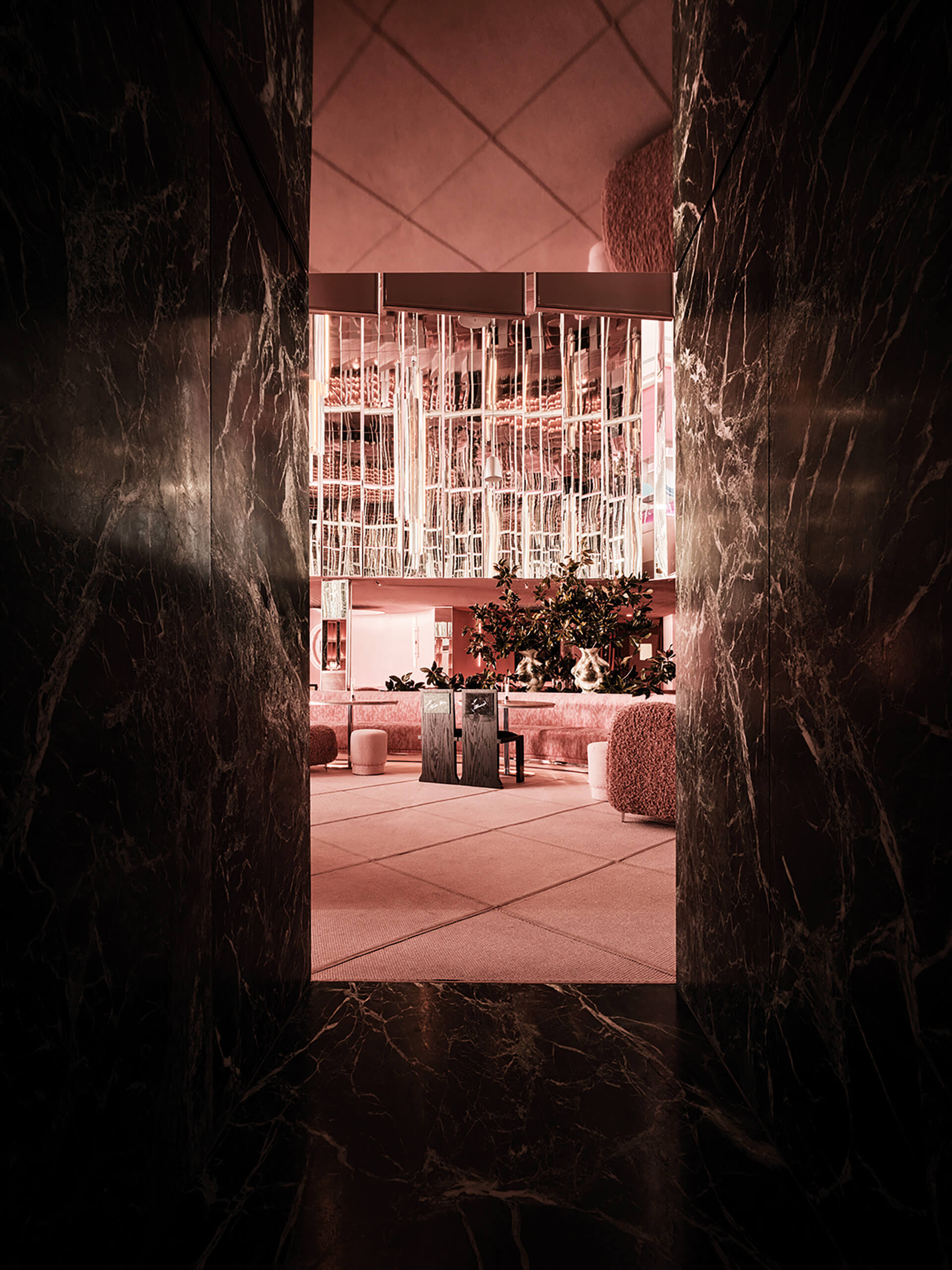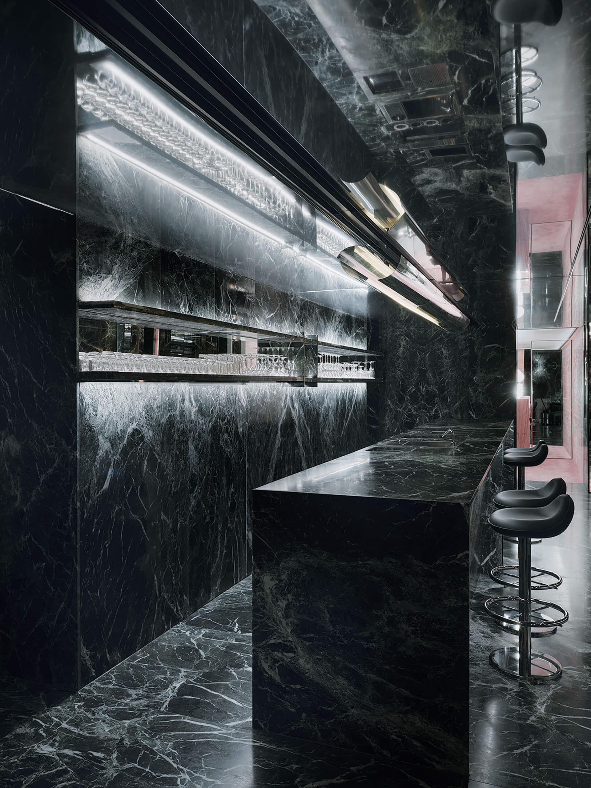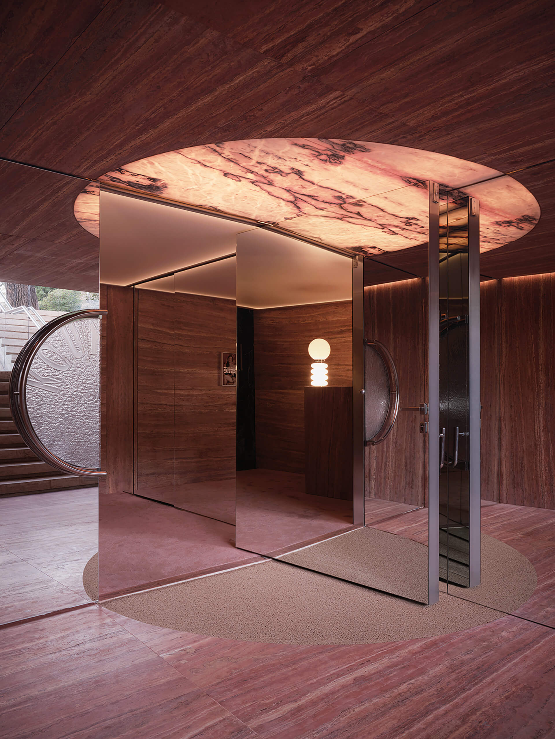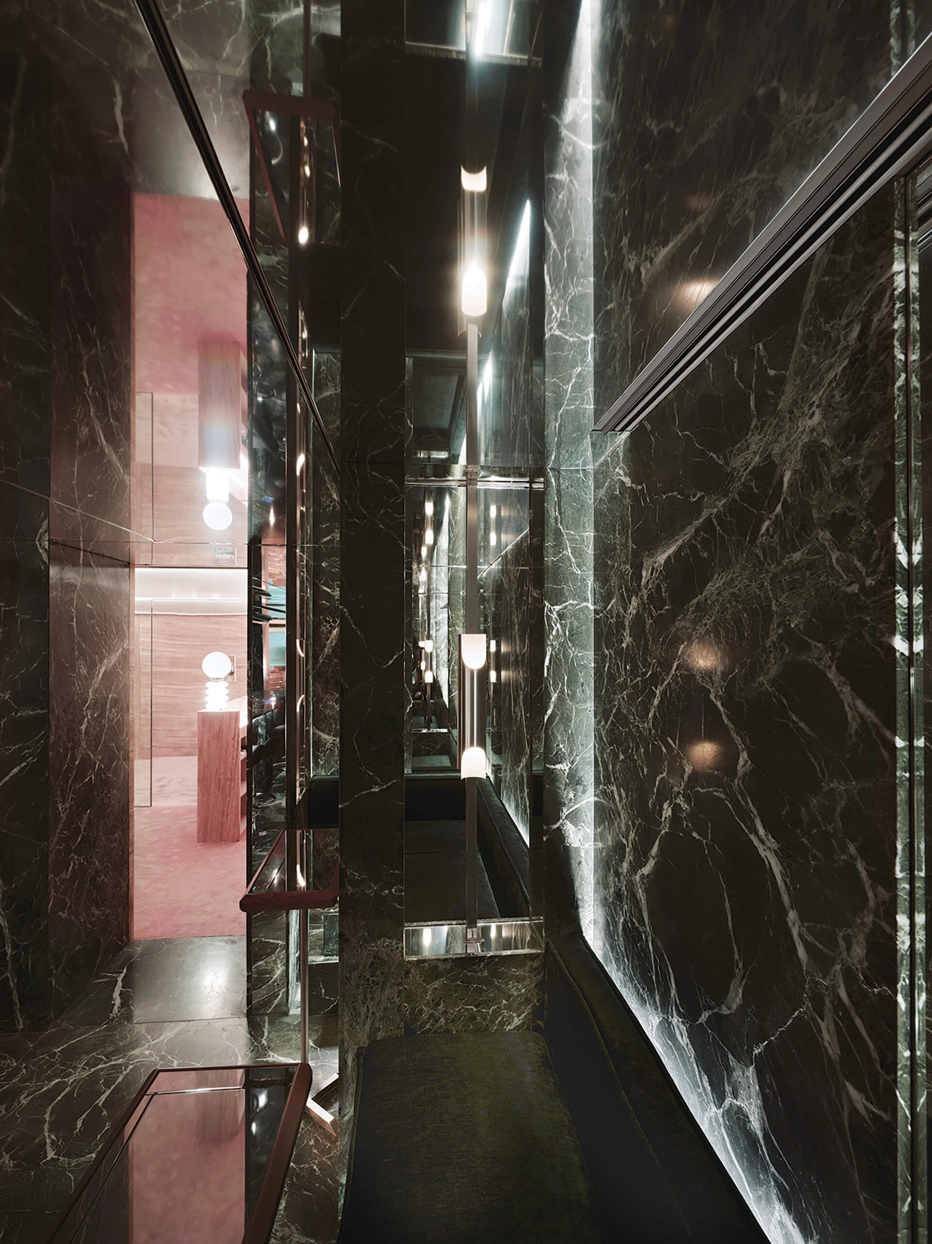 Μία επιβλητικού μεγέθους περιστροφική πόρτα οδηγεί στο Foyer, έναν χώρο υποδοχής σε ροζ απόχρωση με απαλό διάχυτο φωτισμό. Εκεί, δύο επιφάνειες travertino σε συμμετρική διάταξη, πλαισιωμένες από καθρέφτη, αποδίδουν την έννοια της πολυτέλειας μέσα από μια ισχυρή δήλωση, αναδεικνύοντας την ανεκτίμητη αξία του σχεδόν άδειου χώρου. Μία κρυφή πόρτα οδηγεί στο Parlor, έναν πρώτο χώρο bar που επενδύεται ολόκληρος με σκούρο πράσινο μάρμαρο Τήνου. Το συγκεκριμένο πέτρωμα, το οποίο για μεγάλο διάστημα θεωρούνταν ευτελές εξαιτίας των ακανόνιστων αποχρωματισμών του, μετατρέπεται σε banquettes, DJ booth, ράφια και bar, σαν να έχουν βγει όλα από τον ίδιο μονόλιθο. Η επένδυση καθρέφτη στην οροφή διευρύνει τον χώρο, ενώ vintage απλίκες από ανοξείδωτο χάλυβα και ένας custom πολυέλαιος προσφέρουν θερμό, έμμεσο φωτισμό.
