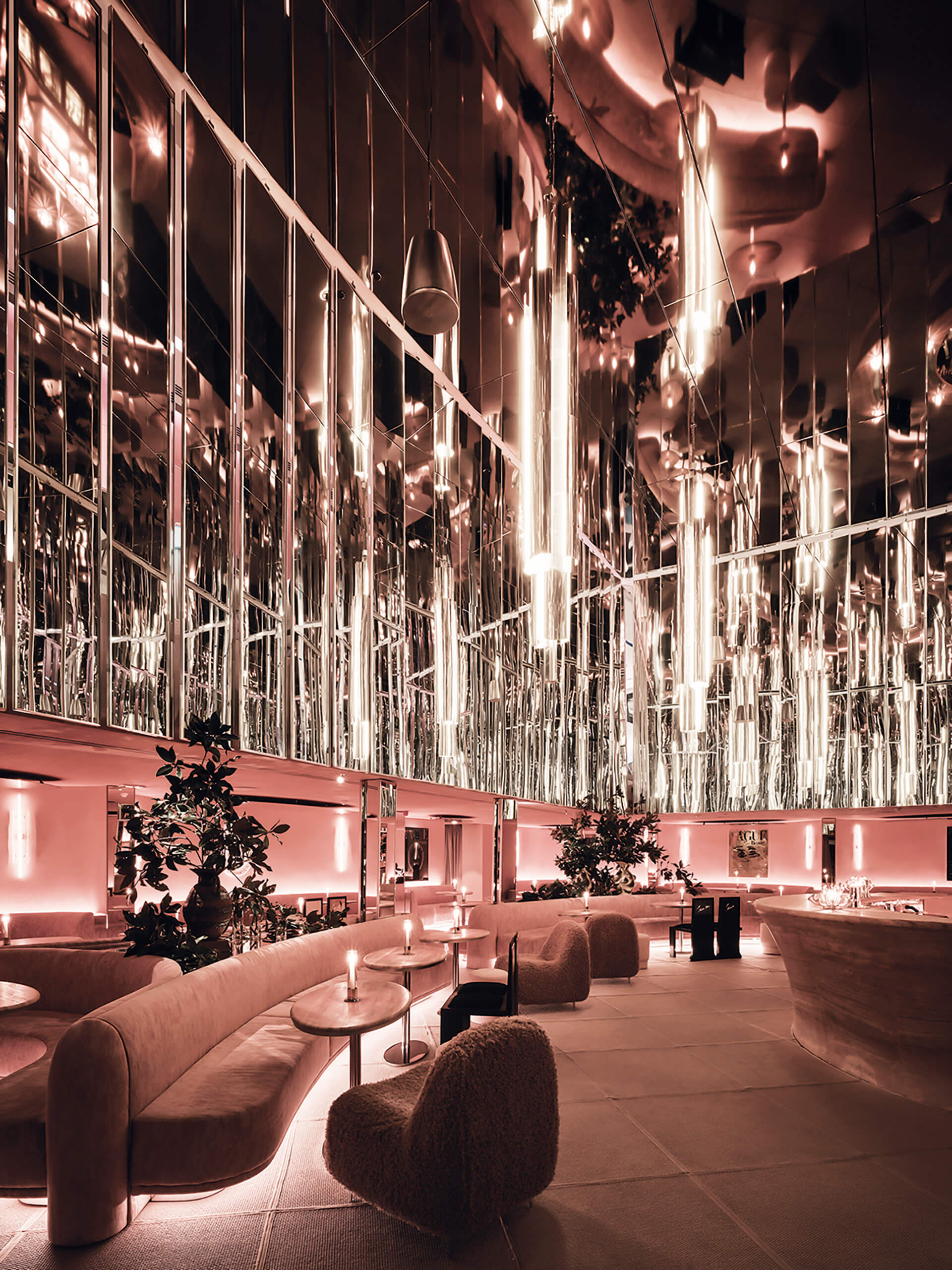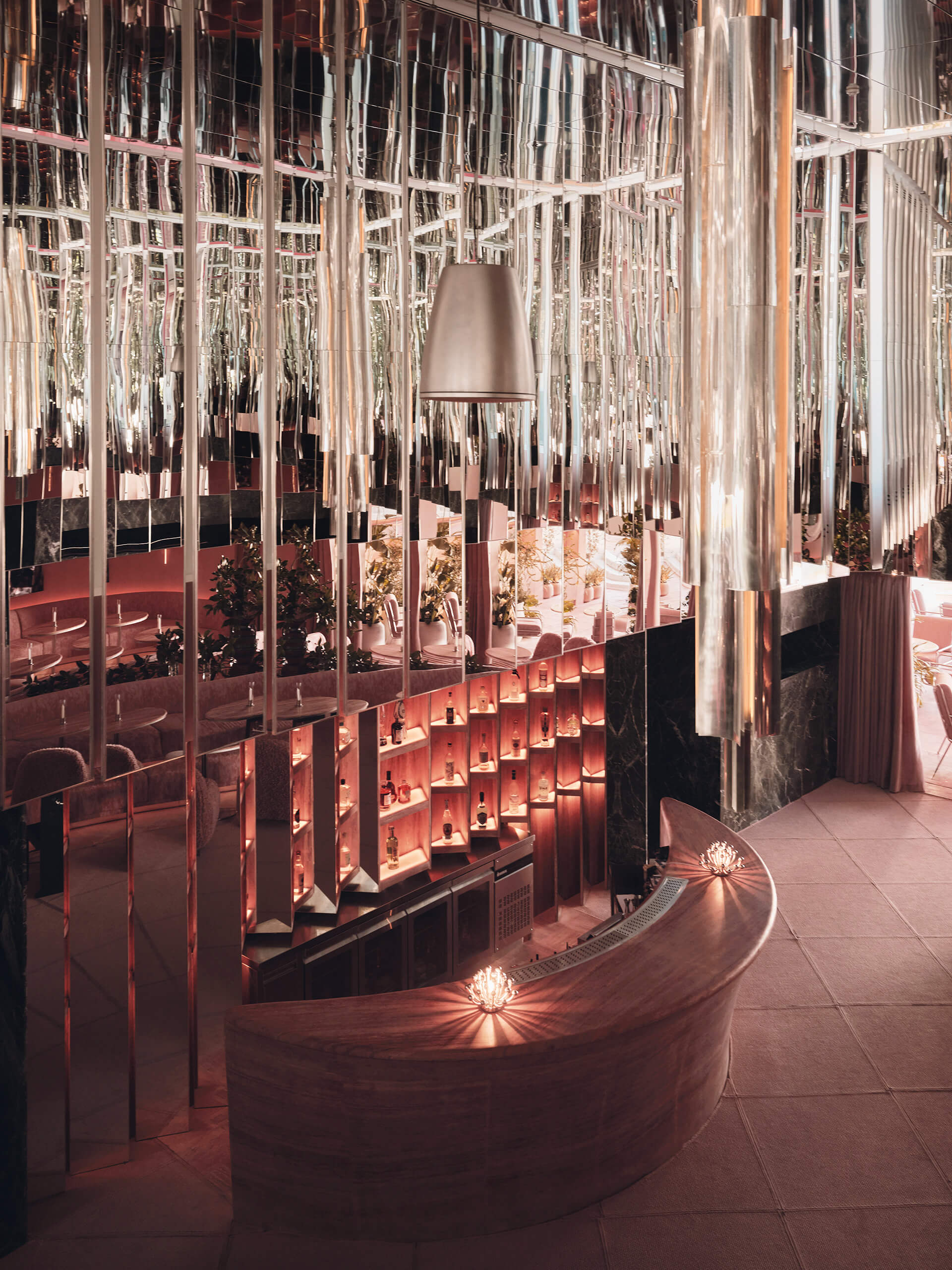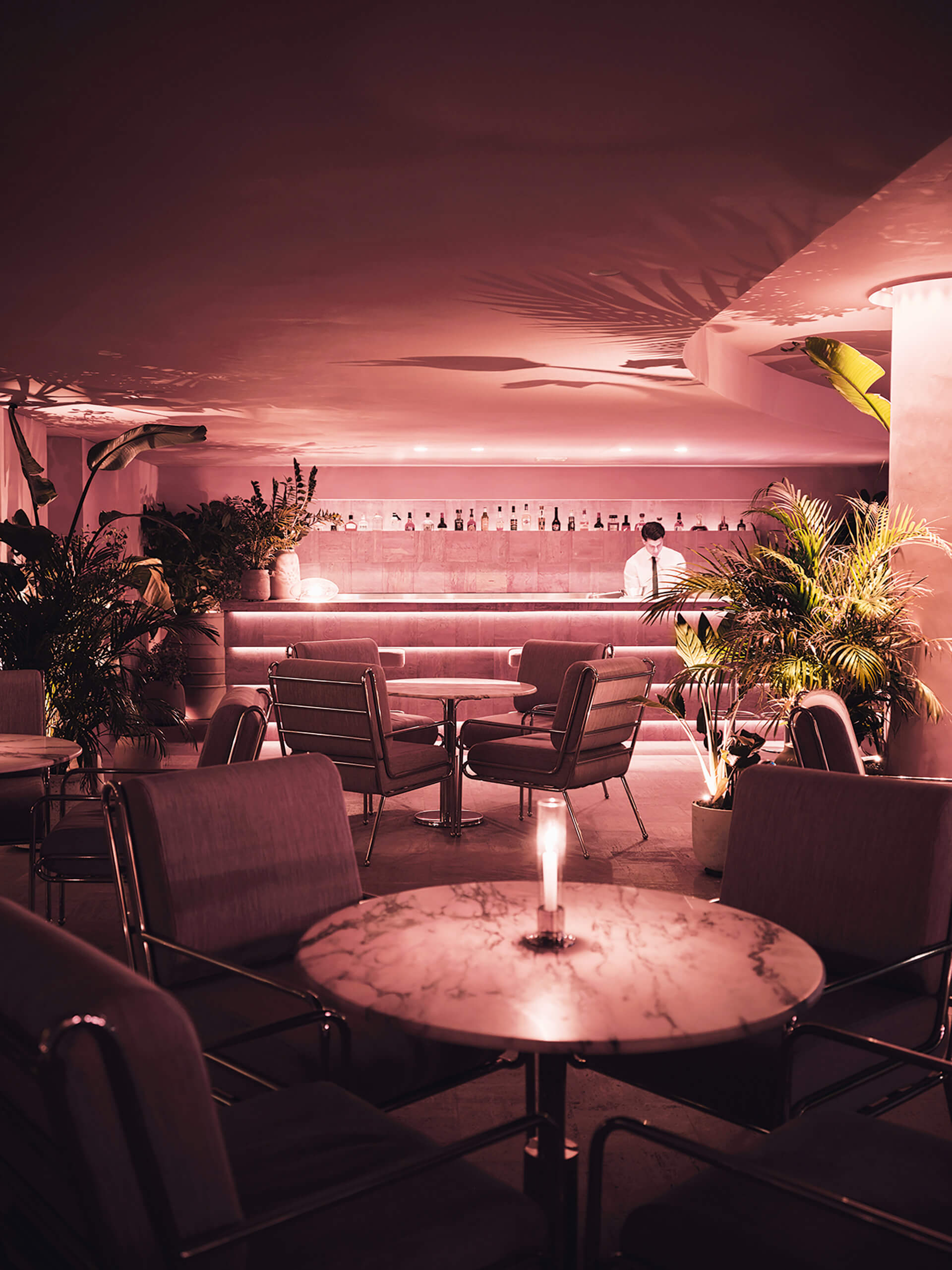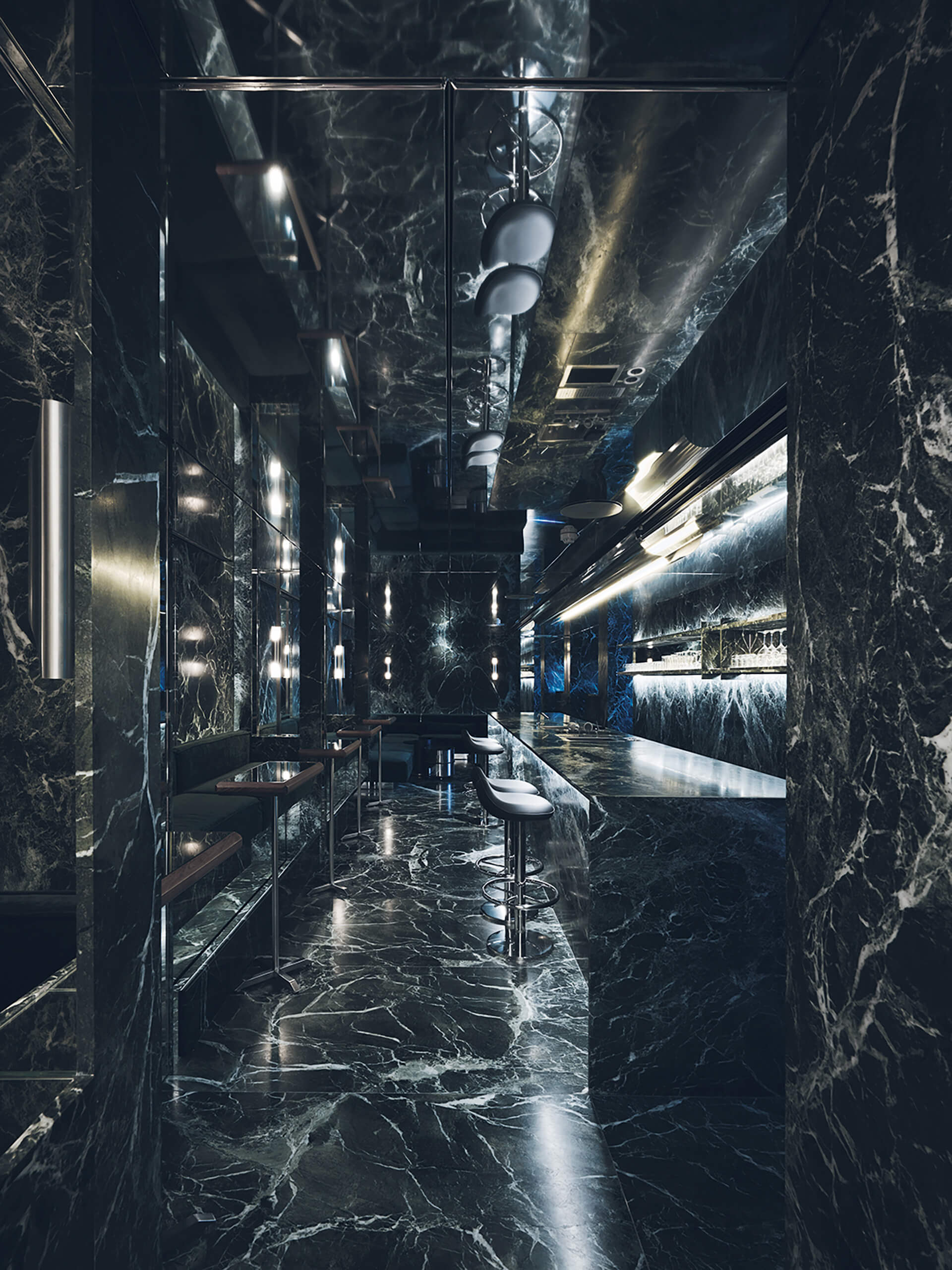 Μία επιβλητικού μεγέθους περιστροφική πόρτα οδηγεί στο Foyer, έναν χώρο υποδοχής σε ροζ απόχρωση με απαλό διάχυτο φωτισμό. Εκεί, δύο επιφάνειες travertino σε συμμετρική διάταξη, πλαισιωμένες από καθρέφτη, αποδίδουν την έννοια της πολυτέλειας μέσα από μια ισχυρή δήλωση, αναδεικνύοντας την ανεκτίμητη αξία του σχεδόν άδειου χώρου. Μία κρυφή πόρτα οδηγεί στο Parlor, έναν πρώτο χώρο bar που επενδύεται ολόκληρος με σκούρο πράσινο μάρμαρο Τήνου. Το συγκεκριμένο πέτρωμα, το οποίο για μεγάλο διάστημα θεωρούνταν ευτελές εξαιτίας των ακανόνιστων αποχρωματισμών του, μετατρέπεται σε banquettes, DJ booth, ράφια και bar, σαν να έχουν βγει όλα από τον ίδιο μονόλιθο. Η επένδυση καθρέφτη στην οροφή διευρύνει τον χώρο, ενώ vintage απλίκες από ανοξείδωτο χάλυβα και ένας custom πολυέλαιος προσφέρουν θερμό, έμμεσο φωτισμό.