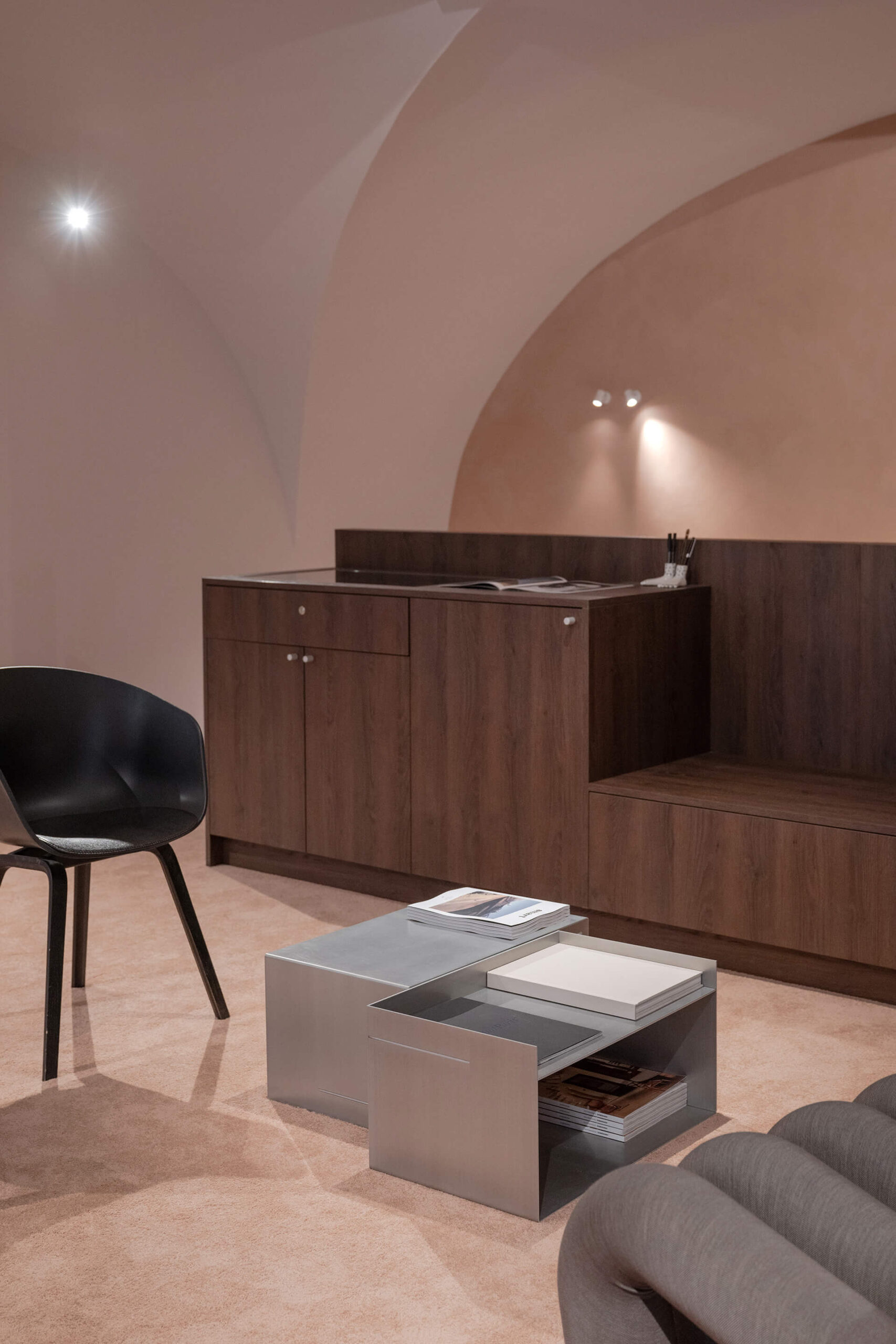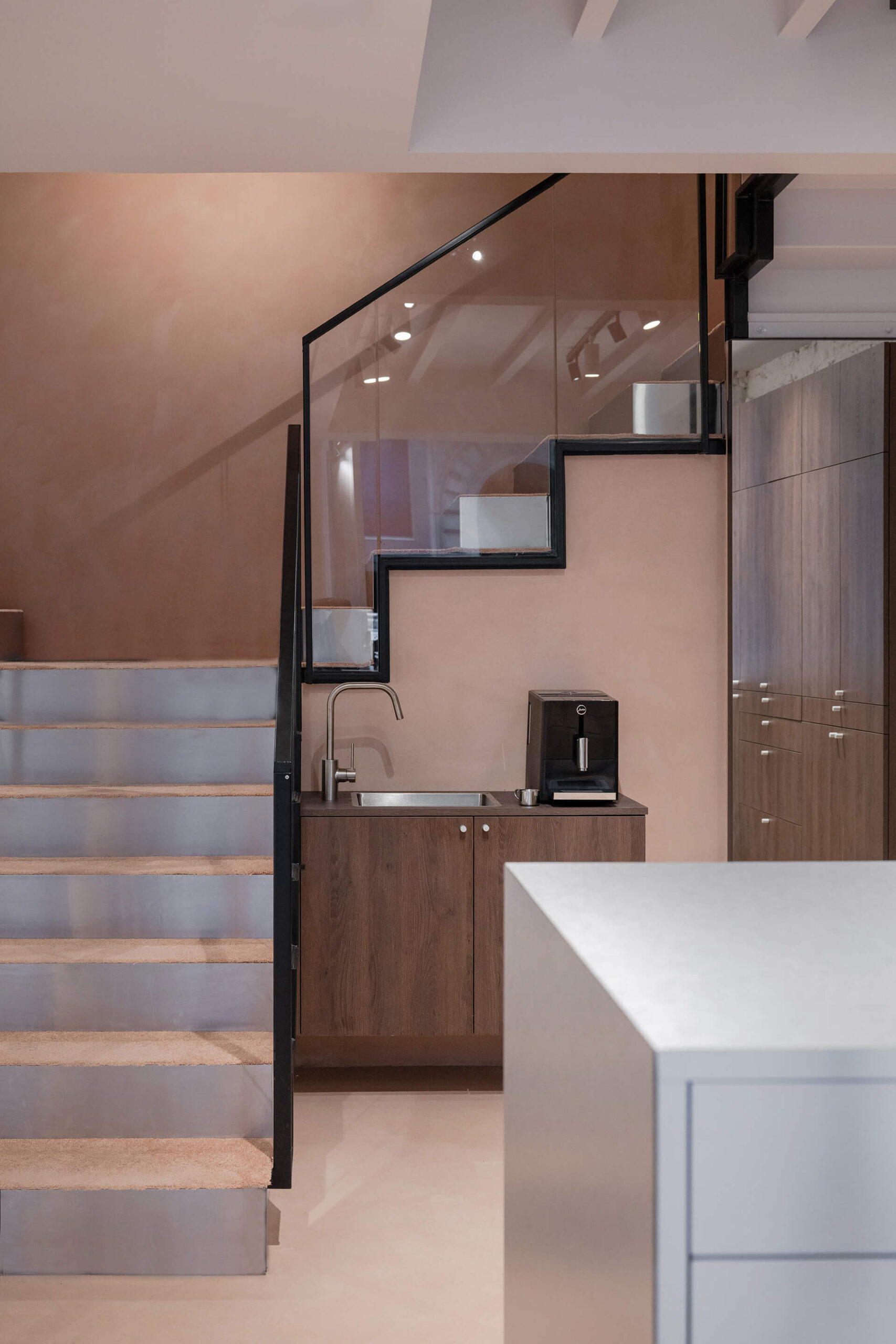 Η πρόταση διαμορφώνει μια σύγχρονη εσωτερική γλώσσα μέσα από μια συγκρατημένη αλλά εκφραστική παλέτα υλικών. Ροζ σκυρόδεμα, σκούρο ξύλο και βουρτσισμένο μέταλλο συνδυάζονται, συγκροτώντας ένα πολυεπίπεδο περιβάλλον που ισορροπεί ανάμεσα στην απτική εμπειρία και τη χωρική συνοχή.