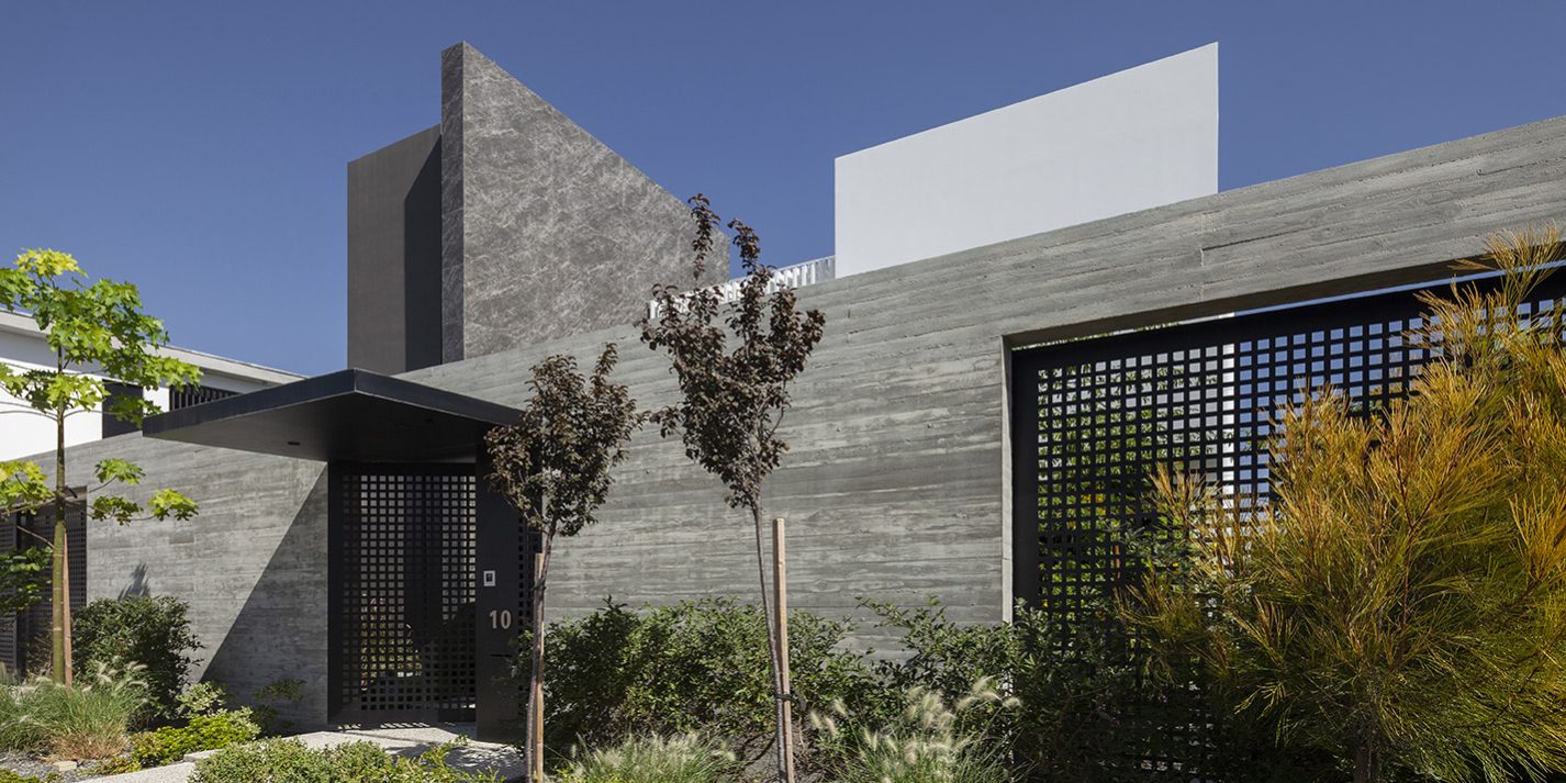 Ο μεγάλος τοίχος από ανεπίχριστο σκυρόδεμα στην πρόσοψη υλοποιεί αυτό ακριβώς το φυσικό όριο που διαχωρίζει το εσωτερικό της κατοικίας από τον δημόσιο χώρο. Σφραγίζει πίσω του την ιδιωτικότητα της κατοικίας, την ίδια στιγμή που τα επιλεκτικά ανοίγματα που γίνονται σε αυτόν προσφέρουν ελεγχόμενες εισόδους, με διαφορετικά επίπεδα ασφάλειας. Η δομή ενός κάστρου επαναδιατυπώνεται εδώ με διαφορετικό λεξιλόγιο, αλλά με το ίδιο αποτέλεσμα. Το γυμνό σανιδωτό μπετόν, ως ένα υλικό απλό, γήινο, με εσωτερική δομή ανάλογη της πέτρας, λειτουργεί προστατευτικά, ενώ ταυτόχρονα ορίζει τη συνολική αισθητική της κατοικίας.