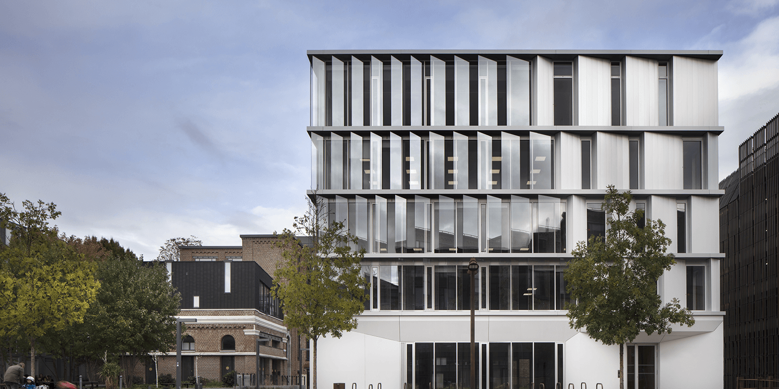 Με αυτά τα δεδομένα, οι αρχιτέκτονες Barbarito Bancel δημιούργησαν μία πρωτότυπη σύνθεση στις όψεις, με κατακόρυφες γυάλινες περσίδες σκίασης πάνω σε μία βάση από μπετόν. Αυτή η φευγαλέα όψη παίζει με τις κατακερματισμένες αντανακλάσεις του περίγυρου, που κυριαρχείται από τούβλα, μπετόν και δέντρα σημύδας, δημιουργώντας προοπτικό βάθος στη διαπερατή καρδιά της τοποθεσίας του έργου. Ο κατακόρυφος προσανατολισμός των γυάλινων περσίδων προστατεύει από τον νότιο ήλιο και ανοίγει τις θέες από το εσωτερικό. Για τις κύριες όψεις -νοτιοδυτική και βορειοδυτική- εφαρμόζεται διπλή επιδερμίδα (double skin), δημιουργώντας ένα φυσικά διάφανο, φωτεινό τοιχοπέτασμα το οποίο ταυτόχρονα προστατεύει από τον ήλιο. Οι δευτερεύουσες όψεις, νοτιοανατολική και βορειοανατολική, αποτελούνται από ενότητες τοίχου και εναλλασσόμενες επιφάνειες από αδιαφανές γυαλισμένο αλουμίνιο και γυαλί που ακολουθούν την κυρίαρχη γεωμετρία των διαγώνιων γυάλινων σκιάστρων, επεκτείνοντας και προοδευτικά αλλάζοντας τον ρυθμό τους. Στο τελείωμά του, ο όγκος συμπληρώνεται με έναν πιο λεπτό όροφο, που δίνει την κορυφογραμμή.